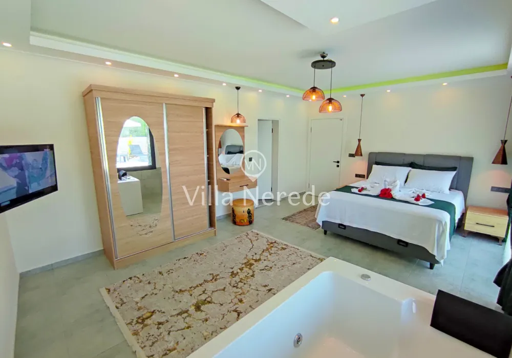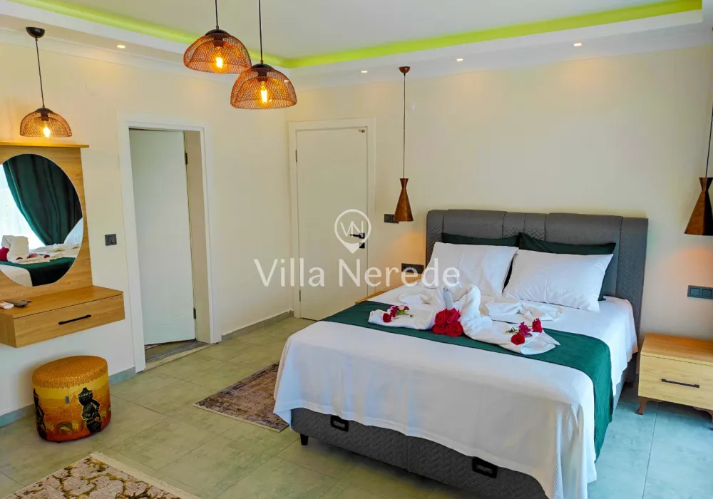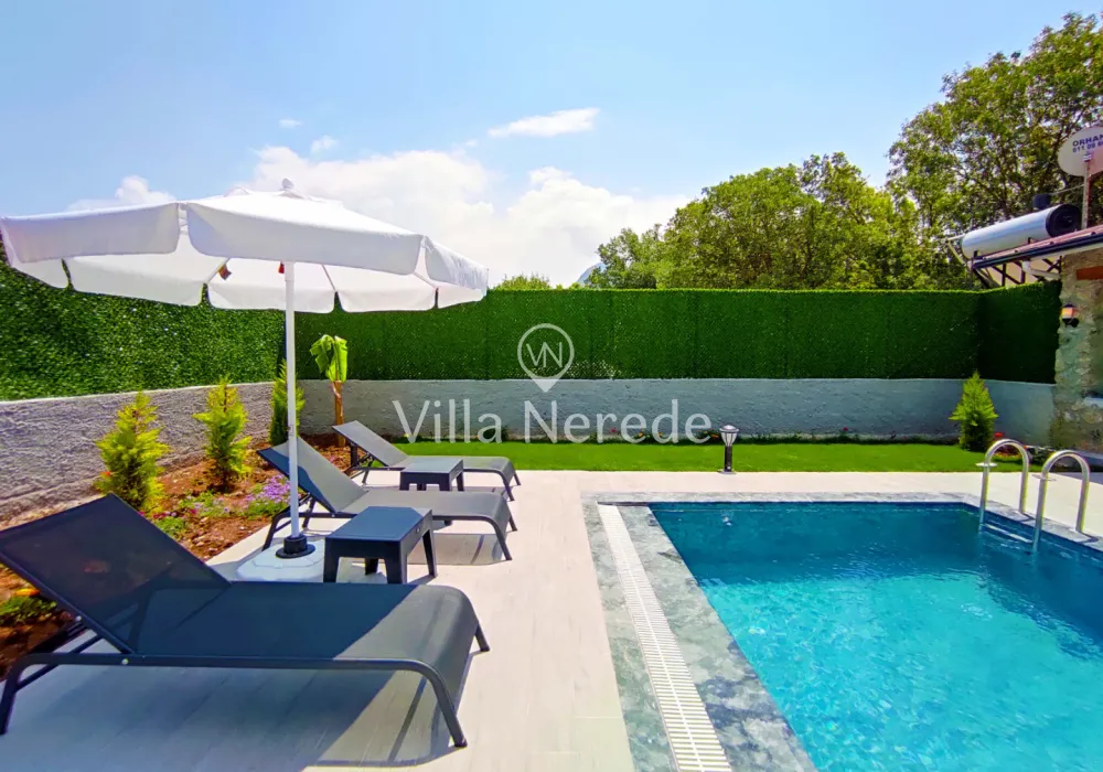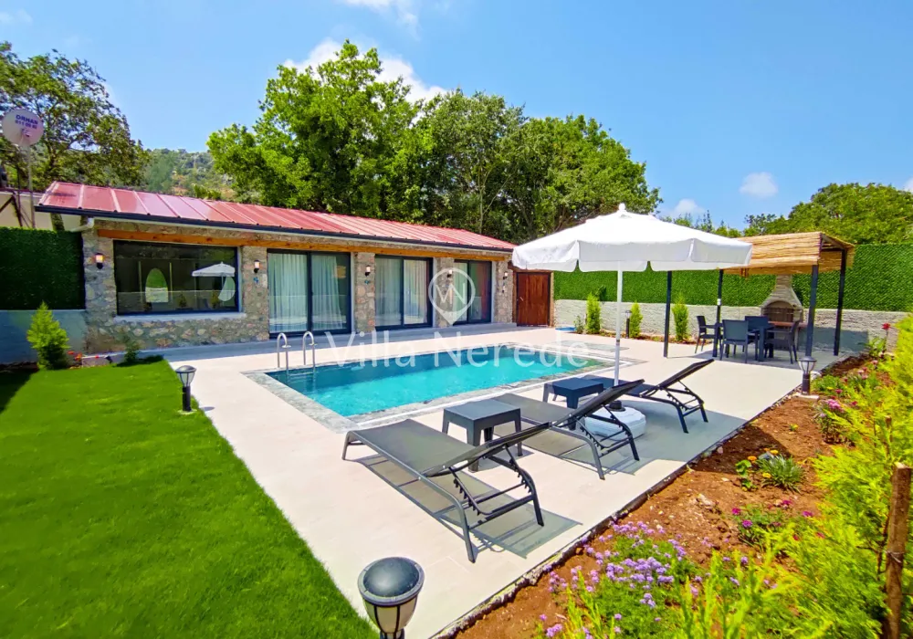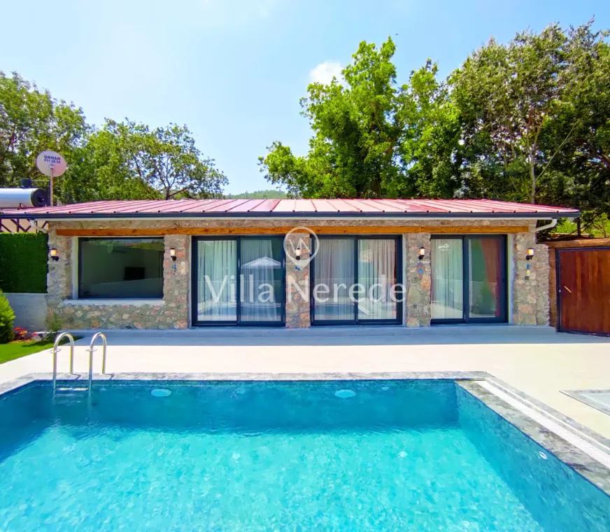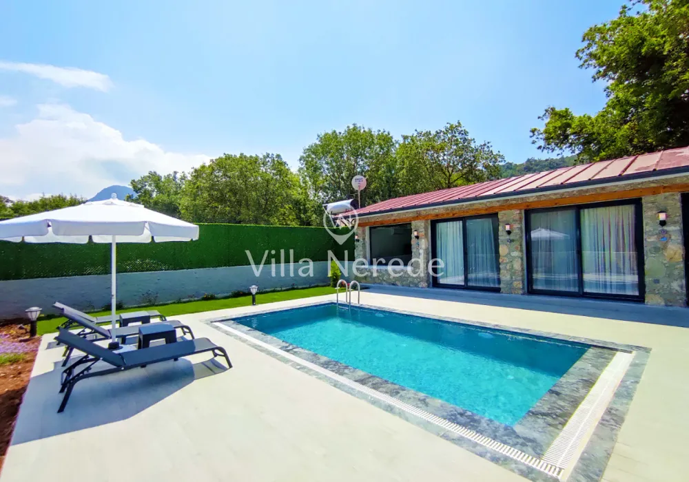 Çam ağaçlarıyla çevrelenmiş, Kayaköy'ün eşsiz doğasına sırtını yaslamış; doğa içinde dingin konumu ve yemyeşil geniş bahçesiyle sakin ve huzurlu bir tatil arayan misafirlerimiz için oldukça uygun olan villa, sizlere Kayaköy'ün büyülü tarihinde kısa bir mola vaadetmektedir. Bu bağlamdan esinlenerek dizayn edilmiş bahçe alanı ve geniş havuz terasına sahiptir; yine havuz terasında kapasiteye uygun şezlong takımı, konforlu oturma grubu ve barbekü bulunmaktadır. Konforunuz gözetilerek tasarlanmış olan muhafazakar havuz alanına açılan ferah oturma odası, tam donanımlı açık mutfak; yatak odasında çift kişilik yatak,eveyn banyosu, jakuzi ve hamam bulunmaktadır. Villa, ihtiyaçlarınıza karşılık verecek donanıma sahiptir.