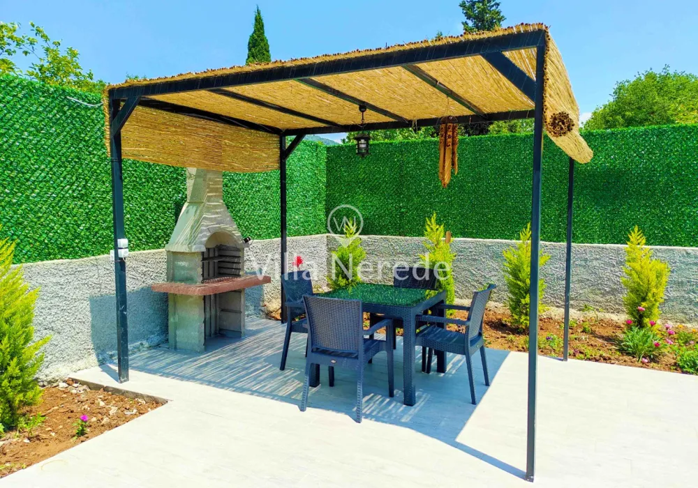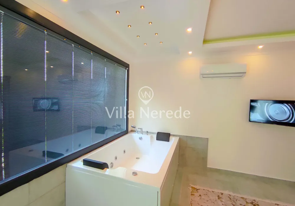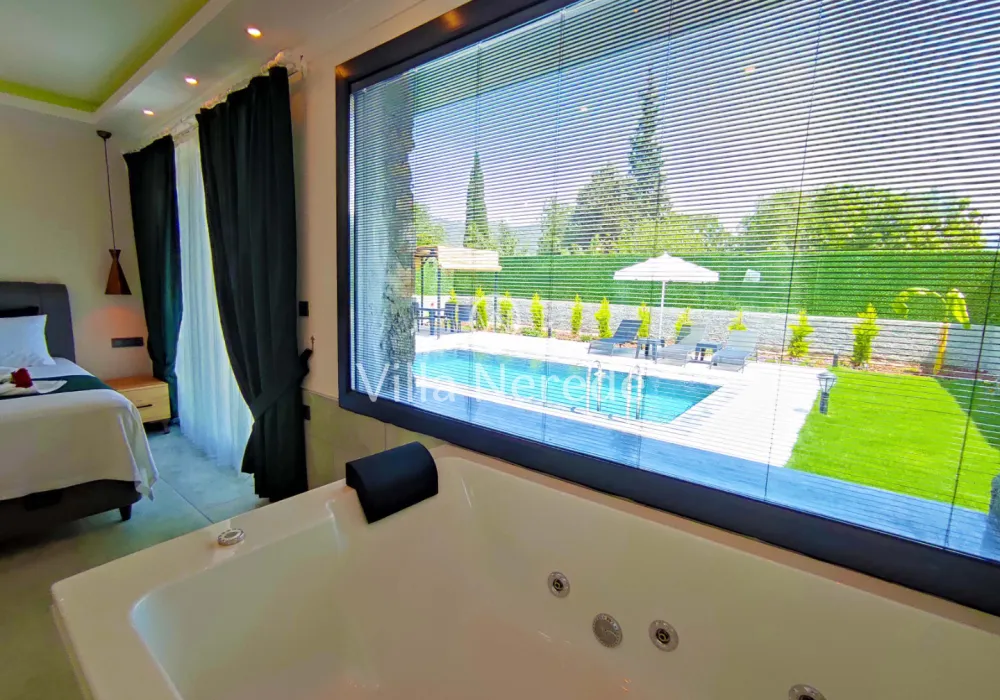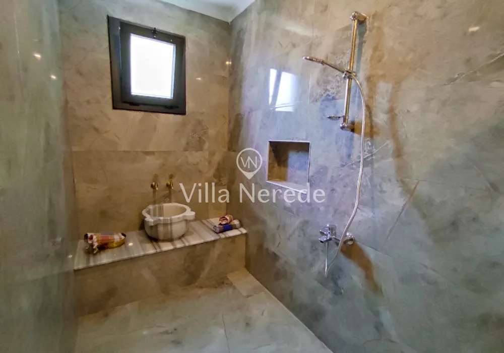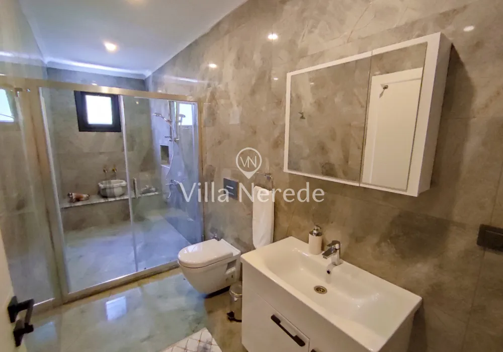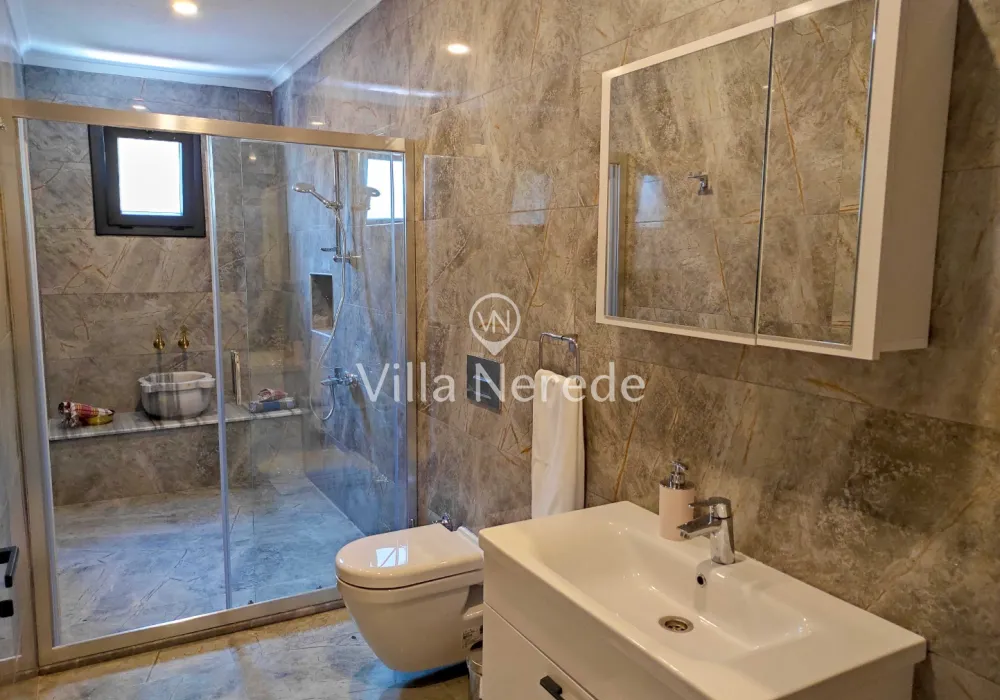 Çam ağaçlarıyla çevrelenmiş, Kayaköy'ün eşsiz doğasına sırtını yaslamış; doğa içinde dingin konumu ve yemyeşil geniş bahçesiyle sakin ve huzurlu bir tatil arayan misafirlerimiz için oldukça uygun olan villa, sizlere Kayaköy'ün büyülü tarihinde kısa bir mola vaadetmektedir. Bu bağlamdan esinlenerek dizayn edilmiş bahçe alanı ve geniş havuz terasına sahiptir; yine havuz terasında kapasiteye uygun şezlong takımı, konforlu oturma grubu ve barbekü bulunmaktadır. Konforunuz gözetilerek tasarlanmış olan muhafazakar havuz alanına açılan ferah oturma odası, tam donanımlı açık mutfak; yatak odasında çift kişilik yatak,eveyn banyosu, jakuzi ve hamam bulunmaktadır. Villa, ihtiyaçlarınıza karşılık verecek donanıma sahiptir.