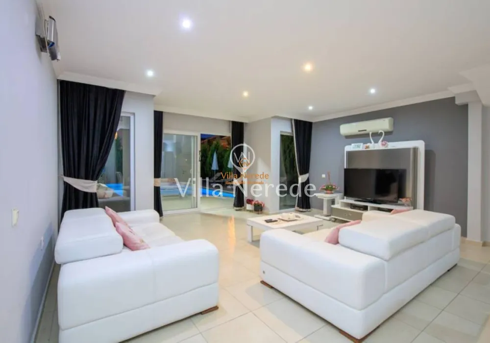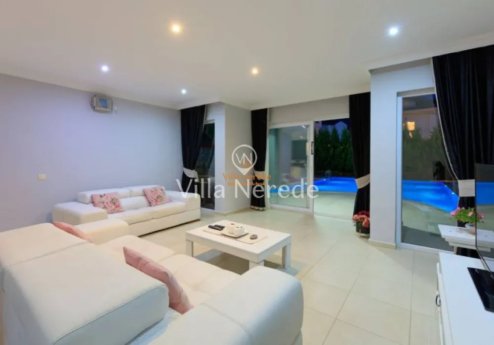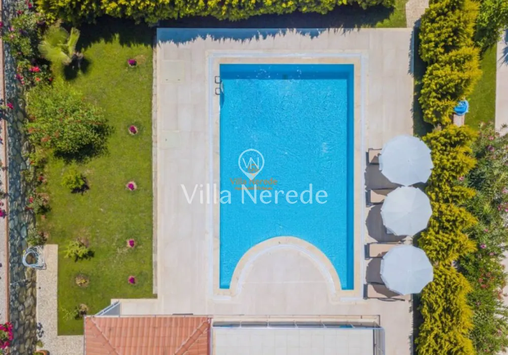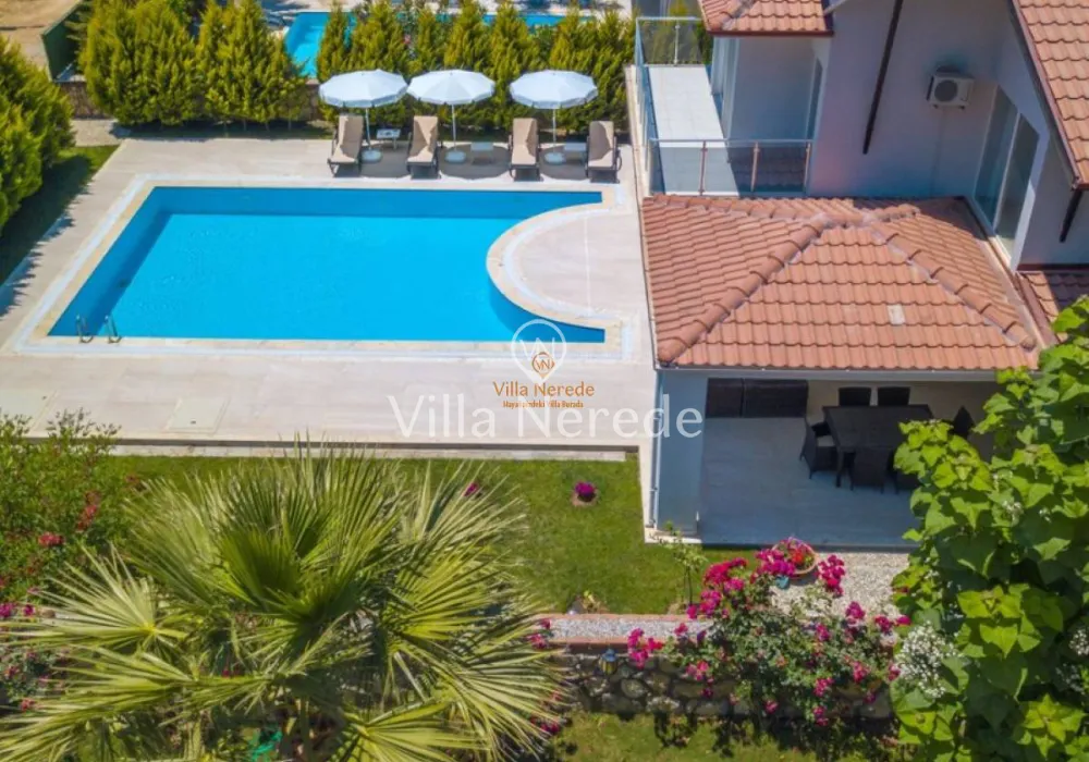 Geniş havuz terasında kapasiteye uygun şezlong takımı, oturma grubu, salıncak ve barbekü alanı bulunan villada, rahat bir tatil için her detay düşünülmüştür. Yine havuz terasına açılan konforlu oturma odası ve tam donanımlı açık mutfağı; üç yatak odasında çift kişilik yatak, dördüncü yatak odasında ise iki tek kişilik yatak,bulunmaktadır.