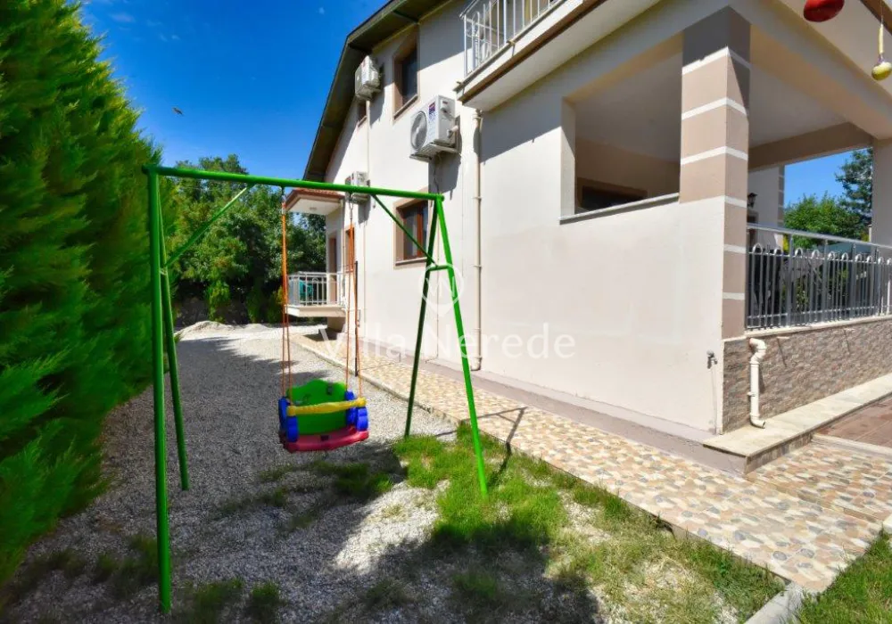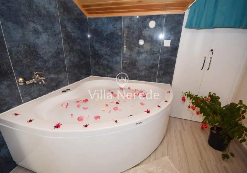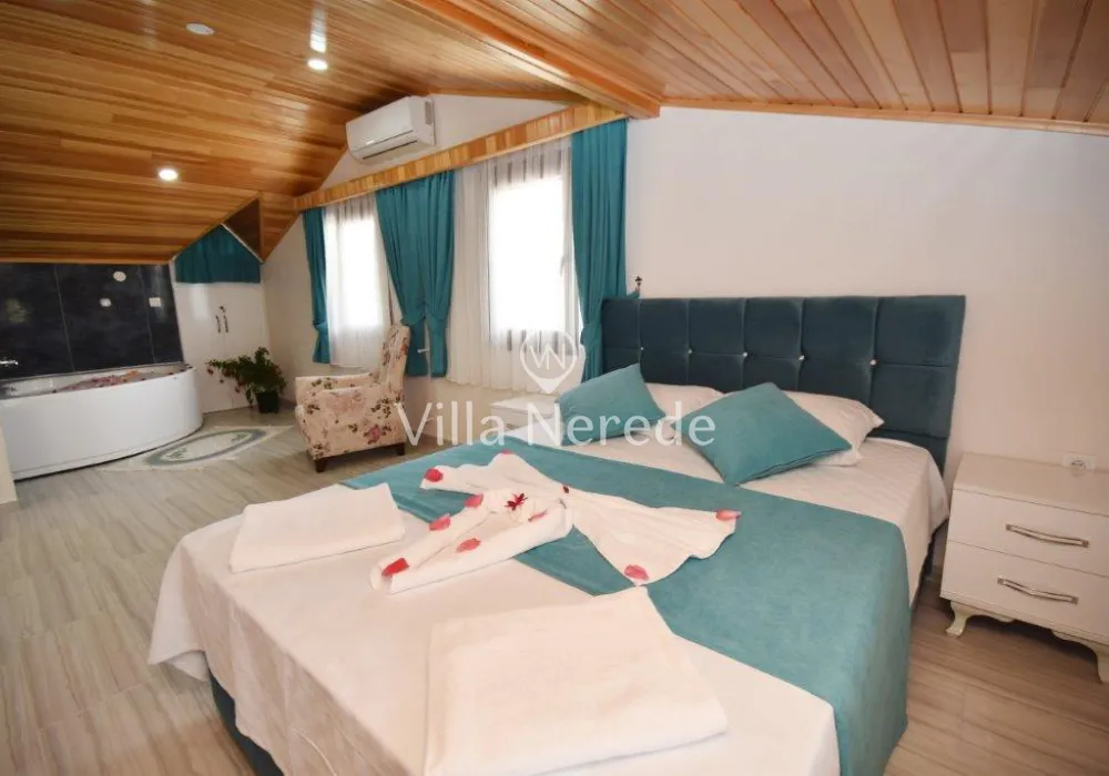 Çam ağaçlarıyla çevrelenmiş, Kayaköy'ün eşsiz doğasına sırtını yaslamış; doğa içinde dingin konumu ve yemyeşil geniş bahçesiyle sakin ve huzurlu bir tatil arayan misafirlerimiz için oldukça uygun olan villa, sizlere Kayaköy'ün büyülü tarihinde kısa bir mola vaadetmektedir. Bu bağlamdan esinlenerek dizayn edilmiş bahçe alanı geniş havuz terası ve çocuk havuzuna sahiptir; yine havuz terasında kapasiteye uygun şezlong takımı, konforlu oturma grubu, salıncak ve barbekü bulunmaktadır. Konforunuz gözetilerek tasarlanmış olan muhafazakar havuz alanına açılan ferah oturma odası, tam donanımlı açık mutfak; birinci yatak odasında çift kişilik yatak, ebeveyn banyosu ve jakuzi; ikinci yatak odasında çift kişilik yatak ve ebeveyn banyosu; üçüncü yatak odasında iki tek kişilik yatak ;dördüncü yatak odasında ise bir adet tek kişilik yatak bulunmaktadır. Villa, ihtiyaçlarınıza karşılık verecek donanıma sahiptir.
