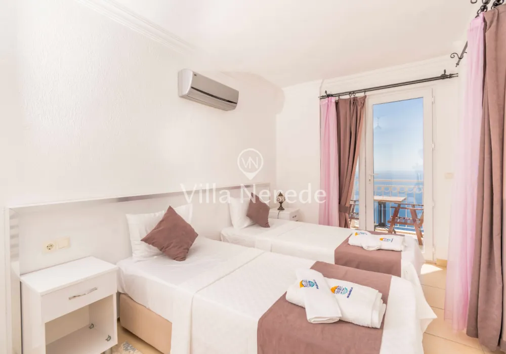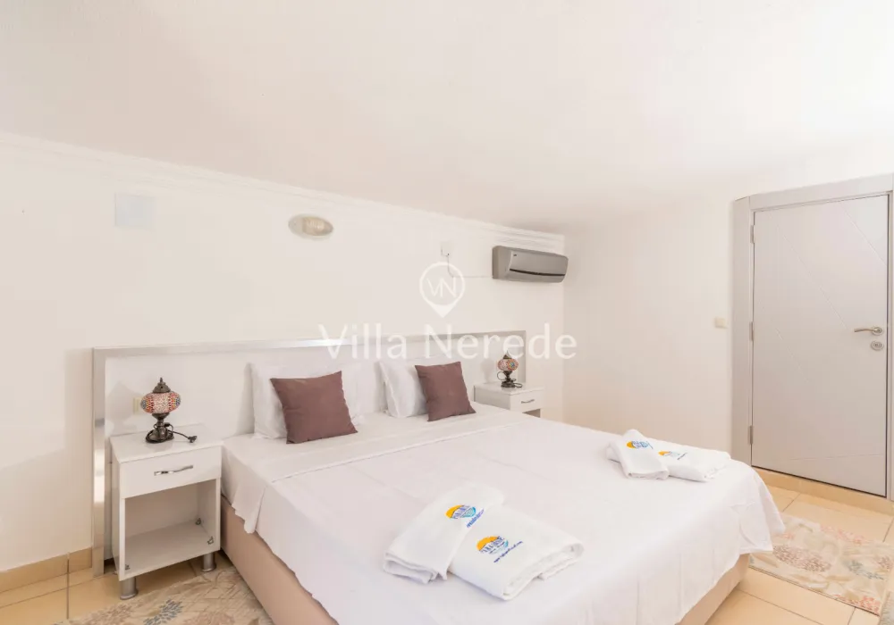 Çocuk havuzu ve eşsiz bir deniz manzarasına sahip olan villada kapasiteye uygun oturma alanı,, şezlong takımı, masa tenisi ve barbekü alanı; havuz terasına açılan konforlu oturma odası, ihtiyaçlarınızı karşılayacak donanıma sahip mutfağı mevcuttur.Özenle dekore edilmiş detayları sizleri memnun edecek, sevdiklerinizle ayrıcalıklı bir tatilin keyfini sürebileceksiniz.İki yatak odasında çift kişilik yatak ve ebeveyn banyosu;iki yatak odasında ise iki tek kişilik yatak ve ebeveyn banyosu bulunmaktadır.