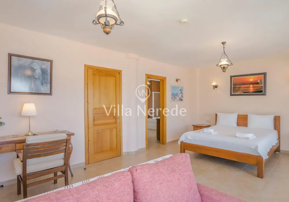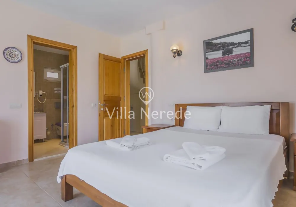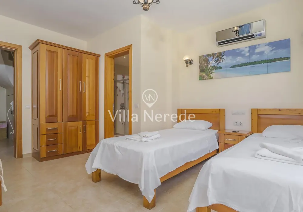 Eşsiz bir deniz manzarası ve bahçe alanına sahip villada kapasiteye uygun oturma alanı, şezlong takımı, salıncak ve barbekü alanı; havuz terasına açılan konforlu oturma odası, ihtiyaçlarınızı karşılayacak donanıma sahip mutfağı mevcuttur.Özenle dekore edilmiş detayları sizleri memnun edecek, sevdiklerinizle ayrıcalıklı bir tatilin keyfini sürebileceksiniz.Birinci yatak odasında çift kişilik yatak ,ebeveyn banyosu ve jakuzi ; iki yatak odasında ise iki adet tek kişilik yatak ve ebeveyn banyosu; dördüncü yatak odasında çift kişilik yatak ve ebeveyn banyosu bulunmaktadır.