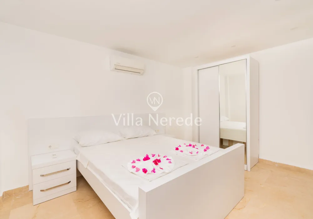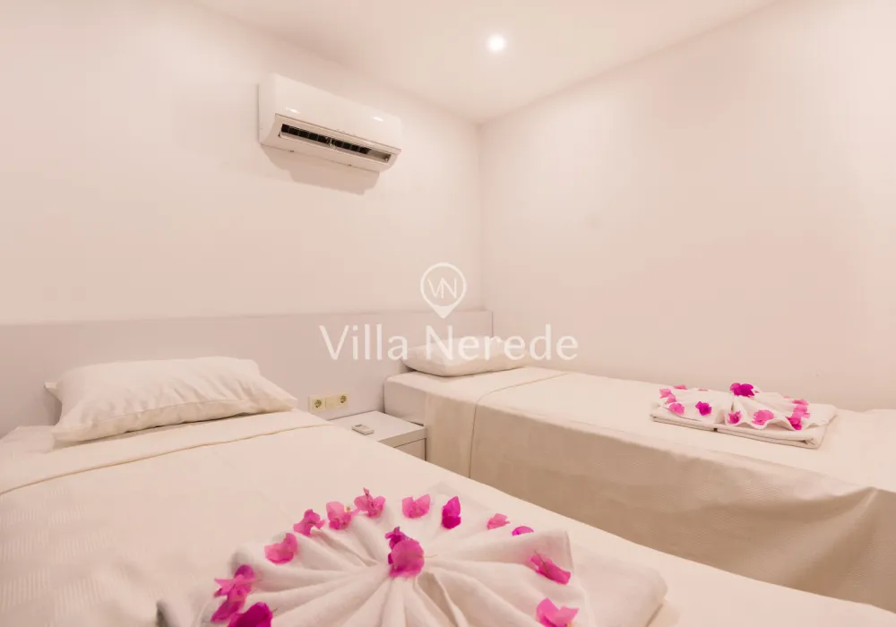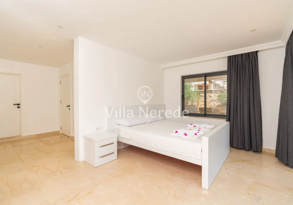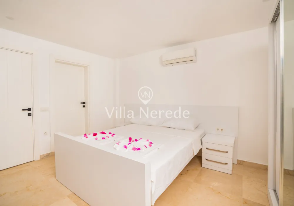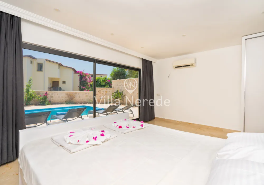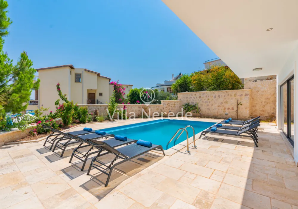Muhteşem manzaraya karşı, güneşlenip yüzebileceğiniz havuz terasında kapasiteye uygun şezlong takımı, oturma grubu ve barbekü alanı bulunan villa lüks ve donanımı bir arada sunmaktadır. Yine havuz terasına açılan konforlu oturma odası ve tam donanımlı açık mutfağı; Üç yatak odasında çift kişilik yatak, ebeveyn banyosu; dördüncü yatak odasında ise tek kişilik iki adet yatak bulunmaktadır.