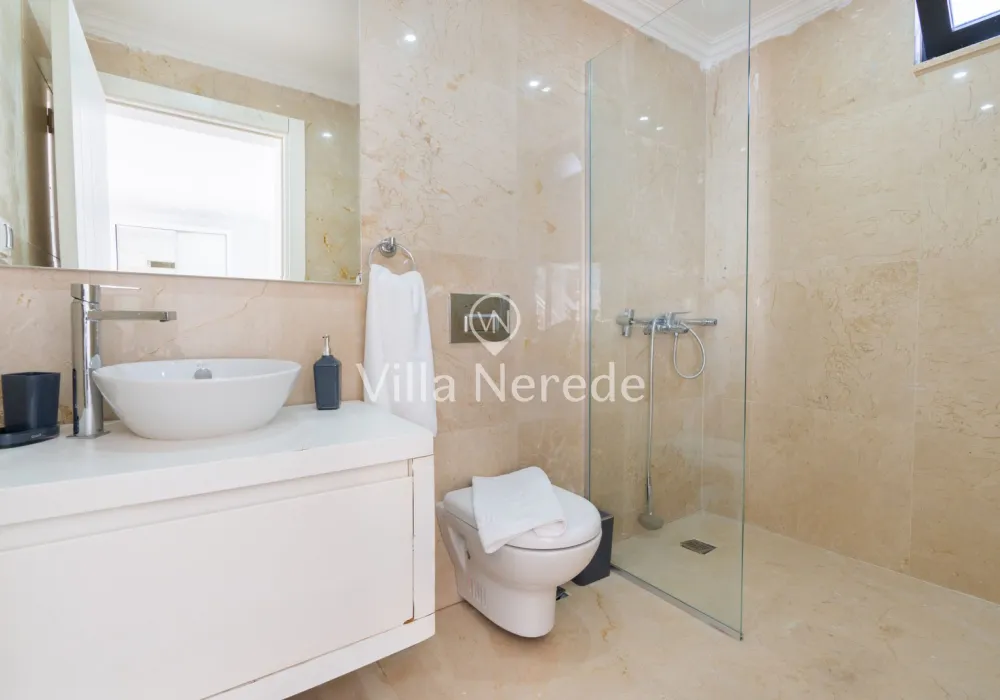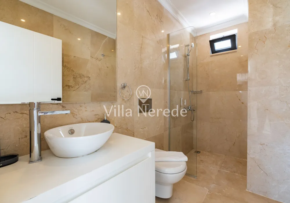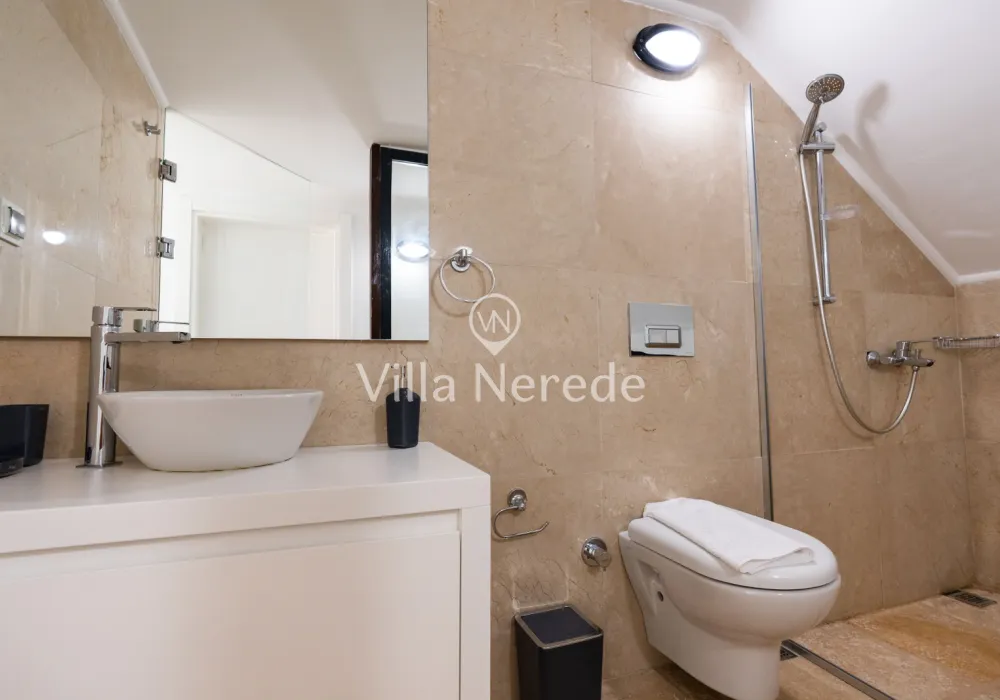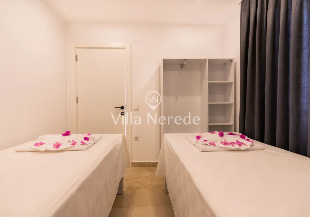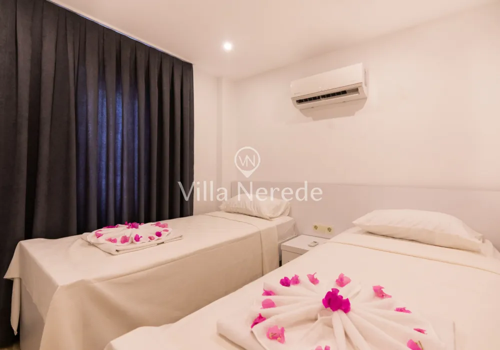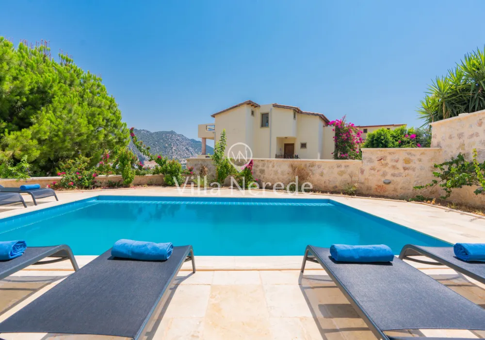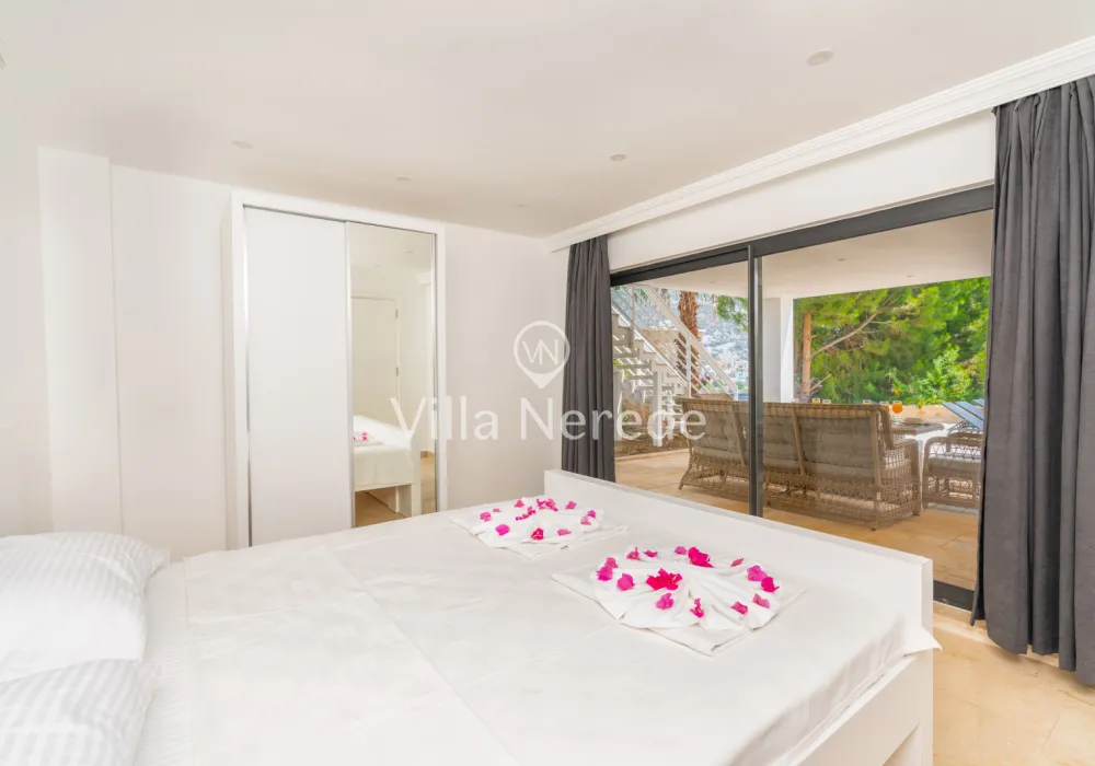 Muhteşem manzaraya karşı, güneşlenip yüzebileceğiniz havuz terasında kapasiteye uygun şezlong takımı, oturma grubu ve barbekü alanı bulunan villa lüks ve donanımı bir arada sunmaktadır. Yine havuz terasına açılan konforlu oturma odası ve tam donanımlı açık mutfağı; Üç yatak odasında çift kişilik yatak, ebeveyn banyosu; dördüncü yatak odasında ise tek kişilik iki adet yatak bulunmaktadır.