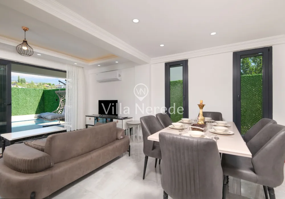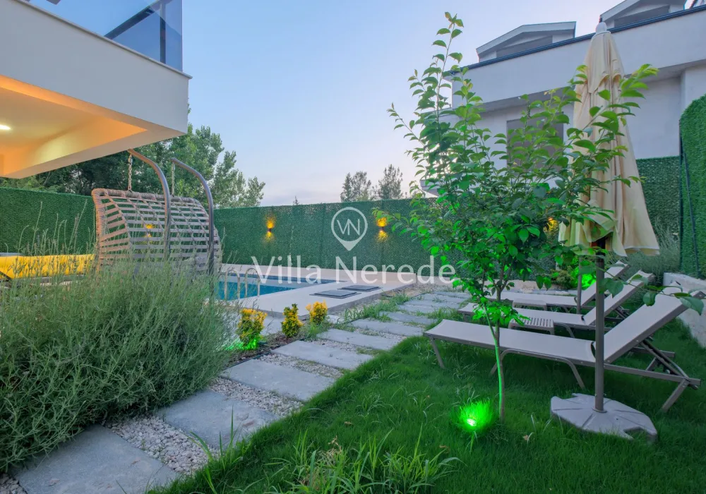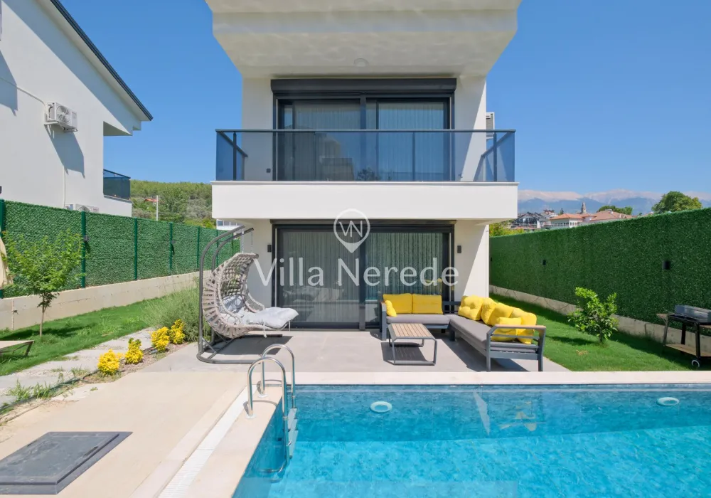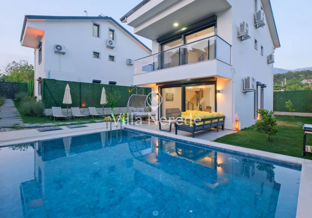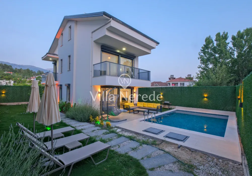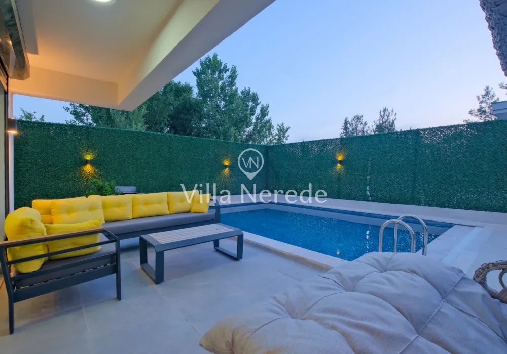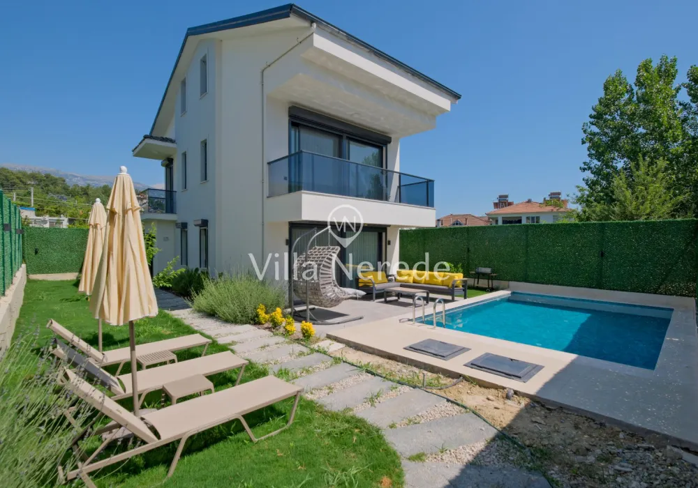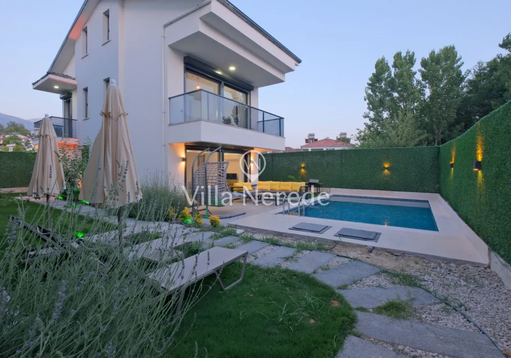 Doğa içinde, huzurlu bir konumu olan villanın geniş havuz bahçe alanında kapasiteye uygun şezlong takımı, oturma grubu,barbekü alanı; havuz terasına açılan oturma odası, tam donanımlı açık mutfağı bulunmaktadır. Birinci yatak odasında çift kişilik yatak, ebeveyn banyosu,ve jakuzidiğer iki yatak odasında ise çift kişilik yatak ve ebeveyn banyo bulunmaktadır.