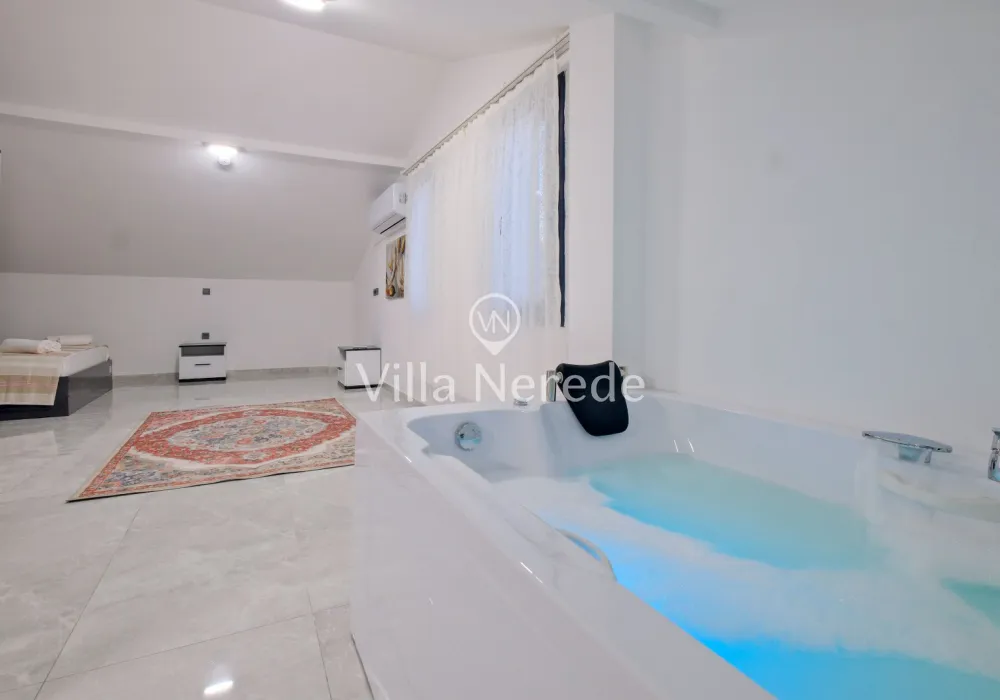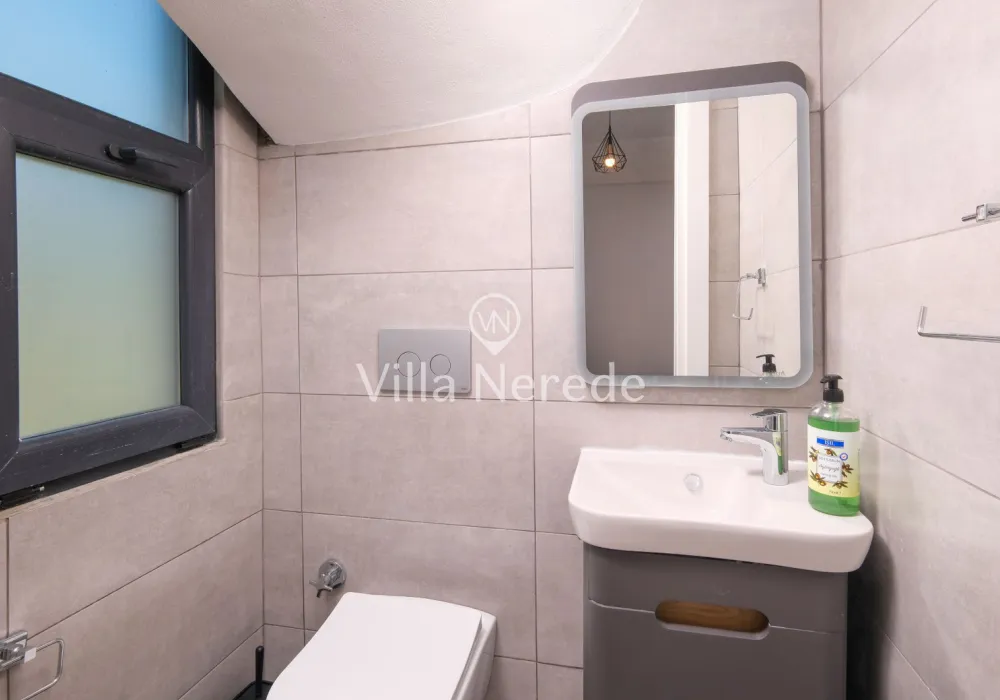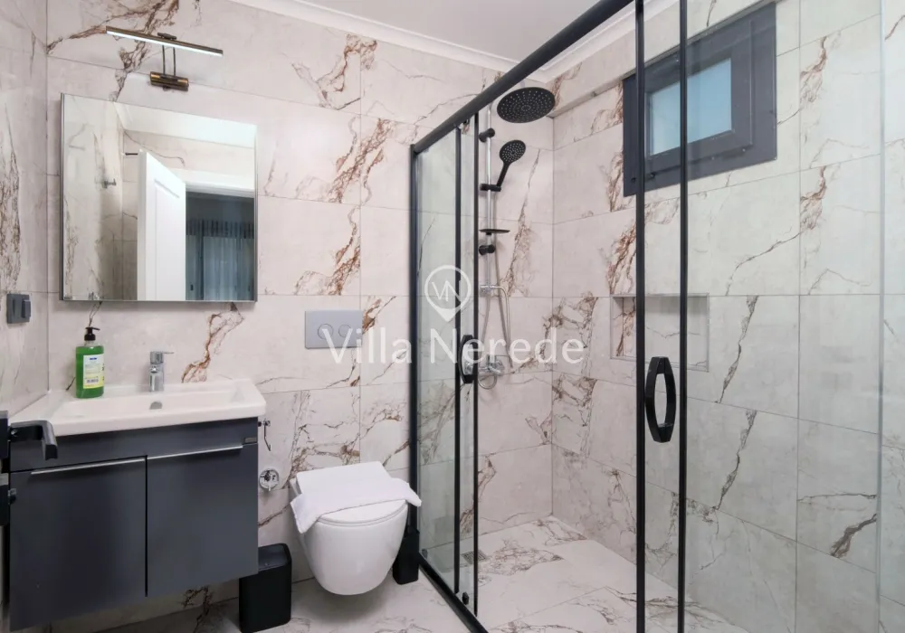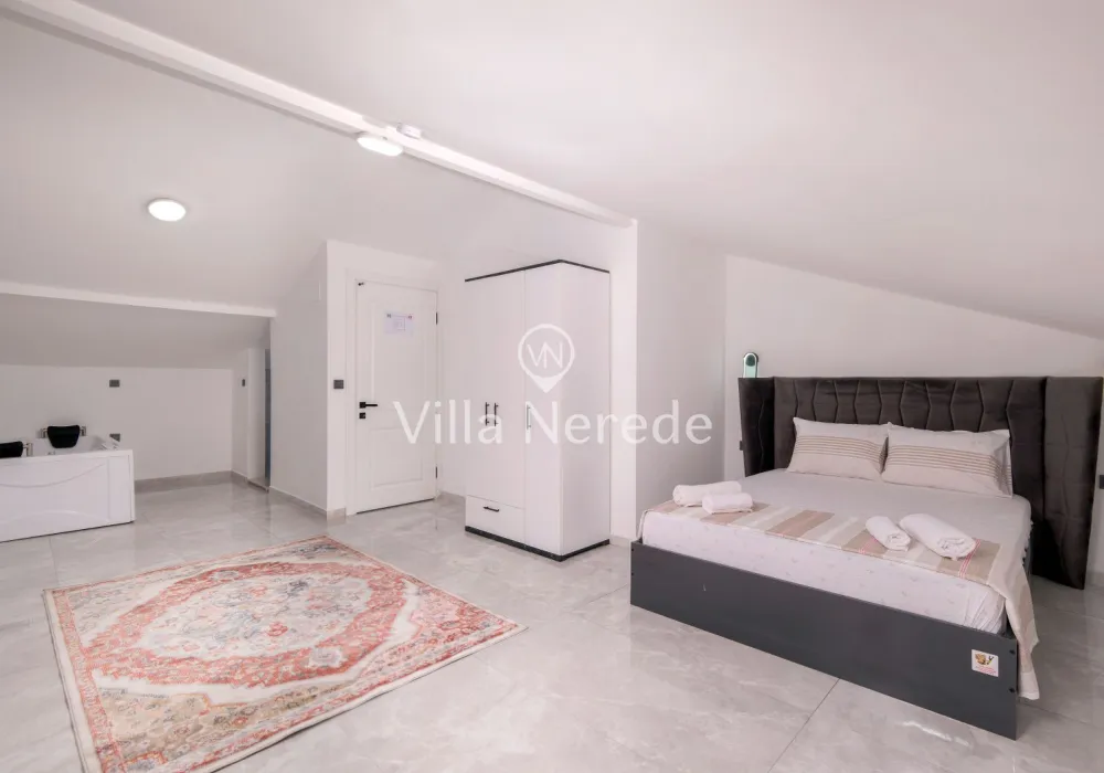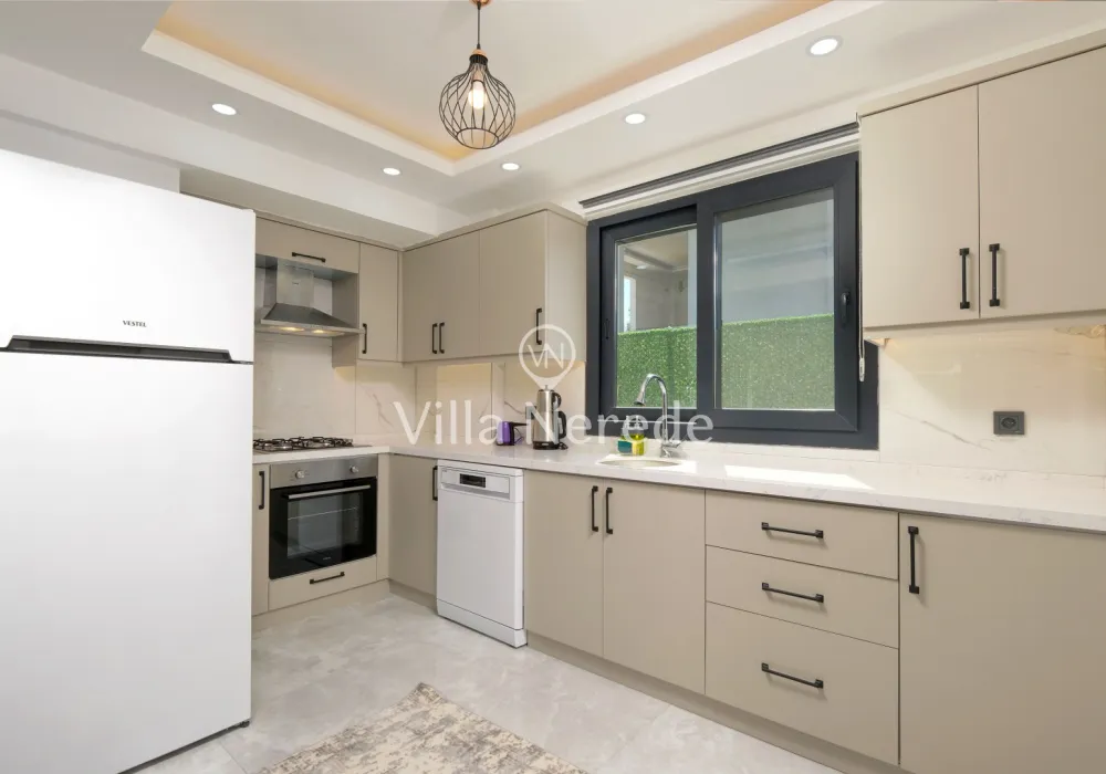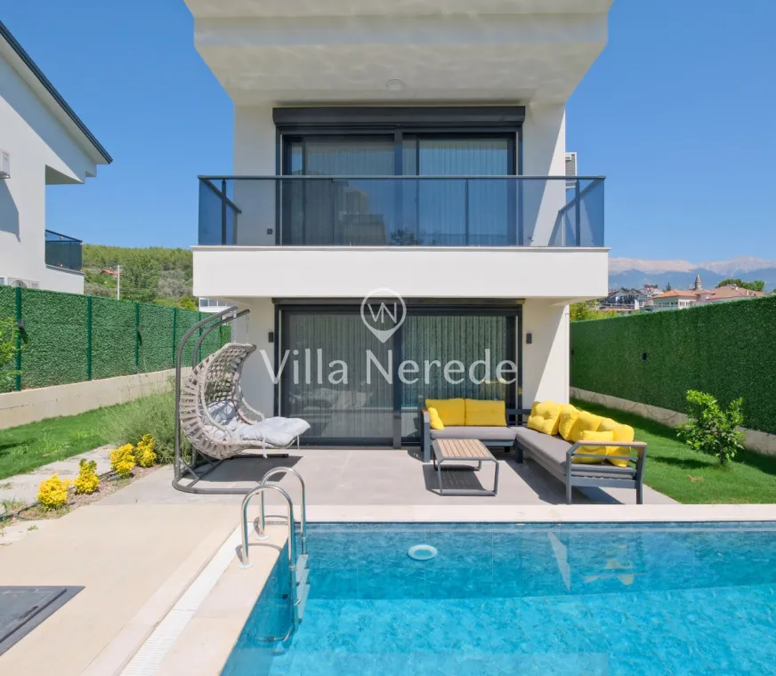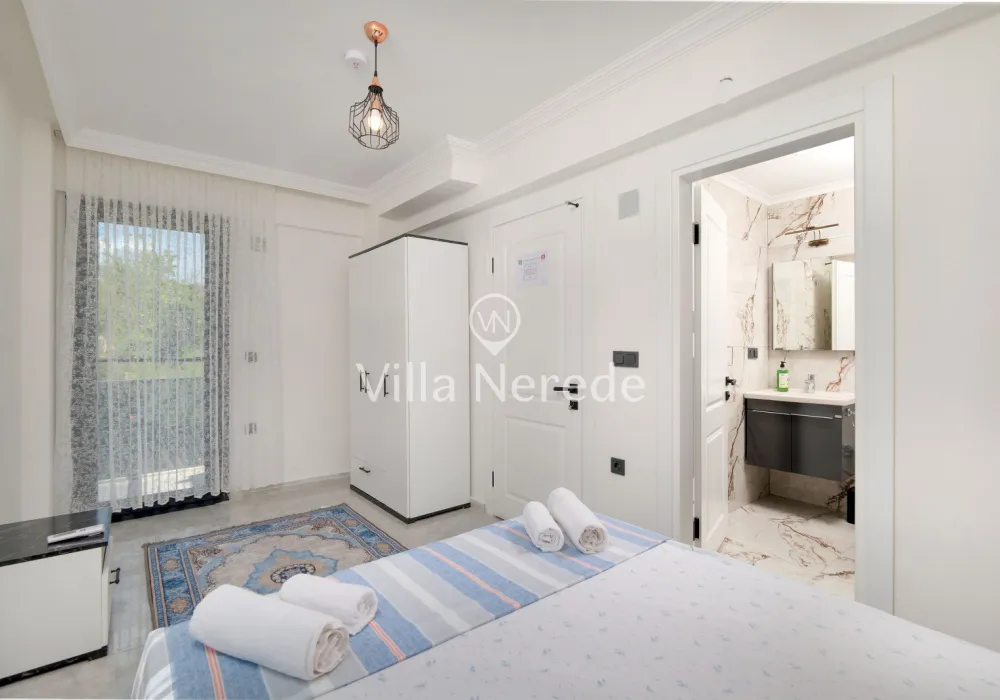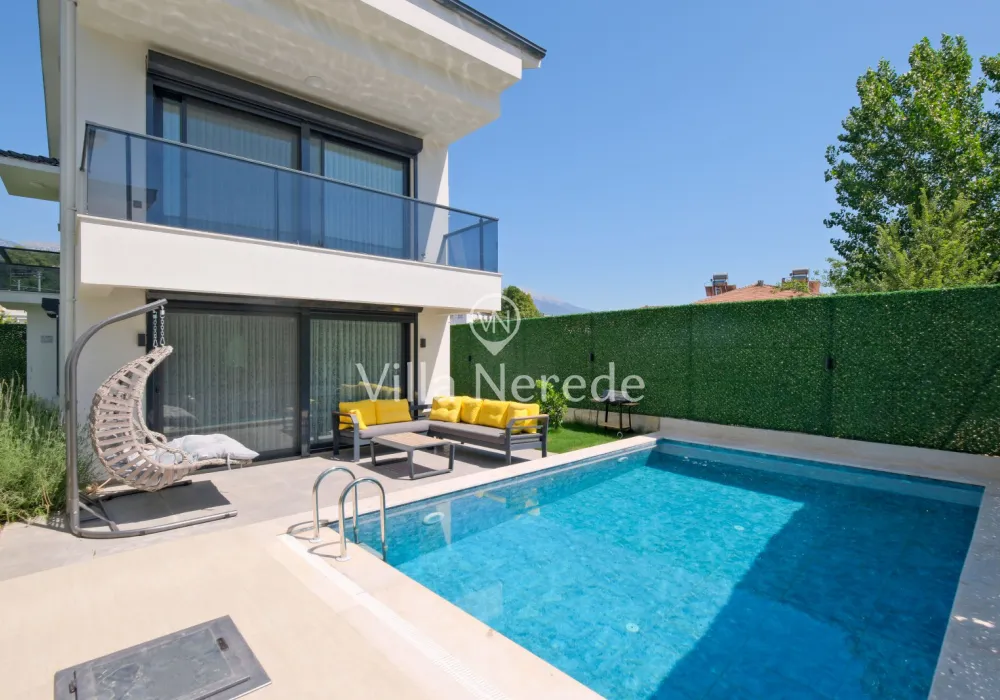 Doğa içinde, huzurlu bir konumu olan villanın geniş havuz bahçe alanında kapasiteye uygun şezlong takımı, oturma grubu,barbekü alanı; havuz terasına açılan oturma odası, tam donanımlı açık mutfağı bulunmaktadır. Birinci yatak odasında çift kişilik yatak, ebeveyn banyosu,ve jakuzidiğer iki yatak odasında ise çift kişilik yatak ve ebeveyn banyo bulunmaktadır.
