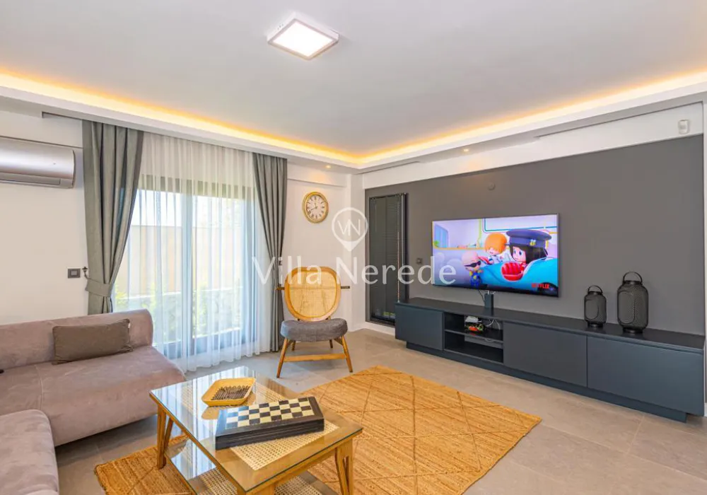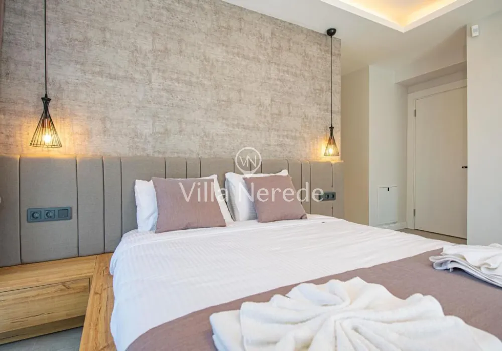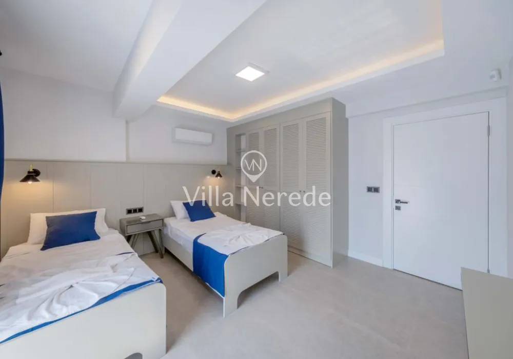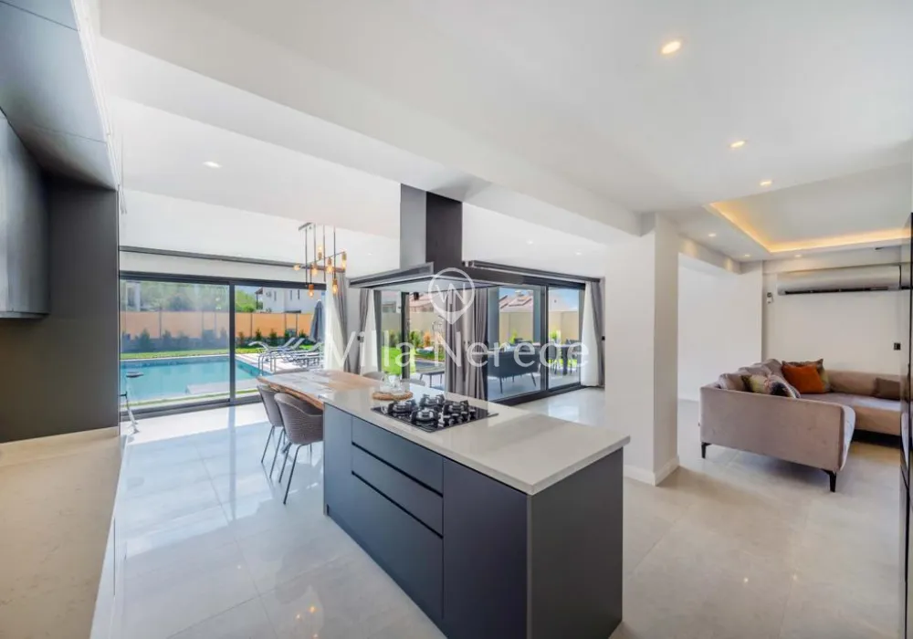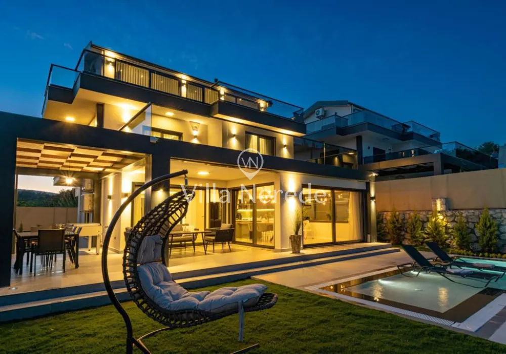 Geniş ve yeşil bahçe alanına sahip villada kapasiteye uygun oturma alanı, şezlong takımı, salıncak ve barbekü alanı; havuz terasına açılan konforlu oturma odası, ihtiyaçlarınızı karşılayacak donanıma sahip mutfağı mevcuttur.Özenle dekore edilmiş detayları sizleri memnun edecek, sevdiklerinizle ayrıcalıklı bir tatilin keyfini sürebileceksiniz.Birinci yatak odasında çift kişilik yatak ,ebeveyn banyosu ve jakuzi ;ikinci yatak odasında ise iki tek kişilik yatak ve ebeveyn banyosu ;üçüncü yatak odasında ise çiftk kişilik yatak ve ebeveyn banyosu bulunmaktadır.