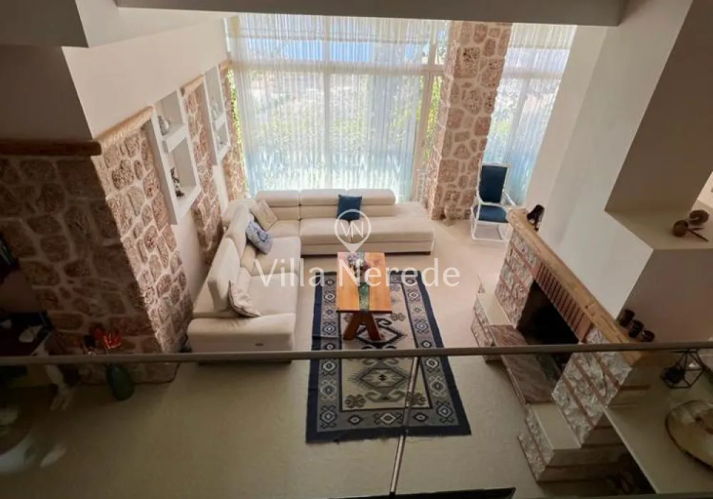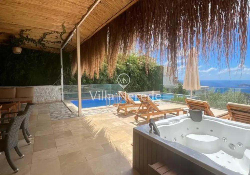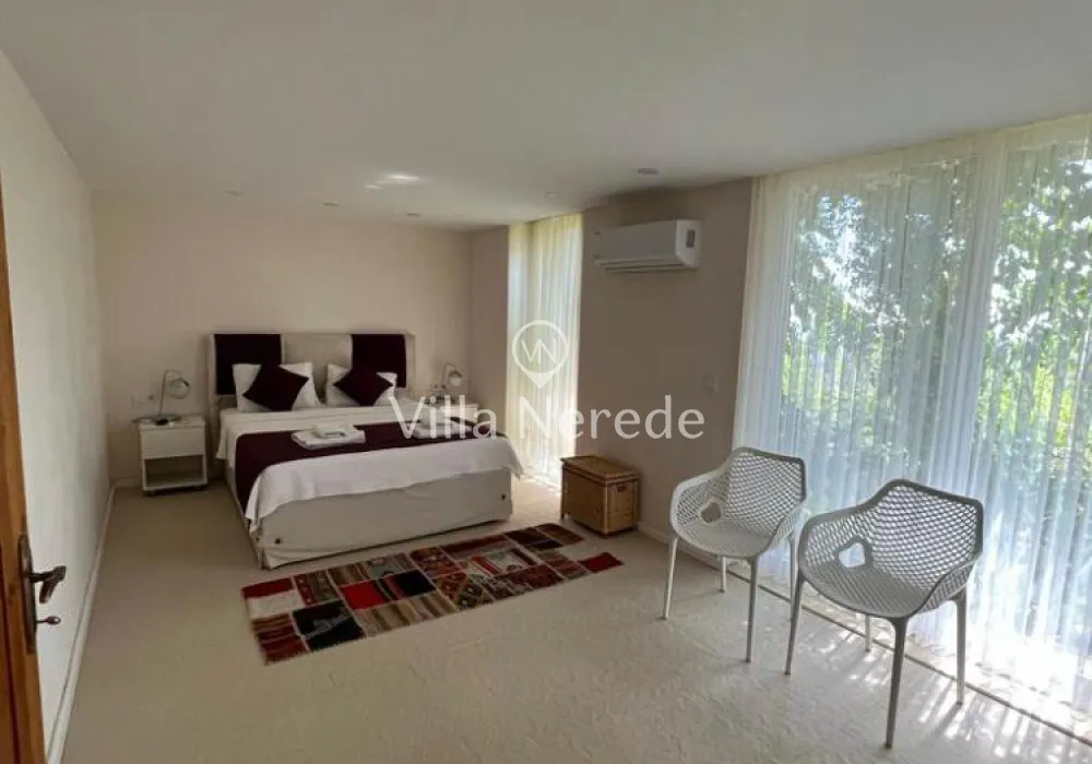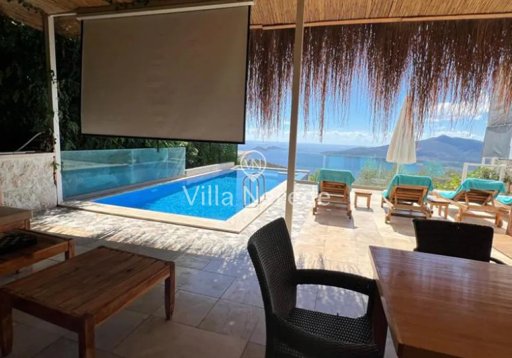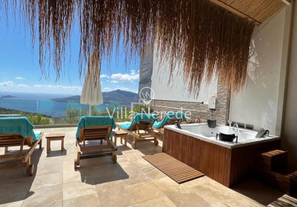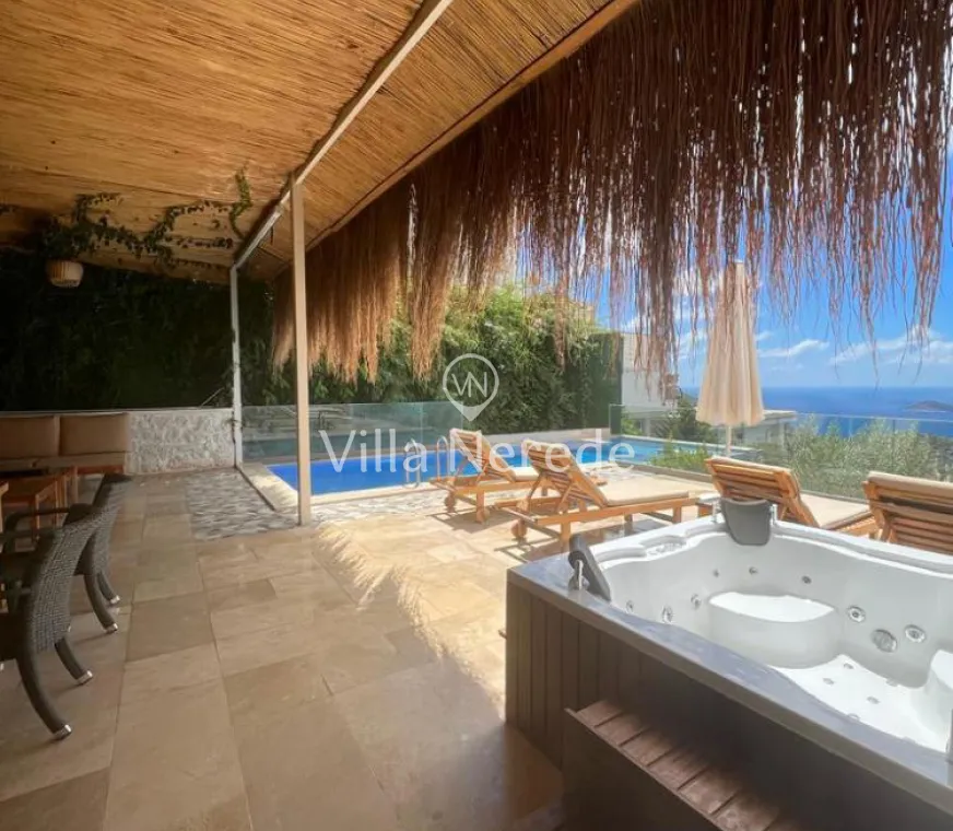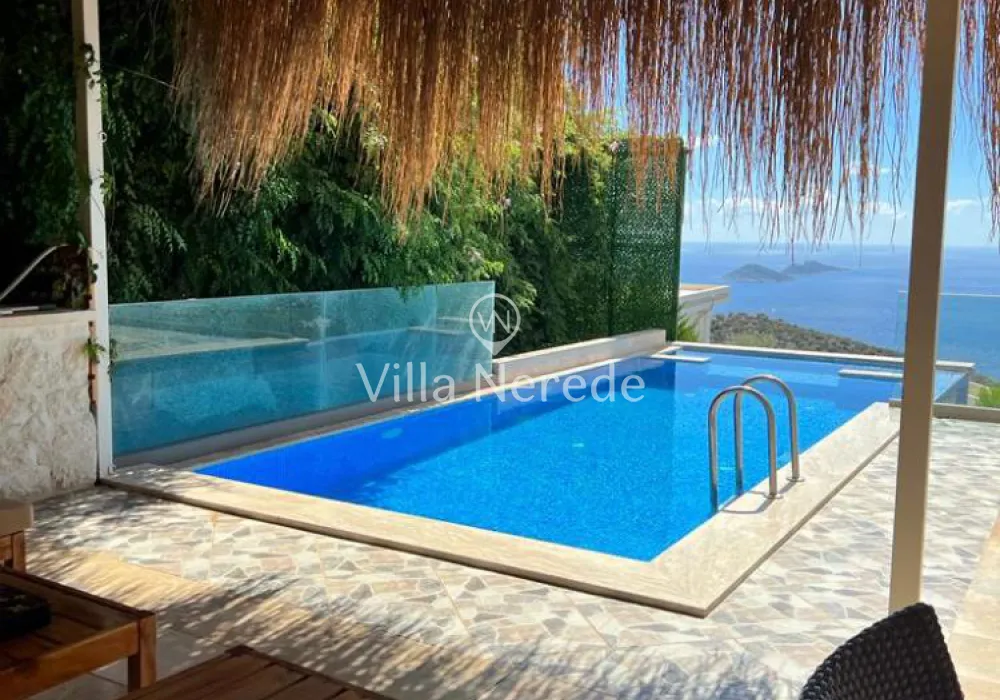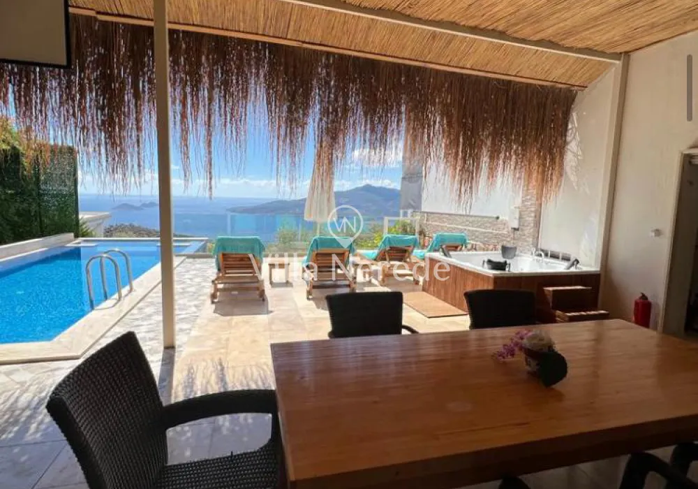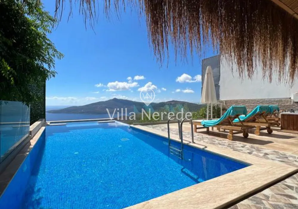 Muhteşem manzaraya karşı, güneşlenip yüzebileceğiniz havuz terasında kapasiteye uygun şezlong takımı, oturma grubu ve barbekü alanı bulunan villanın, yine havuz terasına açılan konforlu oturma odası ve tam donanımlı açık mutfağı; iki yatak odasında çift kişilik yatak ve ebeveyn banyosu ebeveyn banyosu bulunmaktadır.