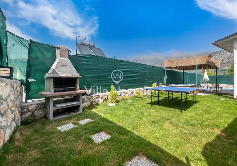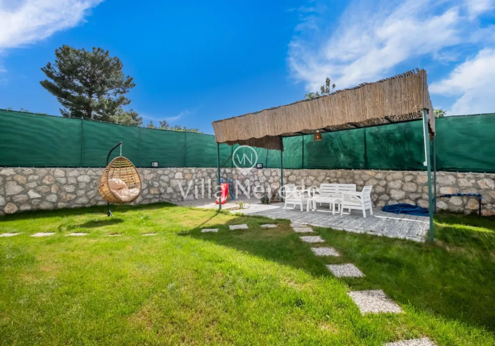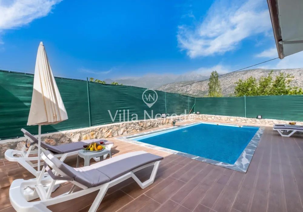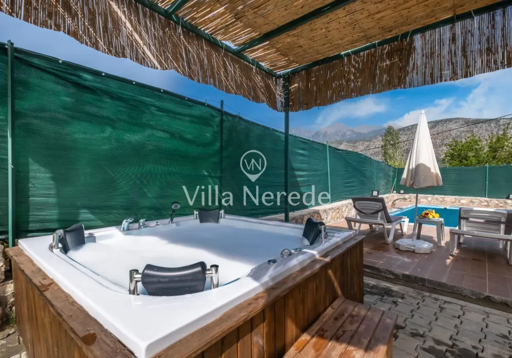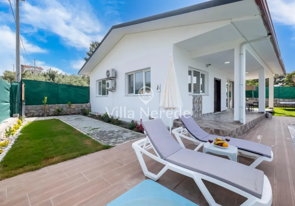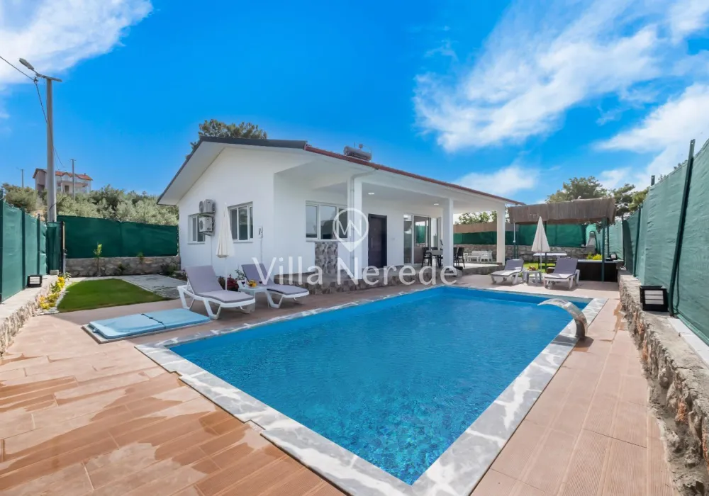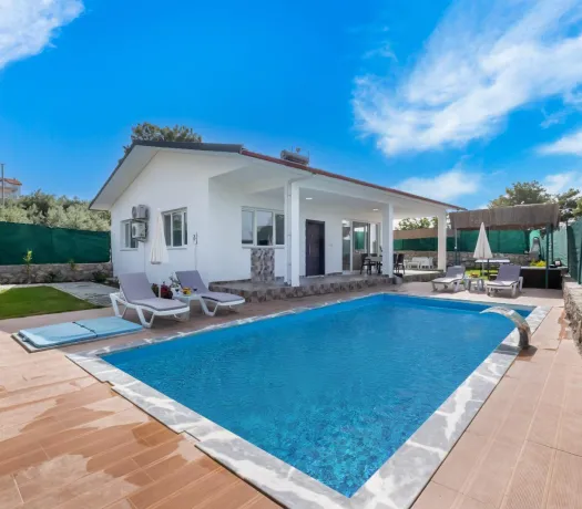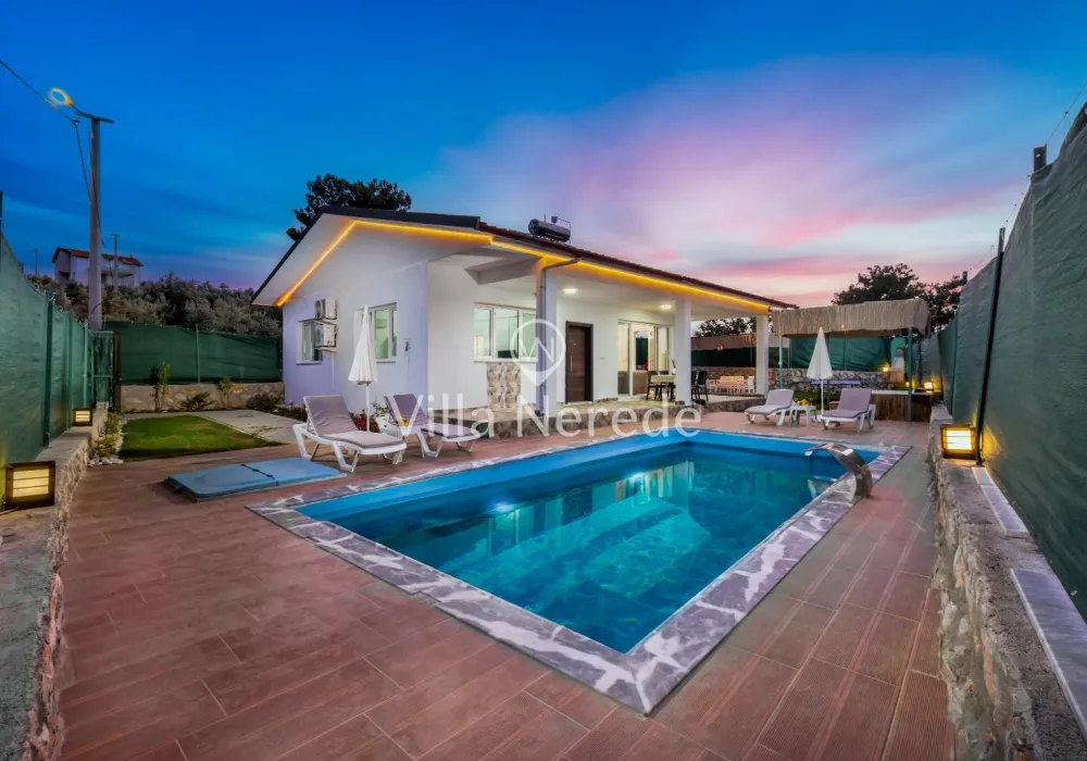 Doğa içinde, huzurlu bir konumu olan villanın havuz bahçe alanında kapasiteye uygun şezlong takımı, oturma grubu, barbekü alanı; havuz terasına açılan oturma odası, tam donanımlı açık mutfağı bulunmaktadır. Birinci yatak odasında çift kişilik yatak ve ebeveyn banyosu , ikinci yatak odasında ise tek kişilik iki adet yatak bulunmaktadır.Havuz terasında bulunan açık hava jakuzisiyle keyifli bir tatil sizleri bekliyor
