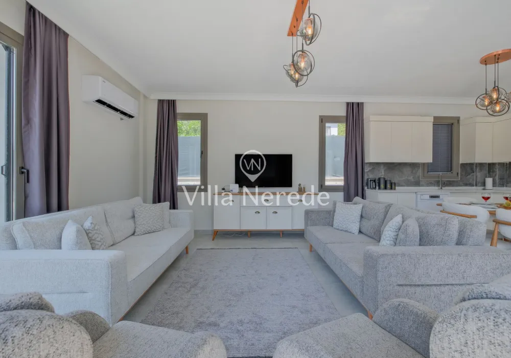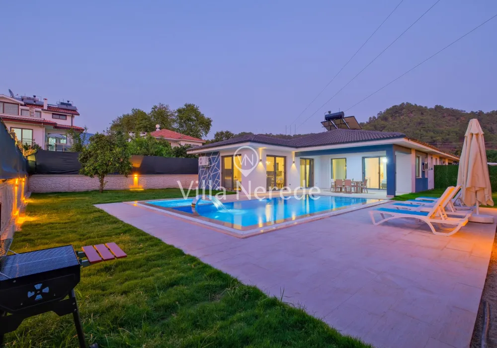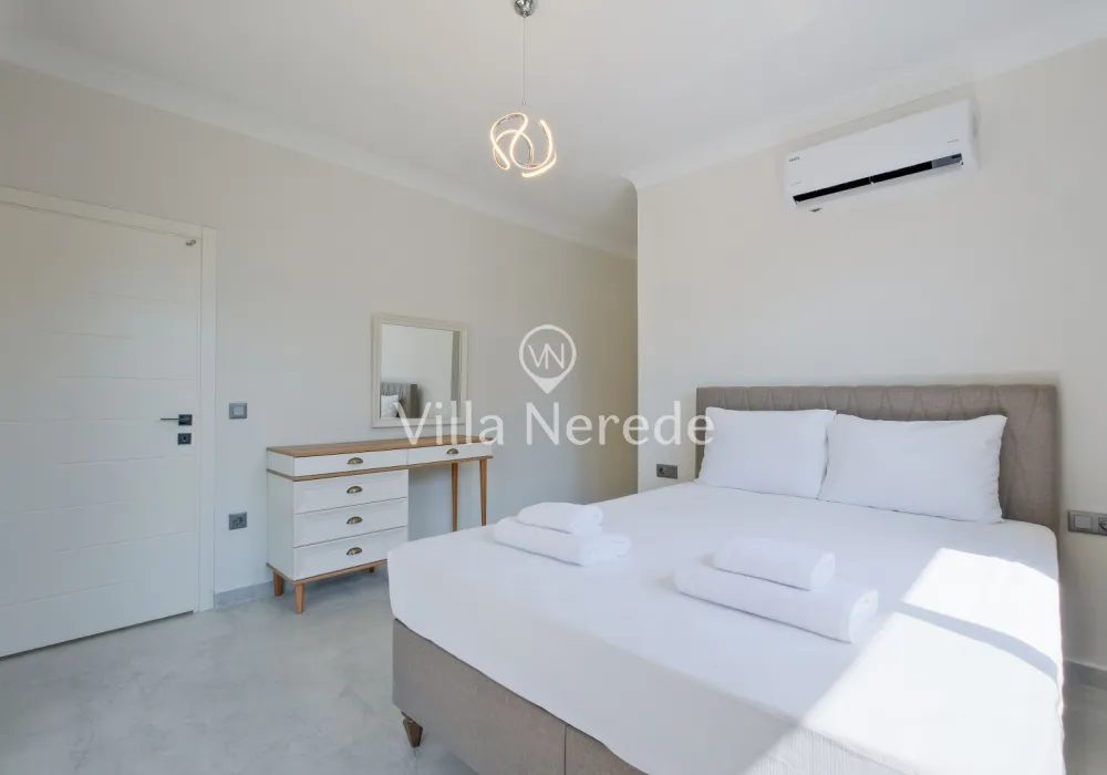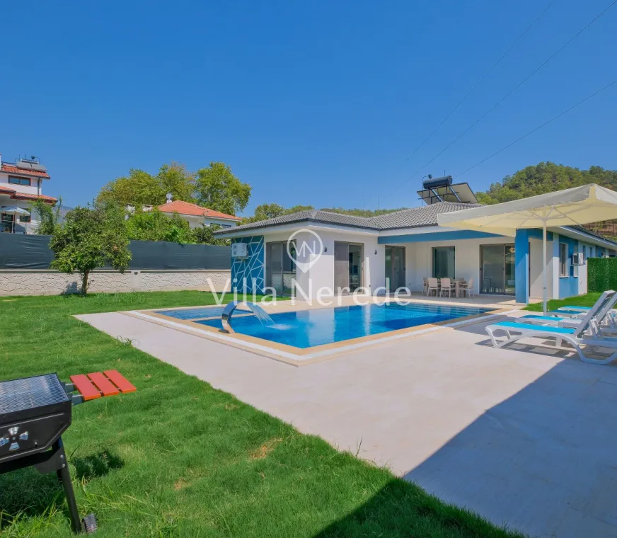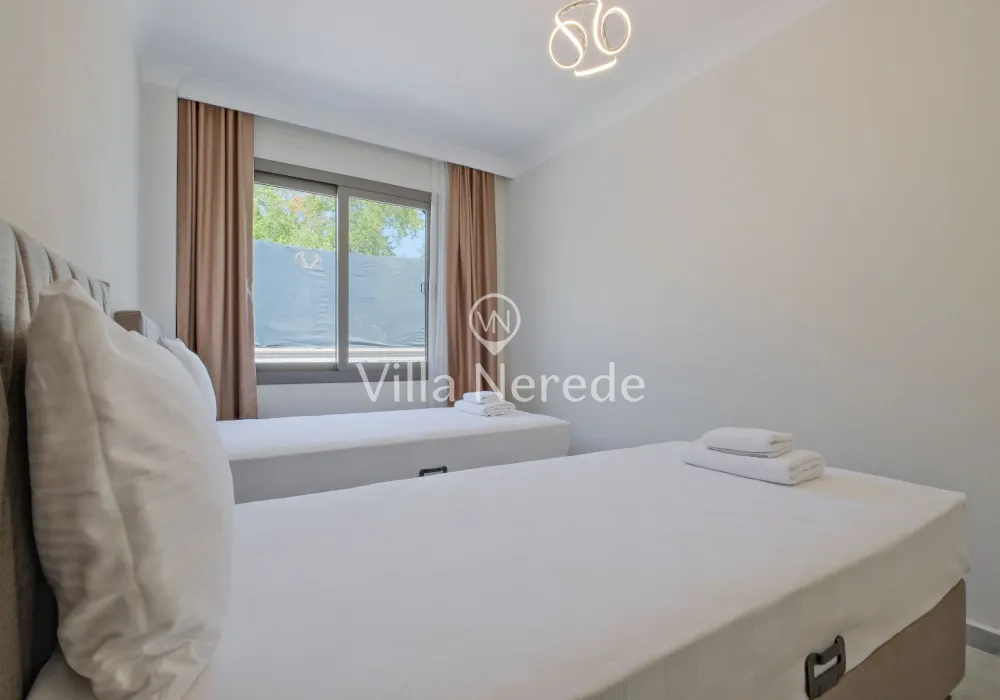 Ferah ve geniş bahçe alanına sahip villada kapasiteye uygun oturma alanı, şezlong takımı, salıncak, masa tenis,çocuk havuzui ve barbekü alanı; havuz terasına açılan konforlu oturma odası, ihtiyaçlarınızı karşılayacak donanıma sahip mutfağı mevcuttur.Özenle dekore edilmiş detayları sizleri memnun edecek, sevdiklerinizle ayrıcalıklı bir tatilin keyfini sürebileceksiniz.İki yatak odasında çift kişilik yatak ve ebeveyn banyosu ;üçüncü yatak odasında ise iki tek kişilik yatak bulunmaktadır.