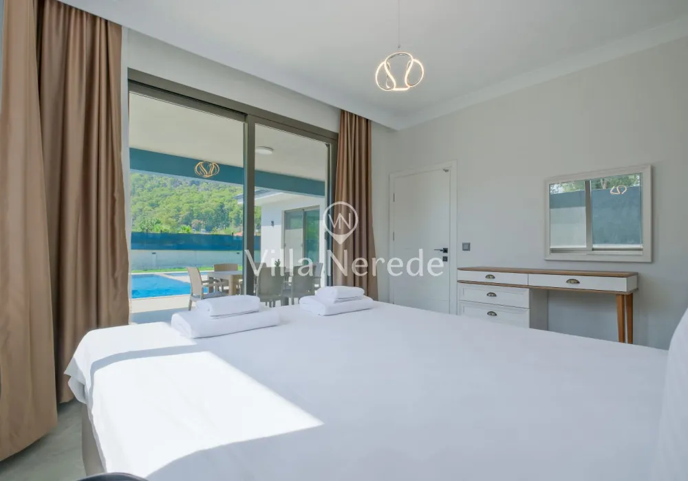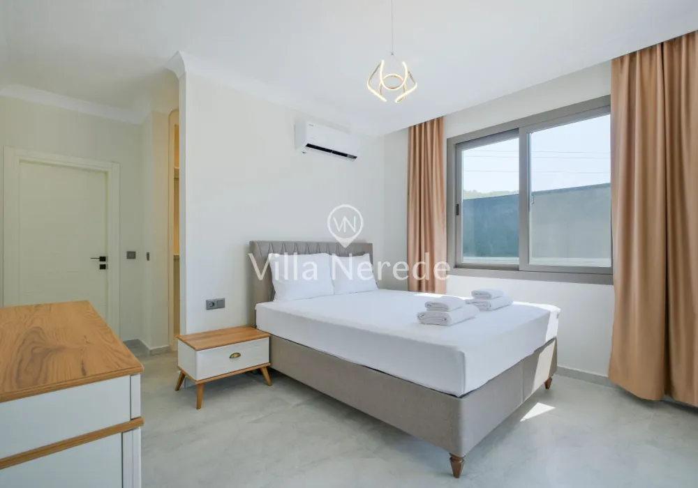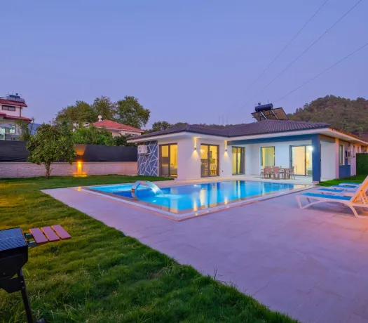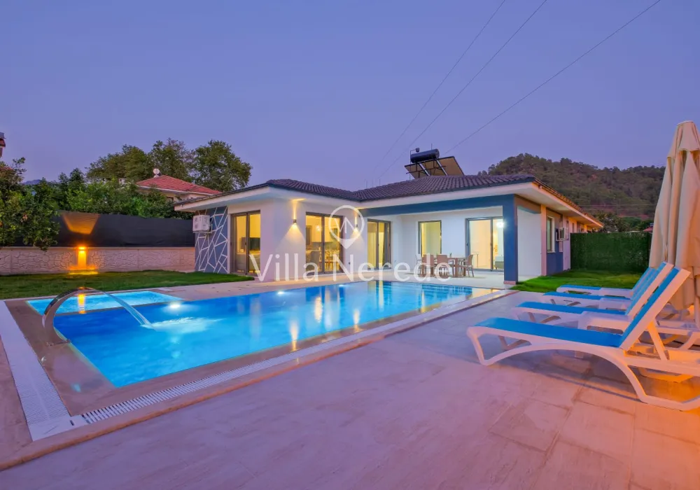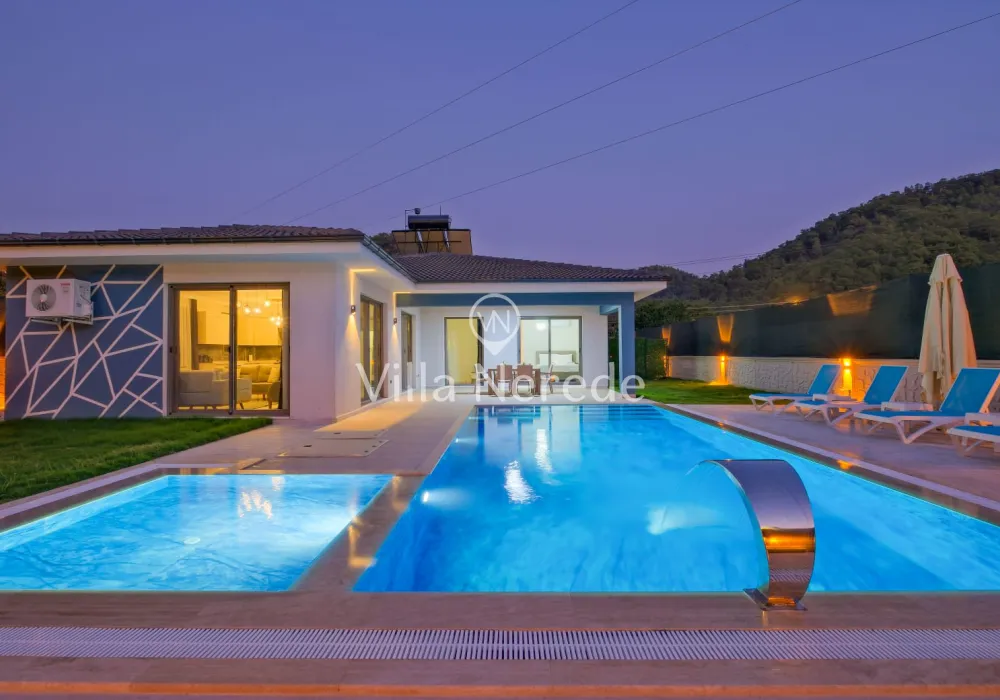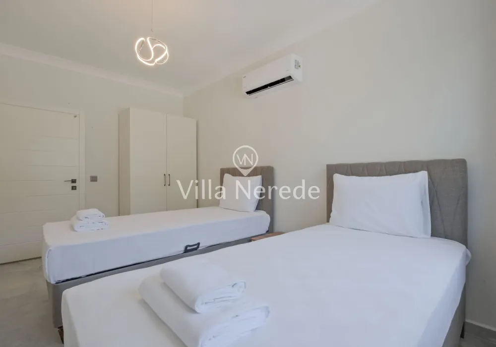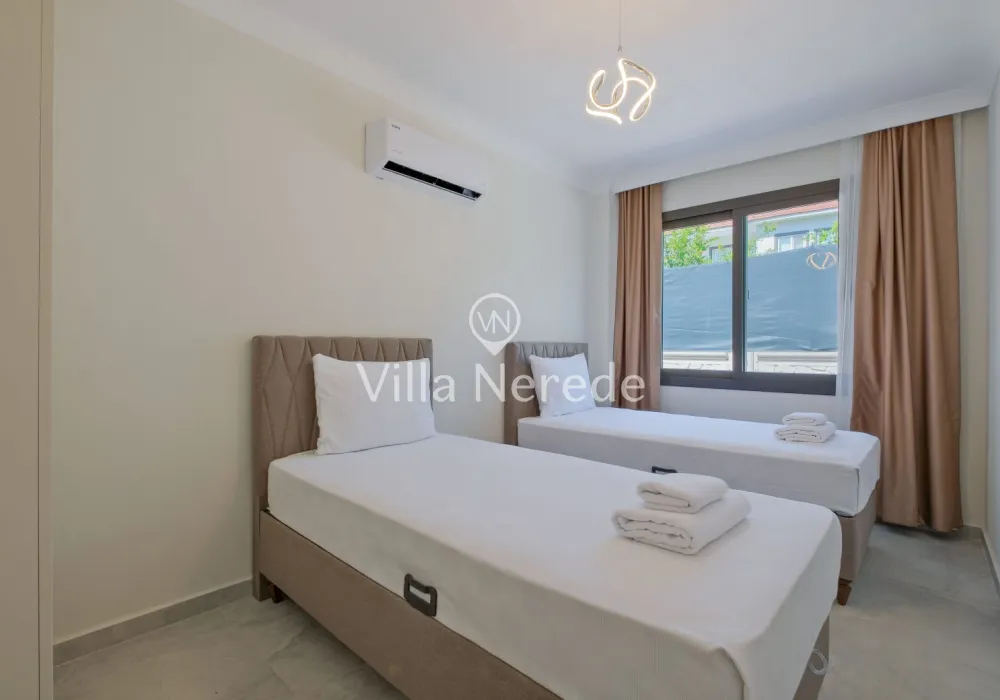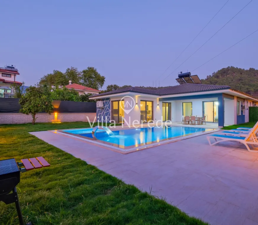 Ferah ve geniş bahçe alanına sahip villada kapasiteye uygun oturma alanı, şezlong takımı, salıncak, masa tenis,çocuk havuzui ve barbekü alanı; havuz terasına açılan konforlu oturma odası, ihtiyaçlarınızı karşılayacak donanıma sahip mutfağı mevcuttur.Özenle dekore edilmiş detayları sizleri memnun edecek, sevdiklerinizle ayrıcalıklı bir tatilin keyfini sürebileceksiniz.İki yatak odasında çift kişilik yatak ve ebeveyn banyosu ;üçüncü yatak odasında ise iki tek kişilik yatak bulunmaktadır.
