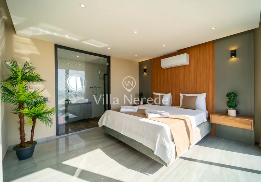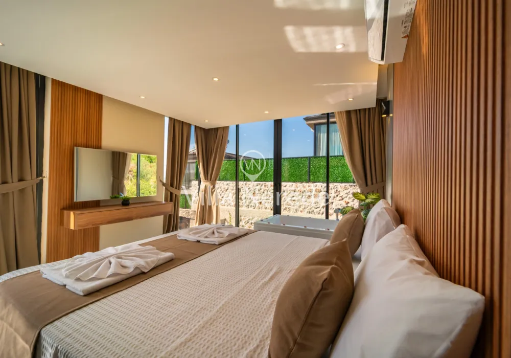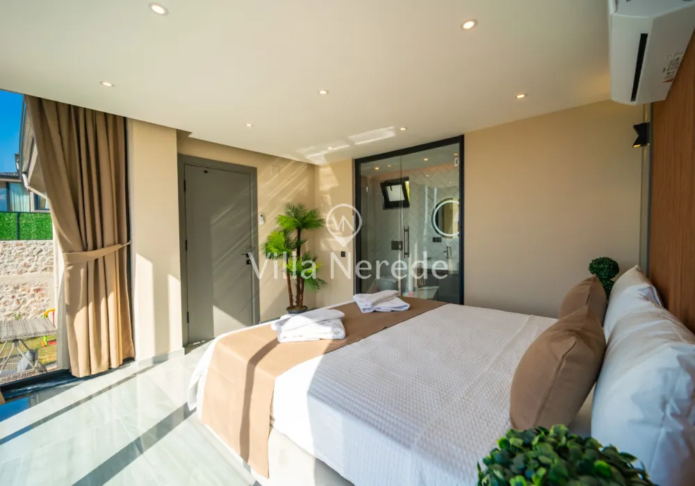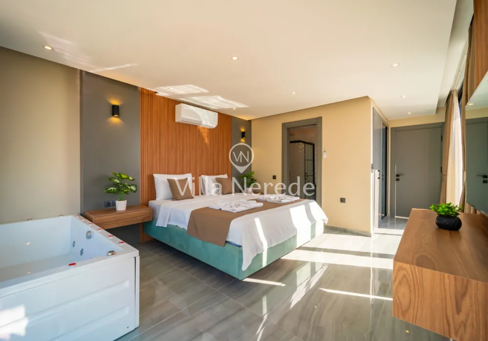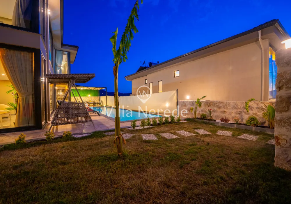 Korunaklı yüzme havuz ve bahçe alanına sahip villada kapasiteye uygun oturma alanı, şezlong takımı, çocuk oyun alanı,salıncak ve barbekü alanı; havuz terasına açılan konforlu oturma odası, ihtiyaçlarınızı karşılayacak donanıma sahip mutfağı mevcuttur.Özenle dekore edilmiş detayları sizleri memnun edecek, sevdiklerinizle ayrıcalıklı bir tatilin keyfini sürebileceksiniz.Birinci yatak odasında çift kişilik yatak ,ebeveyn banyosu ve jakuzi ; ikinci yatak odasında ise çift kişilik yatak ve ebeveyn banyosu bulunmaktadır.