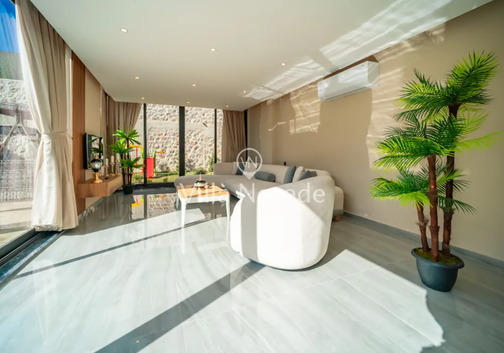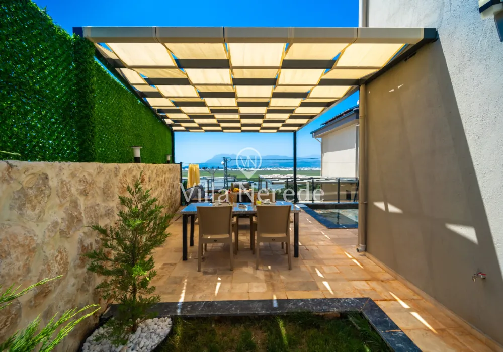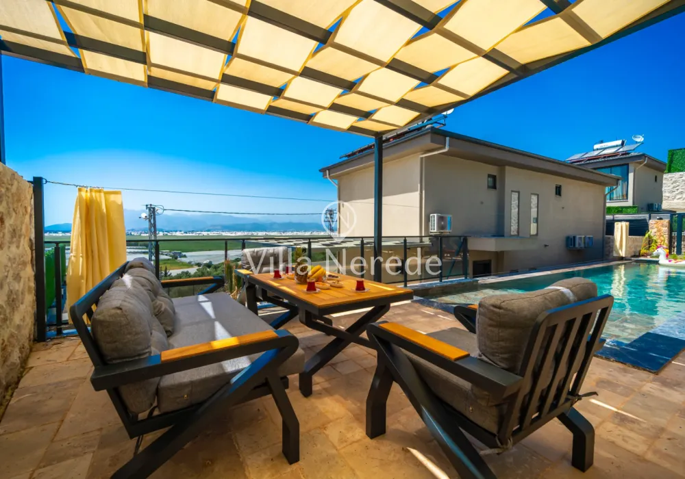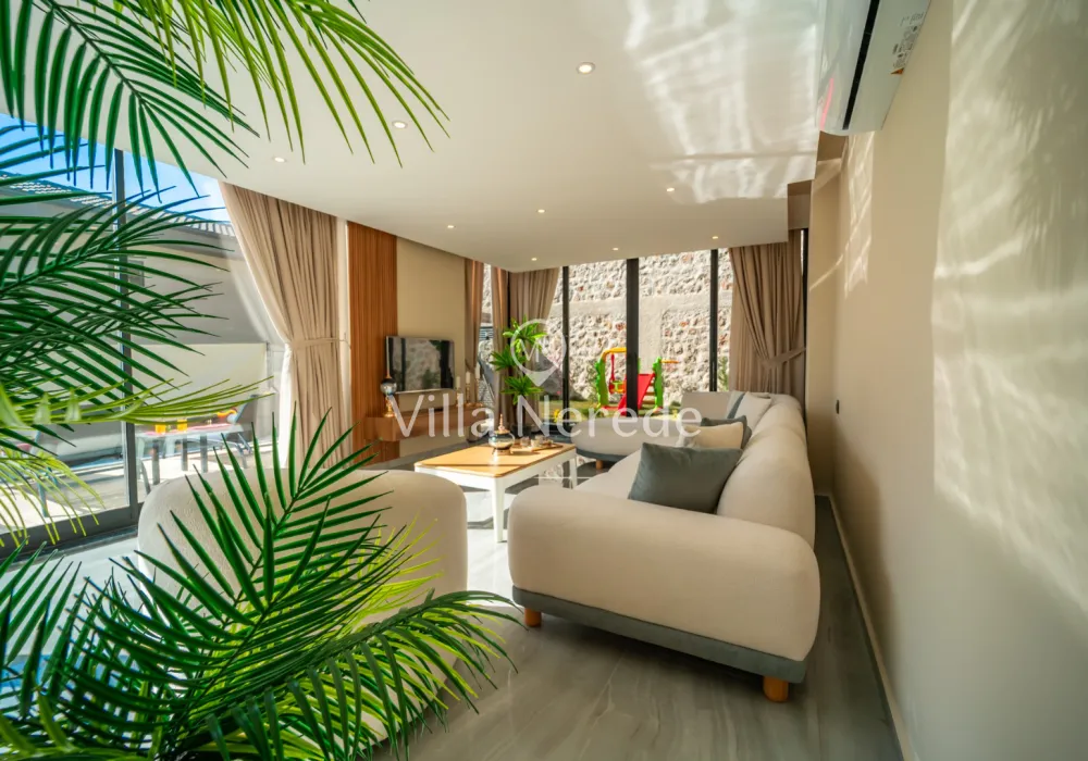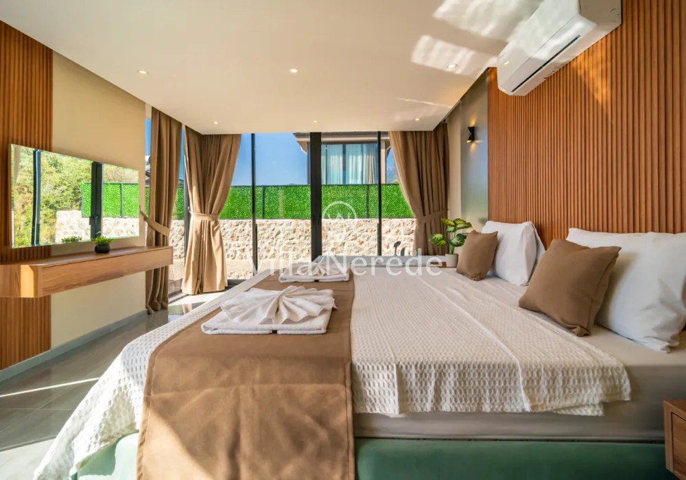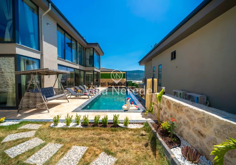 Korunaklı yüzme havuz ve bahçe alanına sahip villada kapasiteye uygun oturma alanı, şezlong takımı, çocuk oyun alanı,salıncak ve barbekü alanı; havuz terasına açılan konforlu oturma odası, ihtiyaçlarınızı karşılayacak donanıma sahip mutfağı mevcuttur.Özenle dekore edilmiş detayları sizleri memnun edecek, sevdiklerinizle ayrıcalıklı bir tatilin keyfini sürebileceksiniz.Birinci yatak odasında çift kişilik yatak ,ebeveyn banyosu ve jakuzi ; ikinci yatak odasında ise çift kişilik yatak ve ebeveyn banyosu bulunmaktadır.