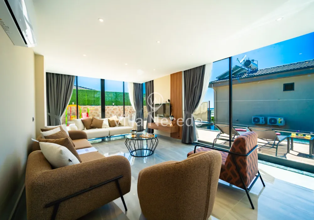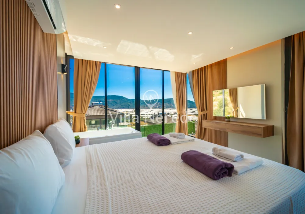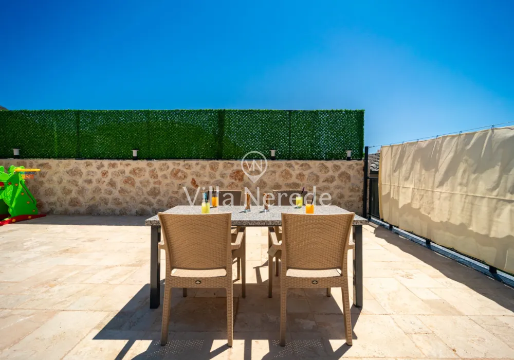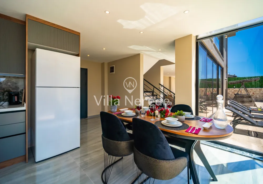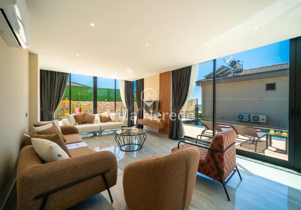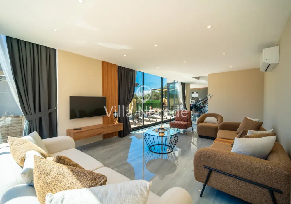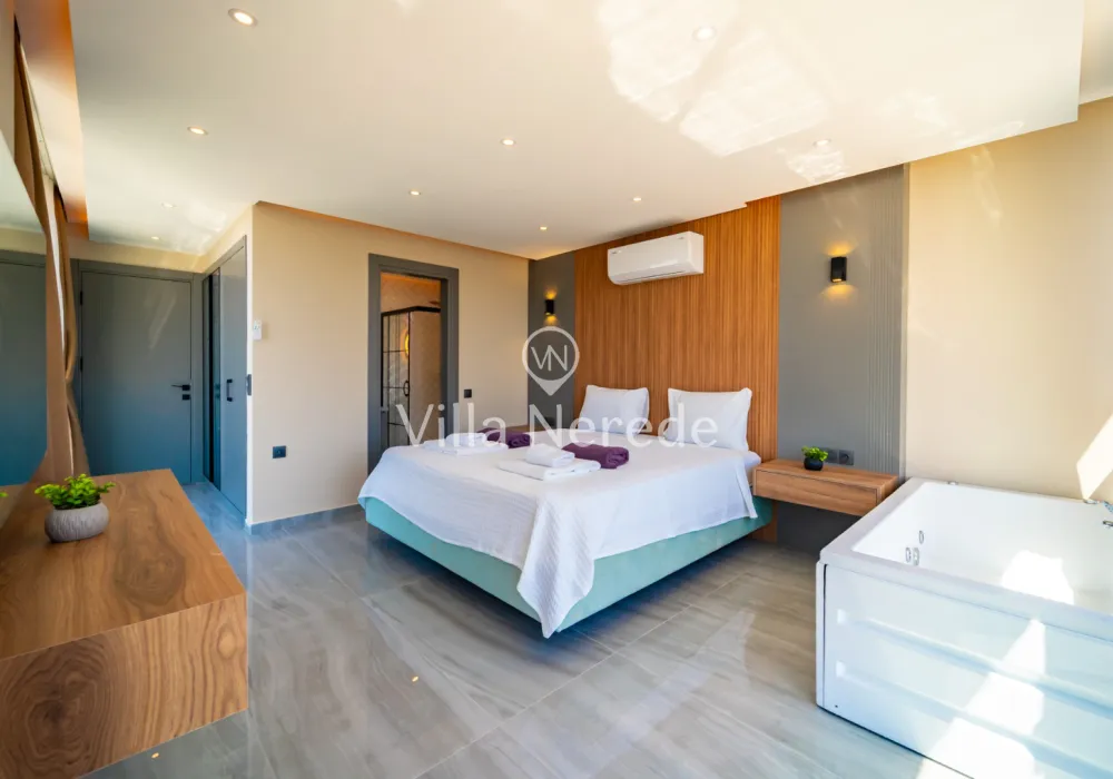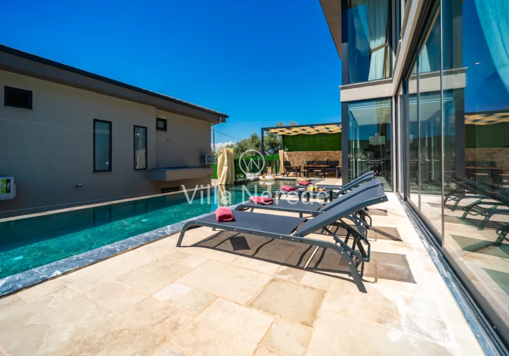 Korunaklı yüzme havuz ve bahçe alanına sahip villada kapasiteye uygun oturma alanı, şezlong takımı, çocuk oyun alanı,salıncak ve barbekü alanı; havuz terasına açılan konforlu oturma odası, ihtiyaçlarınızı karşılayacak donanıma sahip mutfağı mevcuttur.Özenle dekore edilmiş detayları sizleri memnun edecek, sevdiklerinizle ayrıcalıklı bir tatilin keyfini sürebileceksiniz.Birinci yatak odasında çift kişilik yatak ,ebeveyn banyosu ve jakuzi ; ikinci yatak odasında ise çift kişilik yatak ve ebeveyn banyosu bulunmaktadır.