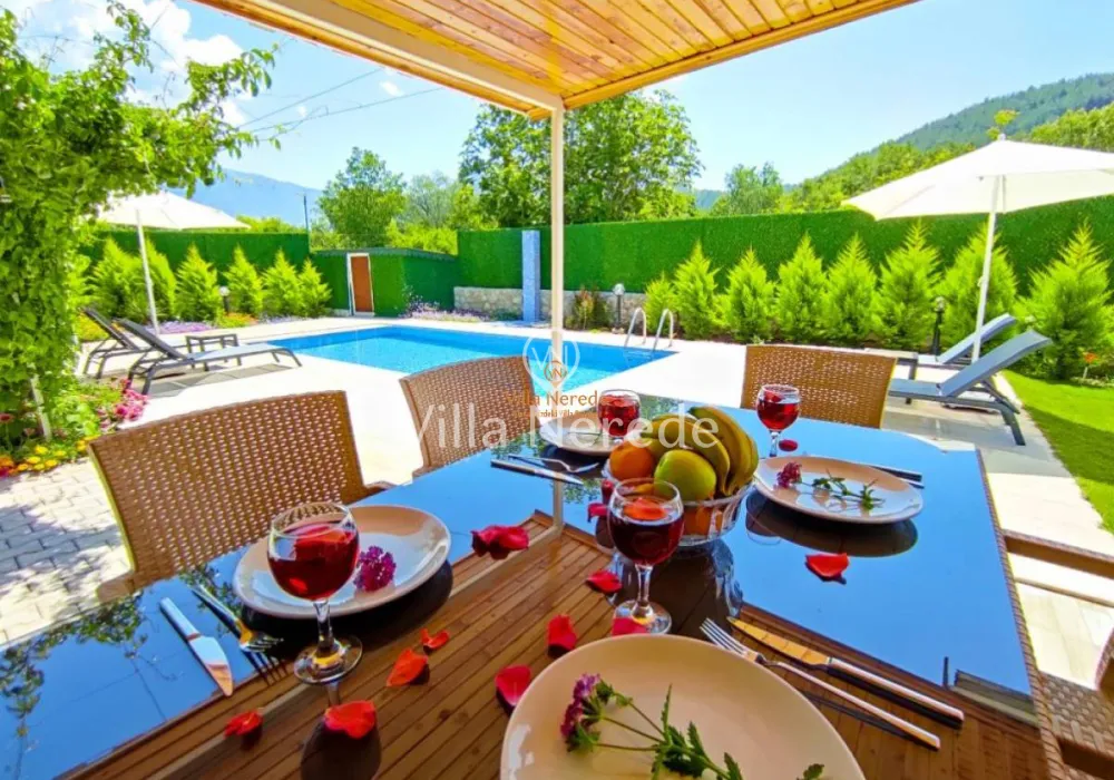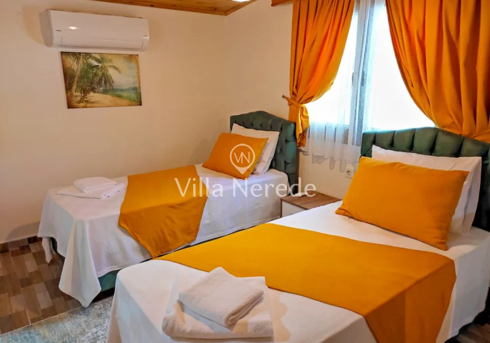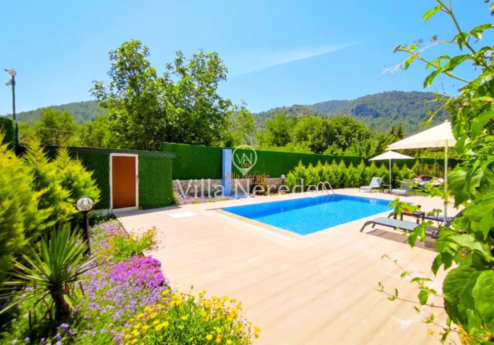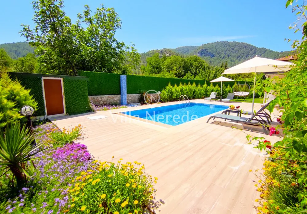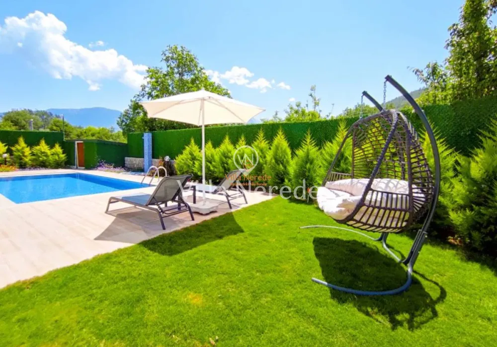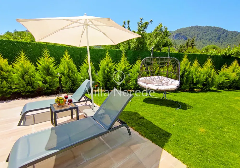 Çam ağaçlarıyla çevrelenmiş, Kayaköy'ün eşsiz doğasına sırtını yaslamış; doğa içinde dingin konumu ve yemyeşil geniş bahçesiyle sakin ve huzurlu bir tatil arayan misafirlerimiz için oldukça uygun olan villa, sizlere Kayaköy'ün büyülü tarihinde kısa bir mola vaadetmektedir. Bu bağlamdan esinlenerek dizayn edilmiş bahçe alanı ve geniş havuz terasına sahiptir; yine havuz terasında kapasiteye uygun şezlong takımı, konforlu oturma grubu, salıncak ve barbekü bulunmaktadır. Konforunuz gözetilerek tasarlanmış olan muhafazakar havuz alanına açılan ferah oturma odası, tam donanımlı açık mutfak; bir yatak odasında çift kişilik yatak ve ebeveyn banyosu; ikinci yatak odasında ise iki tek kişilik yatak bulunmaktadır. Villa, ihtiyaçlarınıza karşılık verecek donanıma sahiptir.