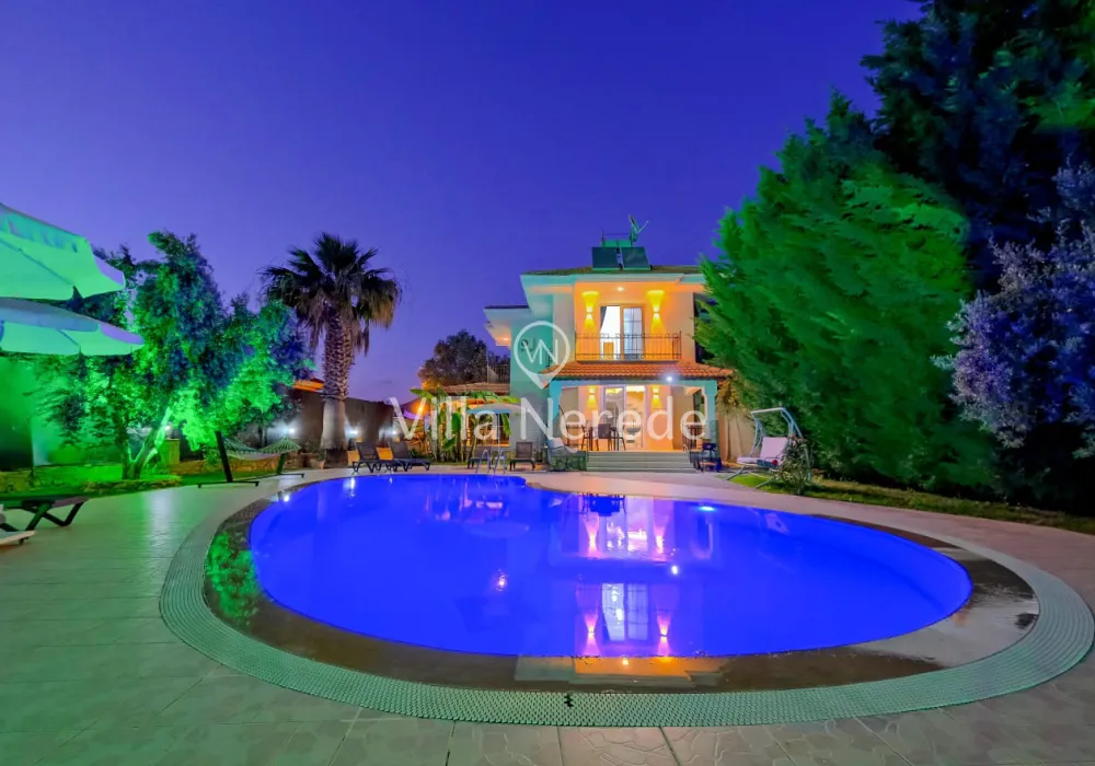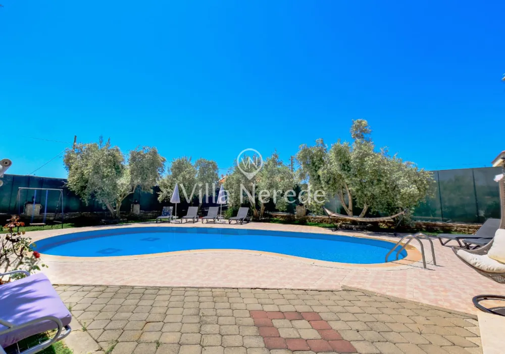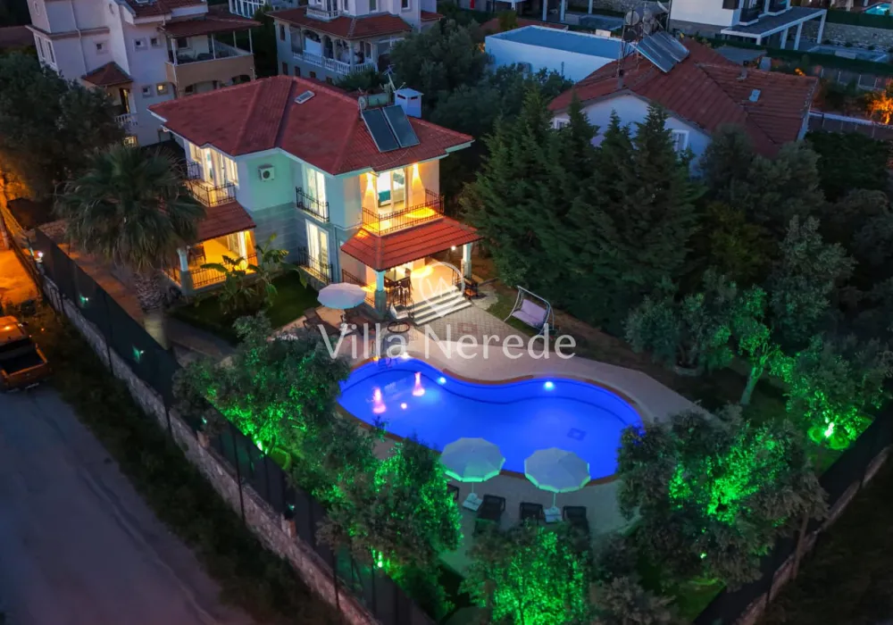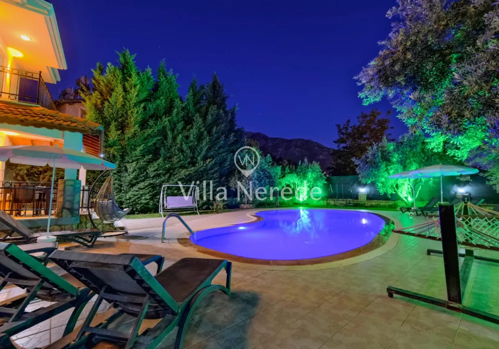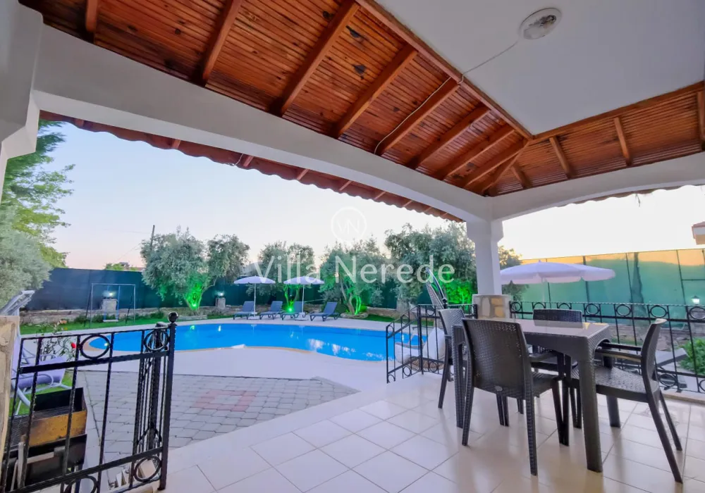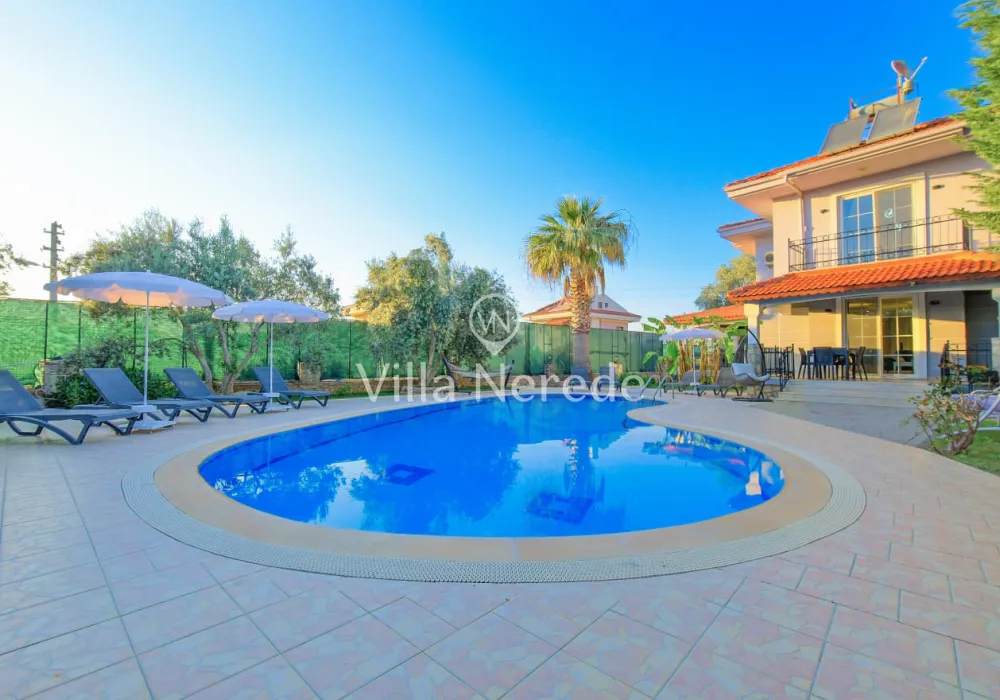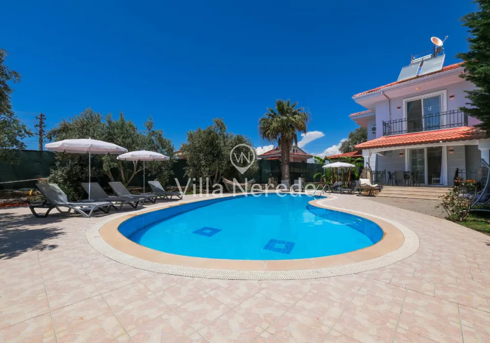 Geniş havuz ve bahçe alanına sahip villada, kapasiteye uygun oturma alanı, şezlong takımı, barbekü; havuz terasına açılan konforlu oturma odası, ihtiyaçlarınızı karşılayacak donanıma sahip şık mutfağı bulunmaktadır. Doğa içinde, huzurlu sakin bir tatil vaadeden, bulunduğu konumdan esinlenilen detaylara sahip olan villada, keyifli bir tatil deneyimlemeniz için her şey düşünülmüştür.