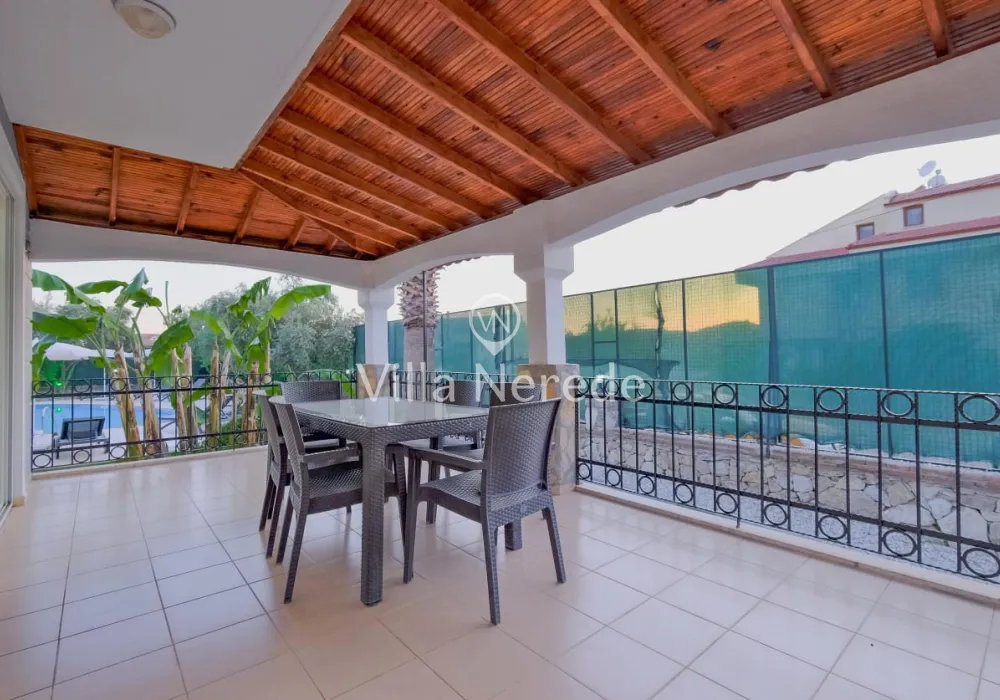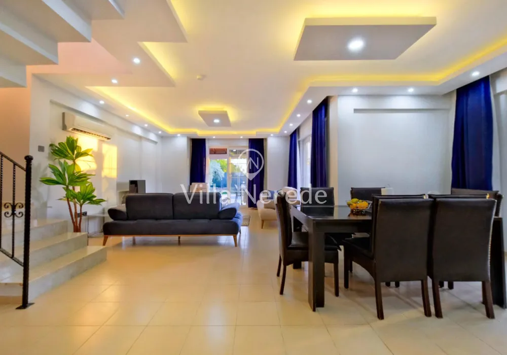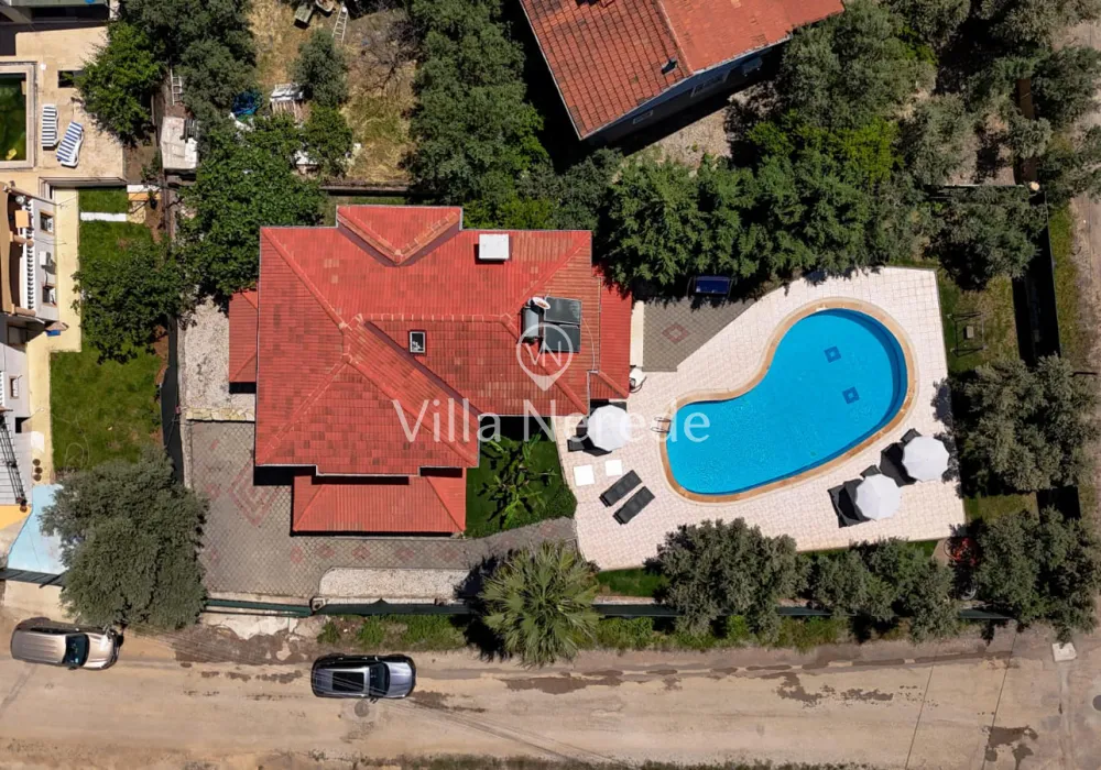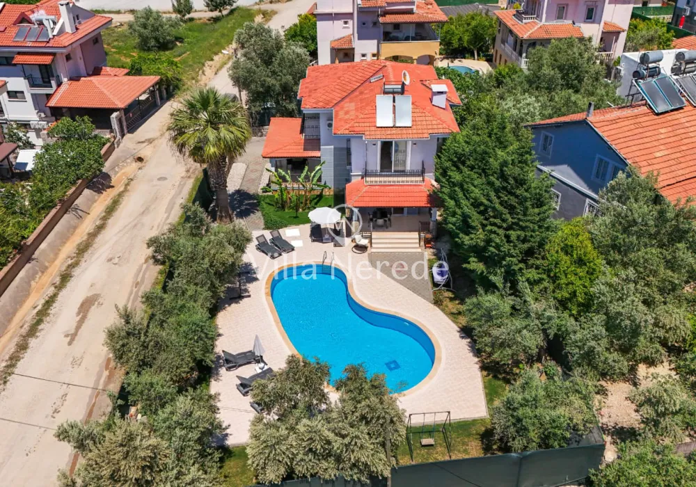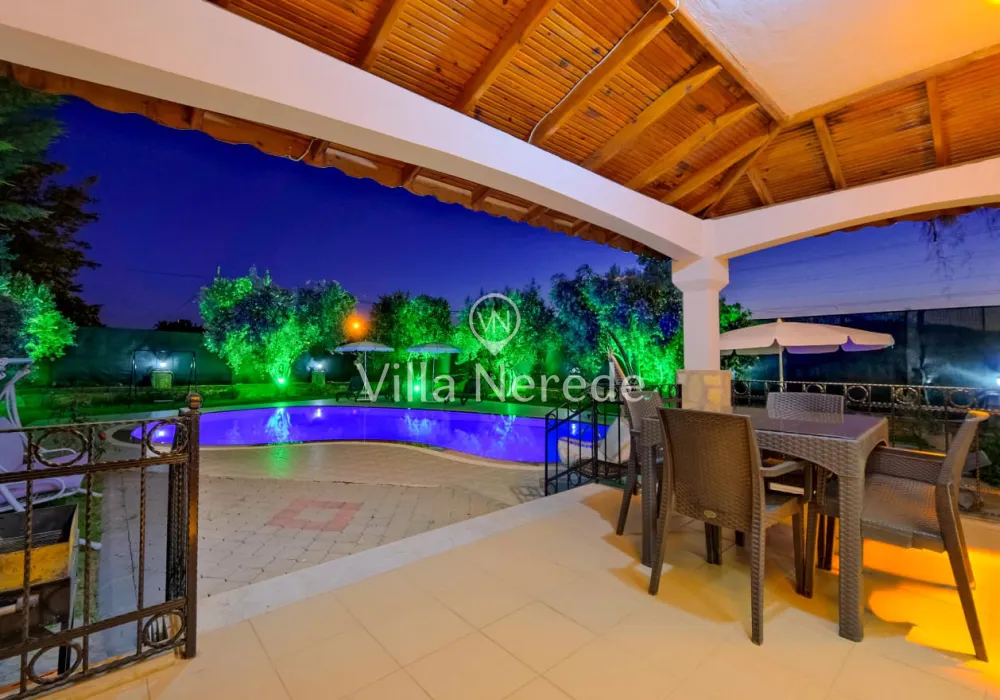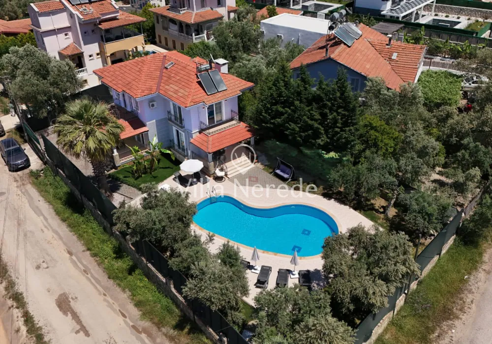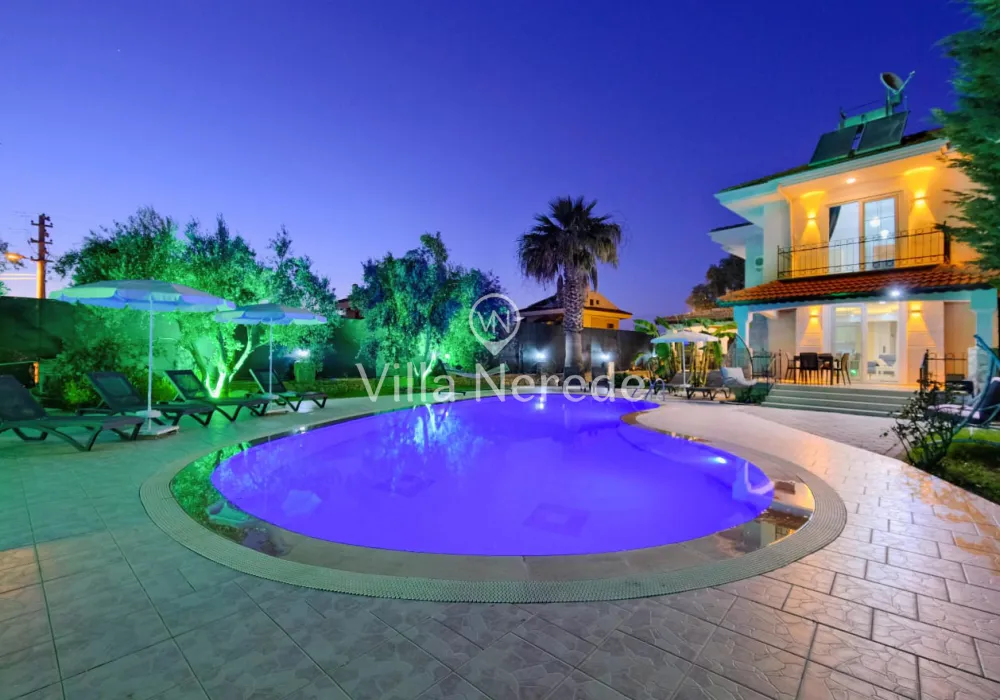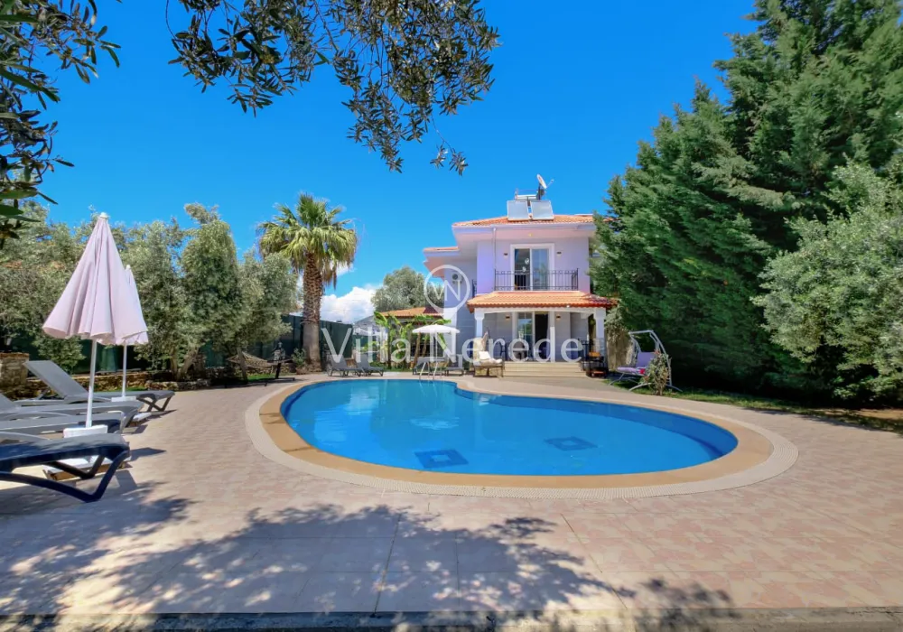 Geniş havuz ve bahçe alanına sahip villada, kapasiteye uygun oturma alanı, şezlong takımı, barbekü; havuz terasına açılan konforlu oturma odası, ihtiyaçlarınızı karşılayacak donanıma sahip şık mutfağı bulunmaktadır. Doğa içinde, huzurlu sakin bir tatil vaadeden, bulunduğu konumdan esinlenilen detaylara sahip olan villada, keyifli bir tatil deneyimlemeniz için her şey düşünülmüştür.