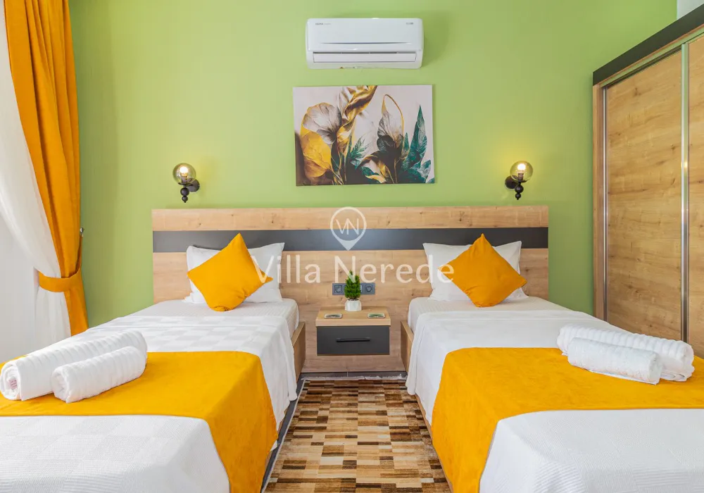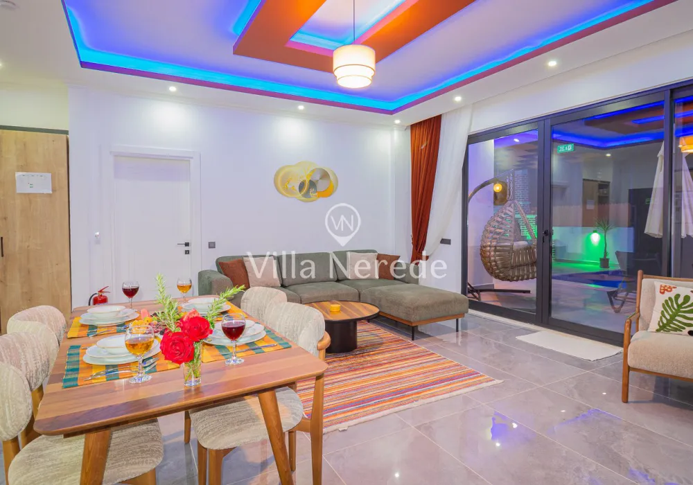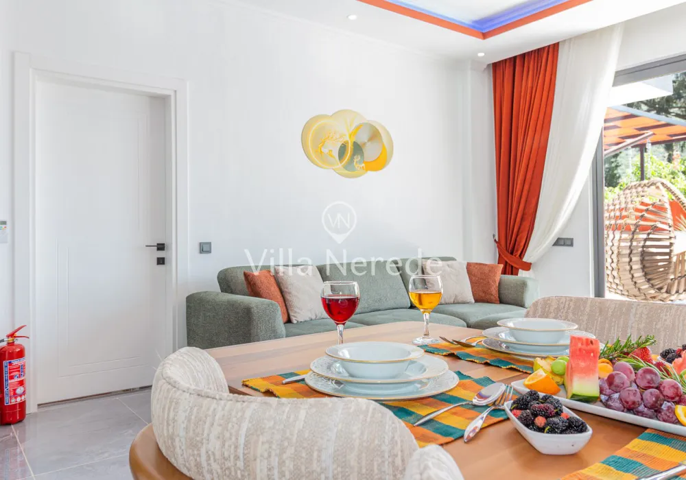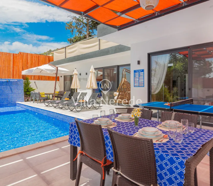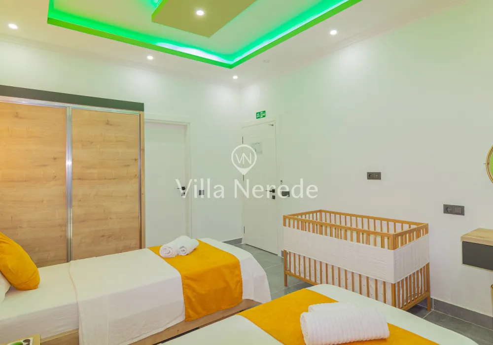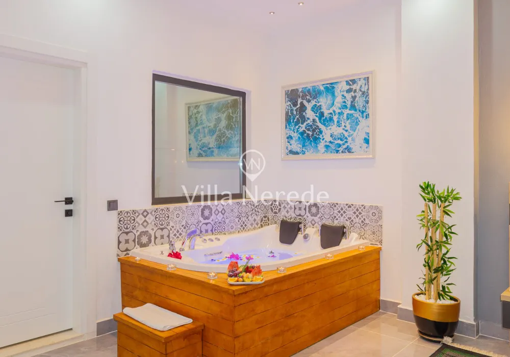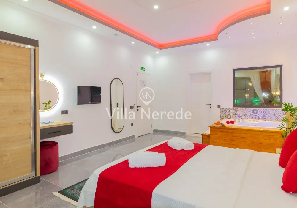 Korunaklı yüzme havuz ve bahçe alanına sahip villada kapasiteye uygun oturma alanı, şezlong takımı, salıncak, masa tenisi ve barbekü alanı; havuz terasına açılan konforlu oturma odası, ihtiyaçlarınızı karşılayacak donanıma sahip mutfağı mevcuttur.Özenle dekore edilmiş detayları sizleri memnun edecek, sevdiklerinizle ayrıcalıklı bir tatilin keyfini sürebileceksiniz.Birinci yatak odasında çift kişilik yatak ,ebeveyn banyosu ve jakuzi ;ikinci yatak odasında ise iki tek kişilik yatak ve ebeveyn banyosu bulunmaktadır.