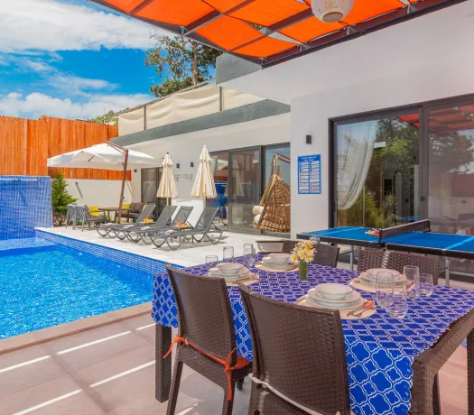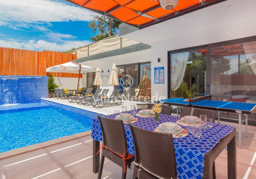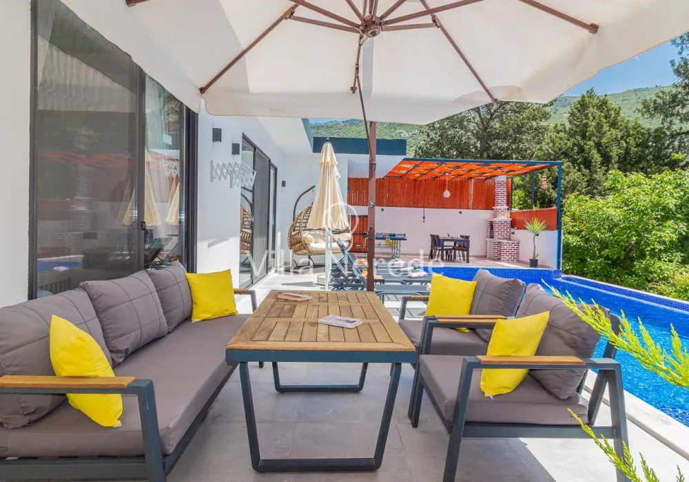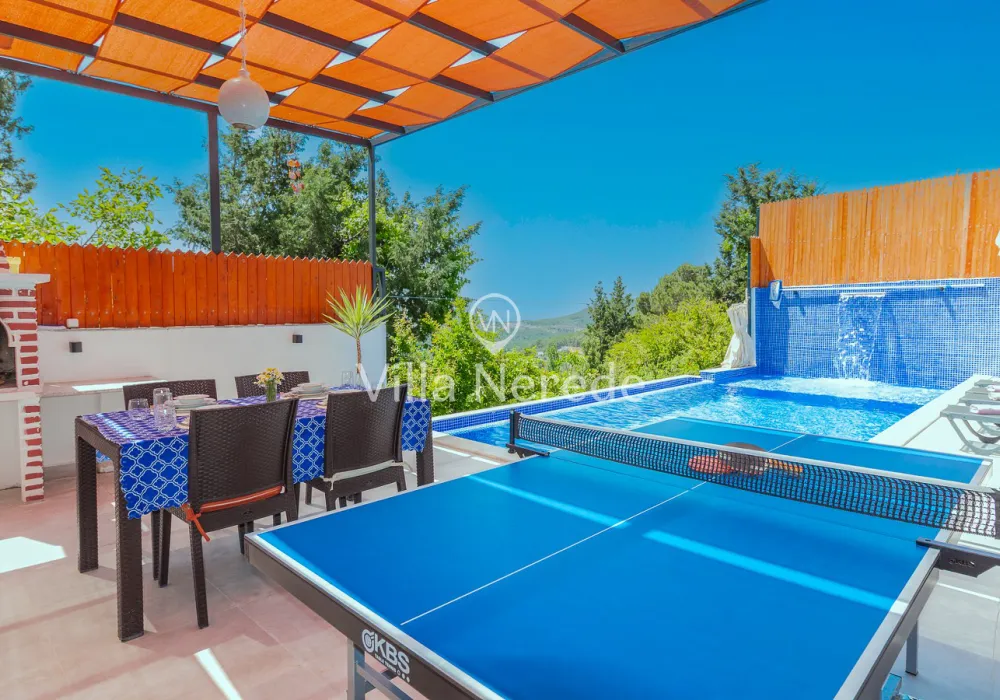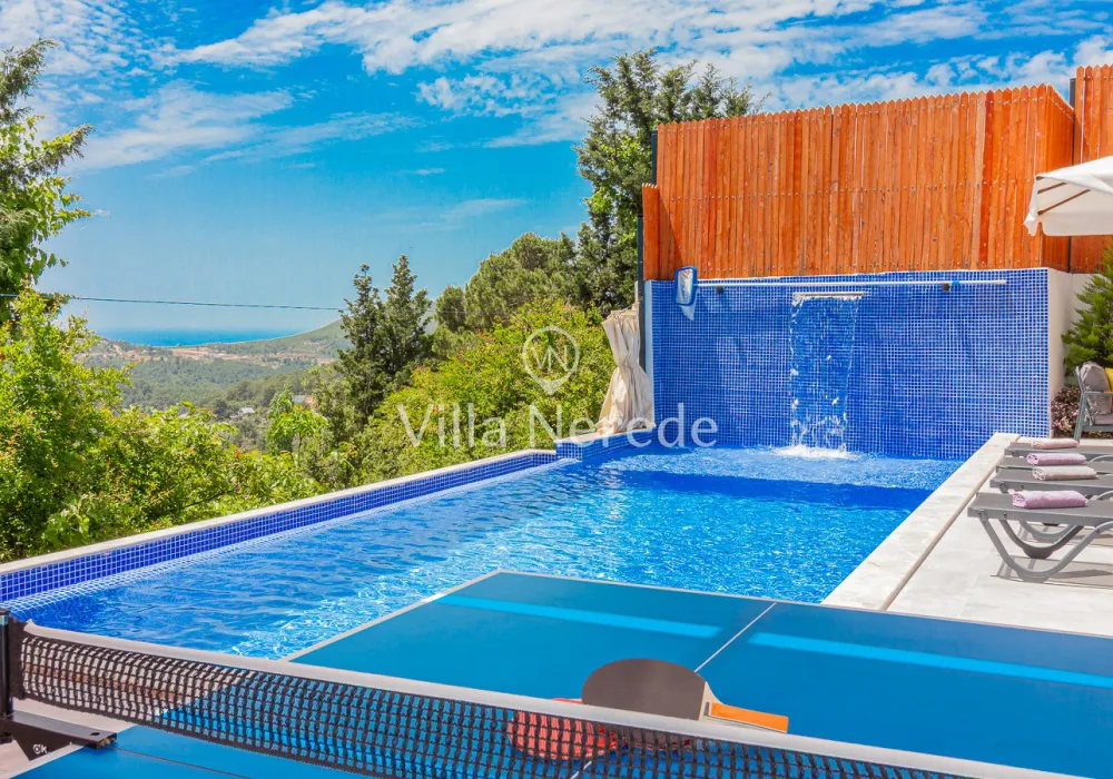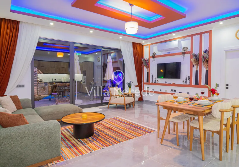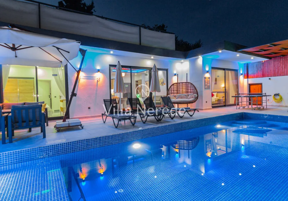 Korunaklı yüzme havuz ve bahçe alanına sahip villada kapasiteye uygun oturma alanı, şezlong takımı, salıncak, masa tenisi ve barbekü alanı; havuz terasına açılan konforlu oturma odası, ihtiyaçlarınızı karşılayacak donanıma sahip mutfağı mevcuttur.Özenle dekore edilmiş detayları sizleri memnun edecek, sevdiklerinizle ayrıcalıklı bir tatilin keyfini sürebileceksiniz.Birinci yatak odasında çift kişilik yatak ,ebeveyn banyosu ve jakuzi ;ikinci yatak odasında ise iki tek kişilik yatak ve ebeveyn banyosu bulunmaktadır.