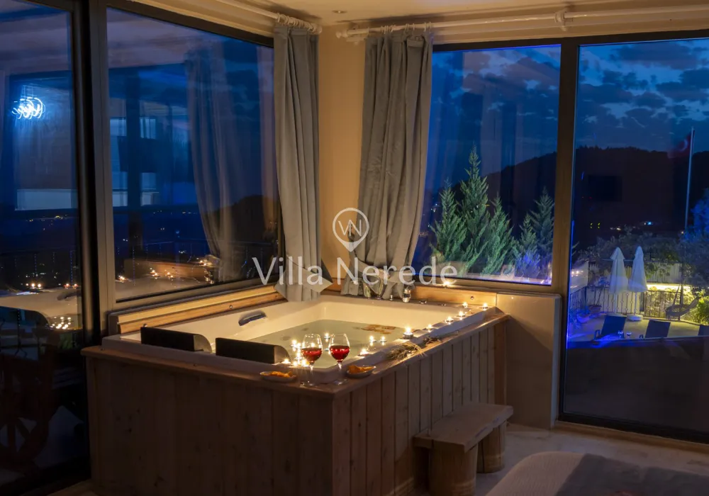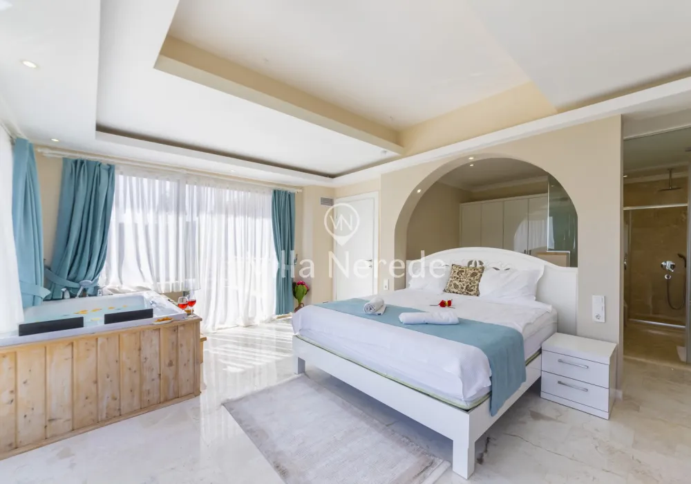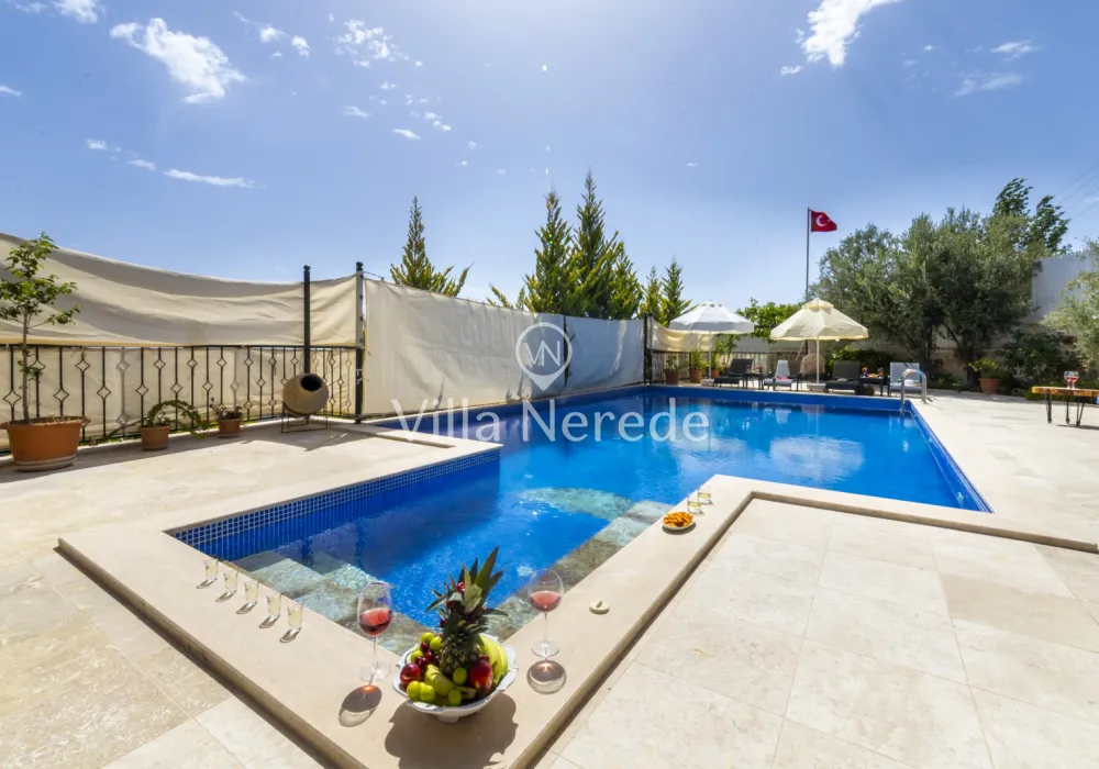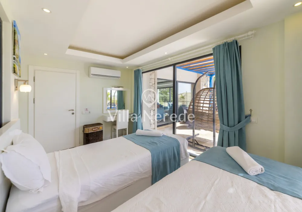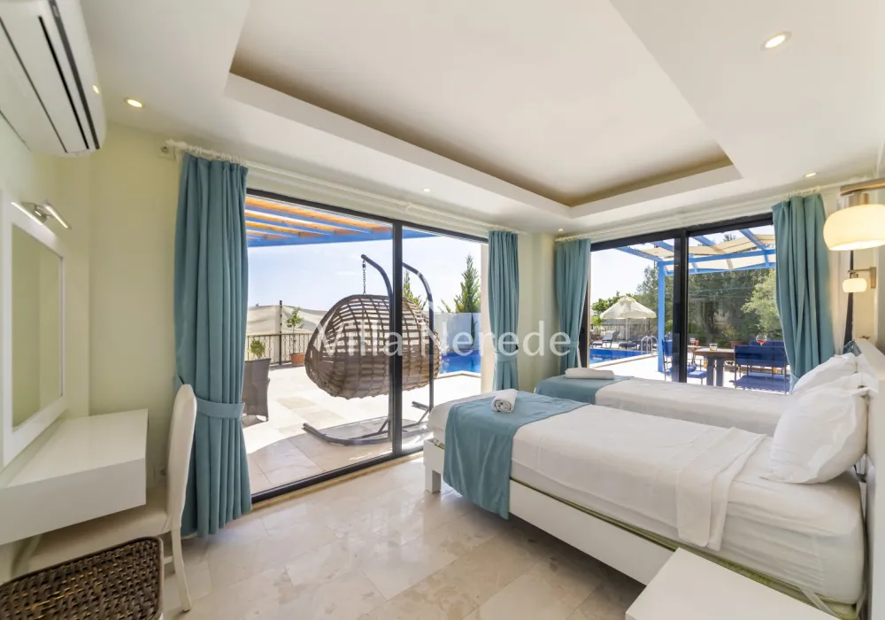 Korunaklı yüzme havuz ve bahçe alanına sahip villada kapasiteye uygun oturma alanı, şezlong takımı,çocuk havuzu,salıncak ve barbekü alanı; havuz terasına açılan konforlu oturma odası, ihtiyaçlarınızı karşılayacak donanıma sahip mutfağı mevcuttur.Özenle dekore edilmiş detayları sizleri memnun edecek, sevdiklerinizle ayrıcalıklı bir tatilin keyfini sürebileceksiniz.Birinci yatak odasında çift kişilik yatak ,ebeveyn banyosu ve jakuzi ; ikinci yatak odasında iki adet tek kişilik yatak ve ebeveyn banyosu; üçüncü yatak odasında ise çift kişilik yatak ve ebeveyn banyosu bulunmaktadır.