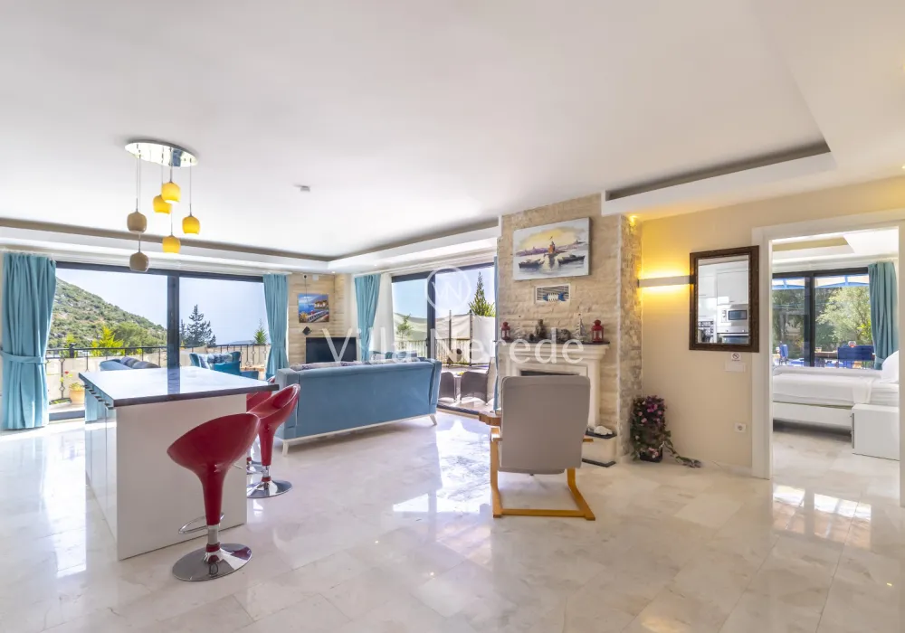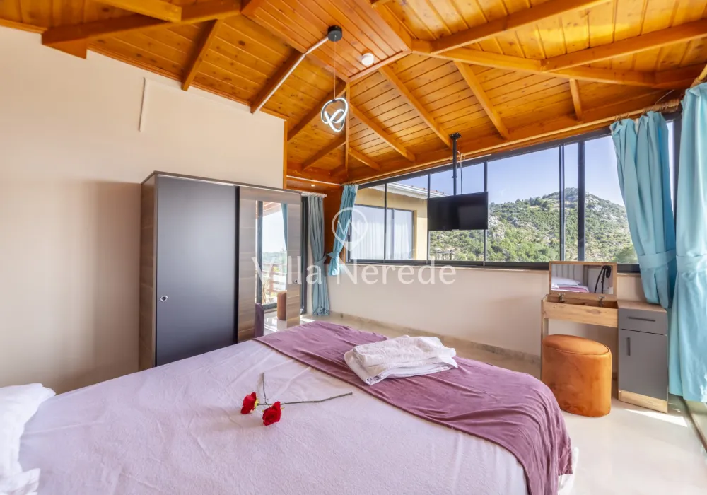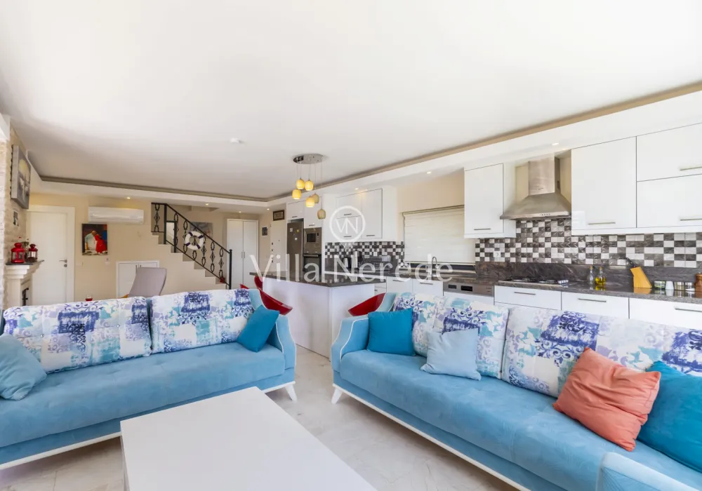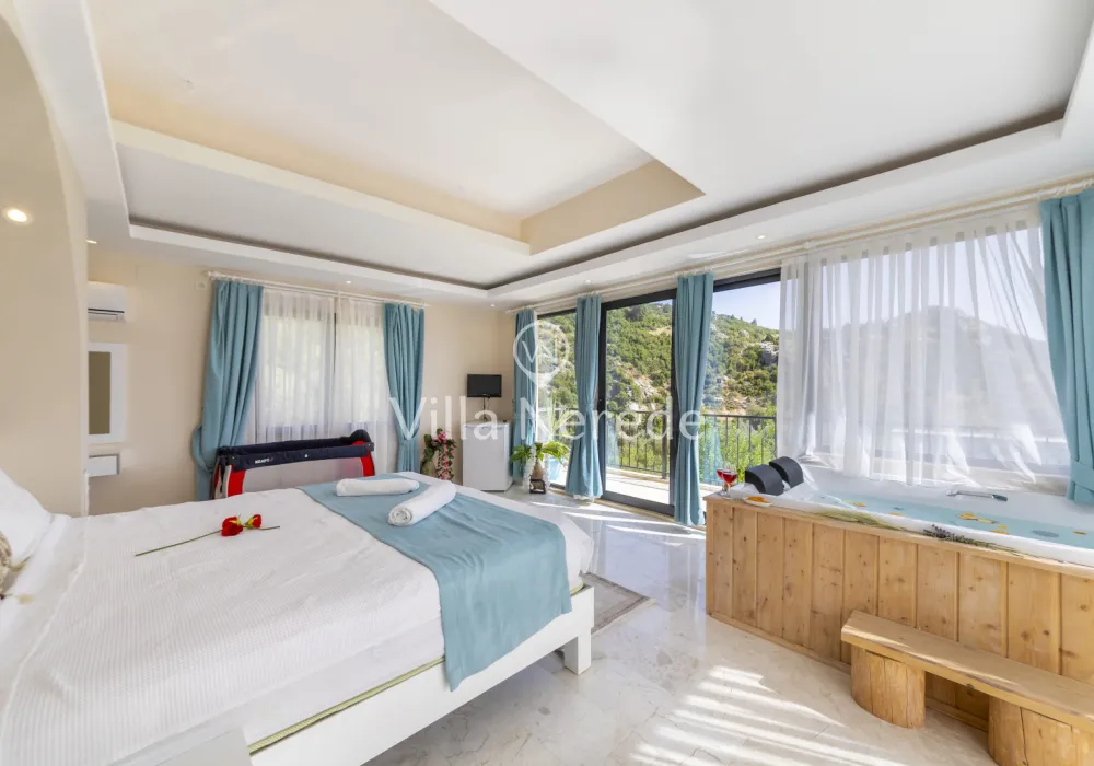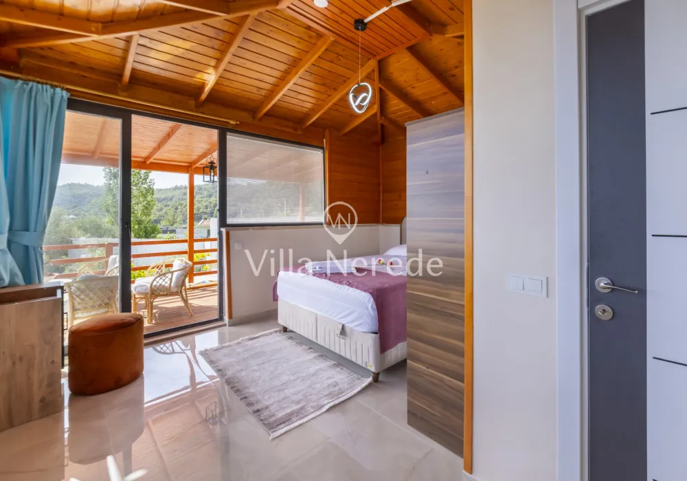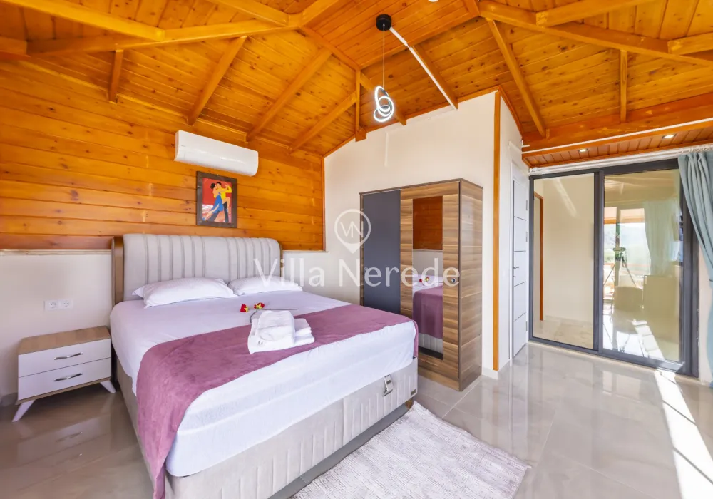 Korunaklı yüzme havuz ve bahçe alanına sahip villada kapasiteye uygun oturma alanı, şezlong takımı,çocuk havuzu,salıncak ve barbekü alanı; havuz terasına açılan konforlu oturma odası, ihtiyaçlarınızı karşılayacak donanıma sahip mutfağı mevcuttur.Özenle dekore edilmiş detayları sizleri memnun edecek, sevdiklerinizle ayrıcalıklı bir tatilin keyfini sürebileceksiniz.Birinci yatak odasında çift kişilik yatak ,ebeveyn banyosu ve jakuzi ; ikinci yatak odasında iki adet tek kişilik yatak ve ebeveyn banyosu; üçüncü yatak odasında ise çift kişilik yatak ve ebeveyn banyosu bulunmaktadır.