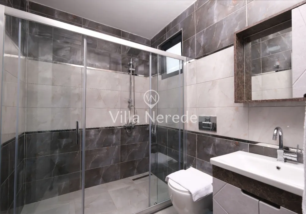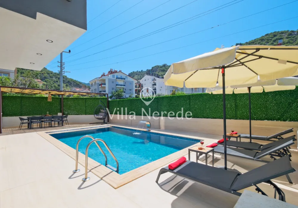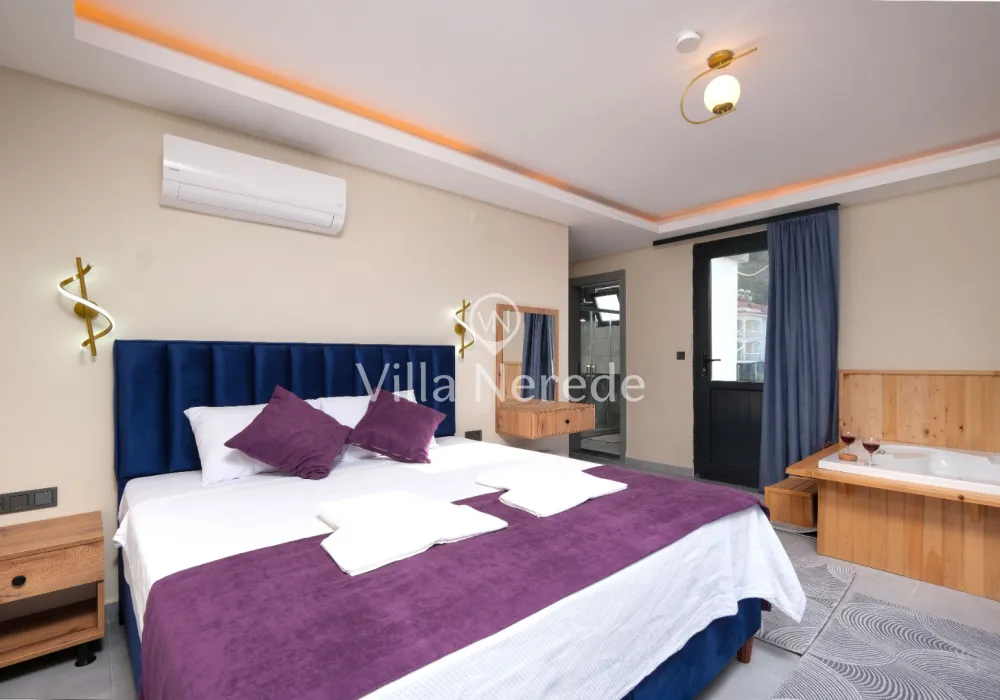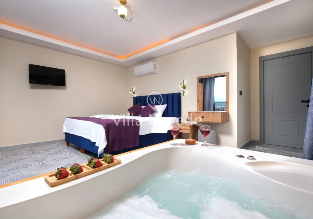 Geniş ve korunaklılığı güçlendirilmiş havuz terasında kapasiteye uygun şezlong takımı, oturma grubu ve barbekü alanı bulunan villanın, yine havuz terasına açılan konforlu oturma odası ve tam donanımlı açık mutfağı; birinci yatak odasında da çift kişilik yatak, ebeveyn banyosu ve jakuzi; ikinci yatak odasında çift kişilik yatak, ebeveyn banyosu,üçüncü yatak odasında ise iki adet tek kişilik yatak ve ebeveyn banyosu bulunmaktadır.