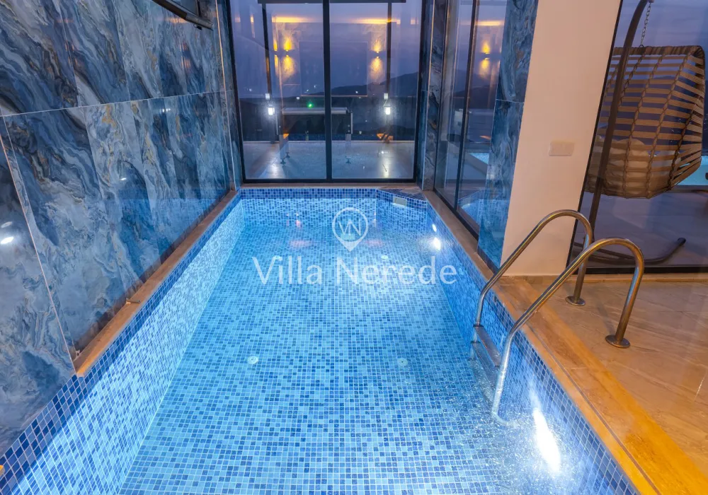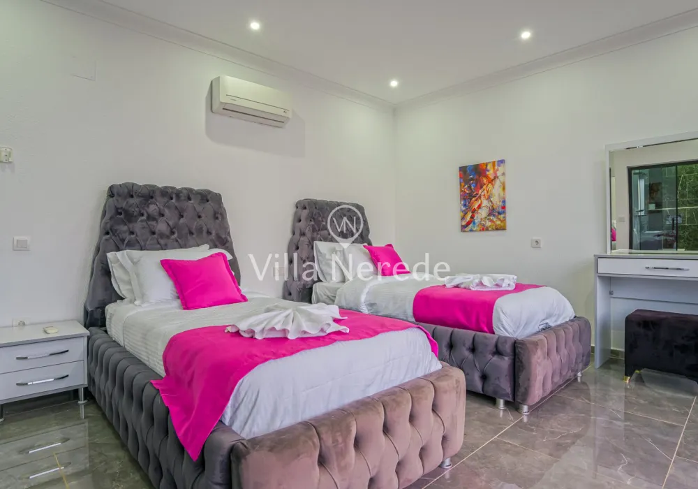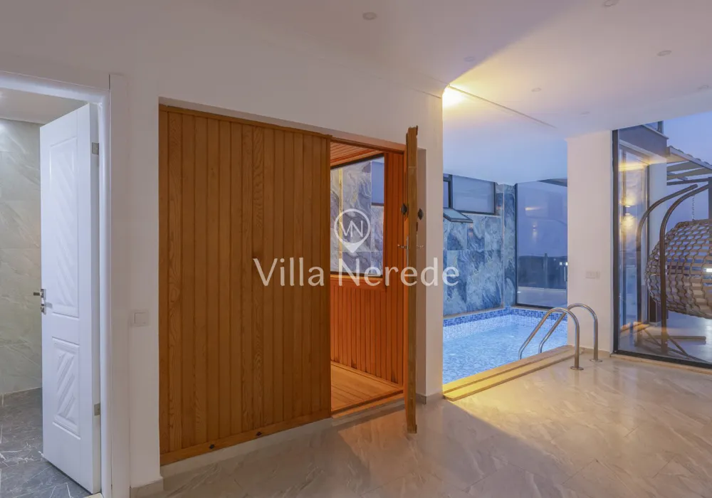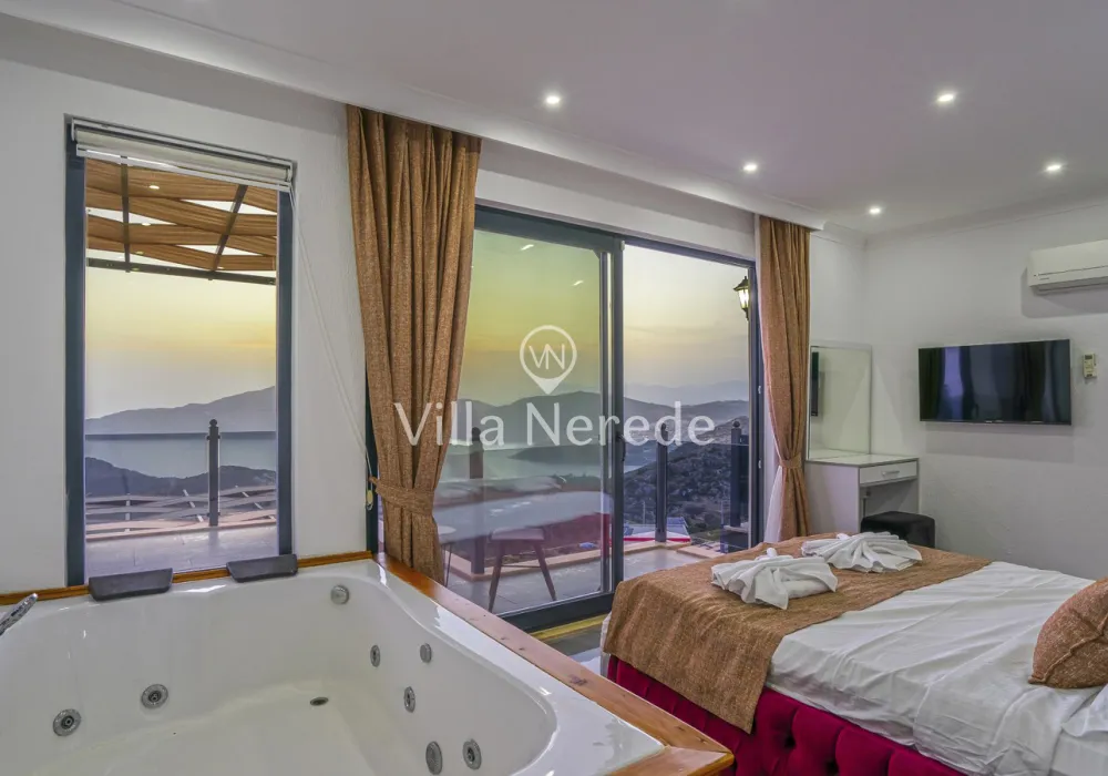 Korunaklı yüzme havuz ve bahçe alanına sahip villada kapasiteye uygun oturma alanı, şezlong takımı, salıncak, masa tenisi ve barbekü alanı; havuz terasına açılan konforlu oturma odası, ihtiyaçlarınızı karşılayacak donanıma sahip mutfağı mevcuttur.Özenle dekore edilmiş detayları sizleri memnun edecek, sevdiklerinizle ayrıcalıklı bir tatilin keyfini sürebileceksiniz.Birinci yatak odasında çift kişilik yatak ,ebeveyn banyosu ve jakuzi ;ikinci yatak odasında ise iki tek kişilik yatak ve ebeveyn banyosu;üçüncü yatak odasında ise çiftk kişilik yatak ve ebeveyn banyosu bulunmaktadır.