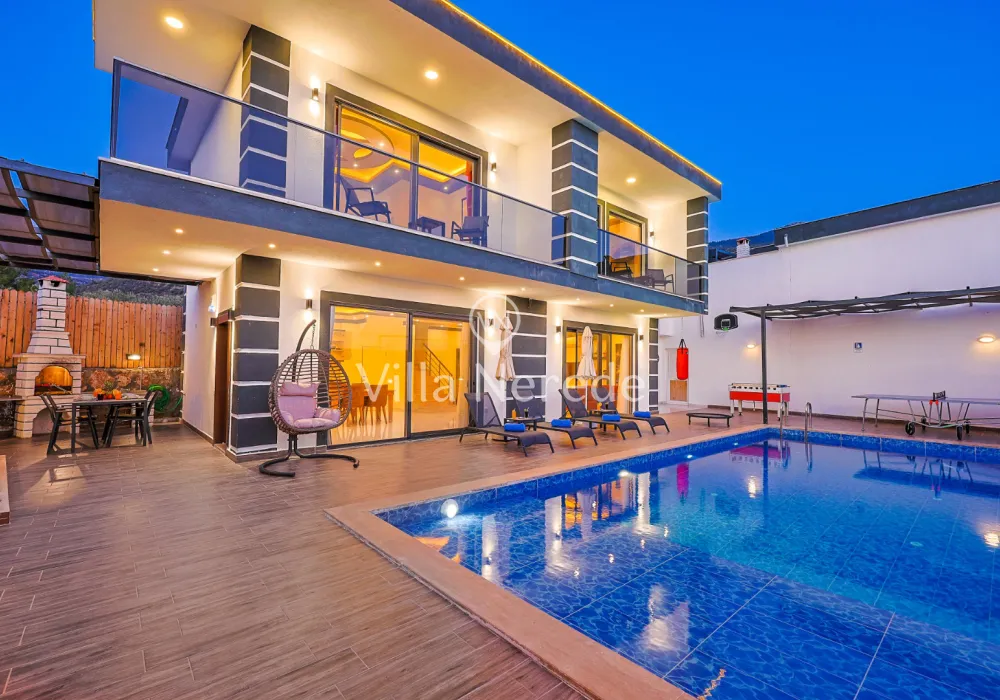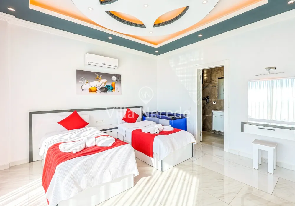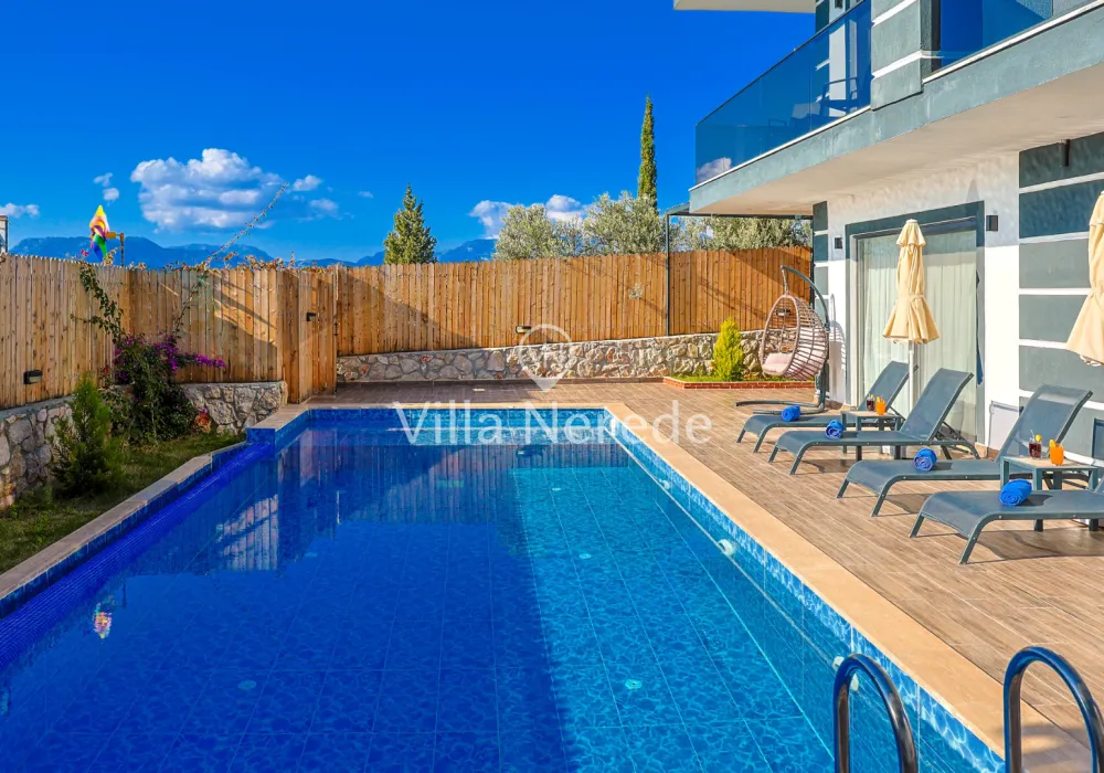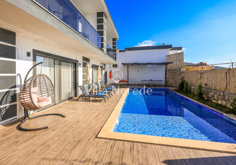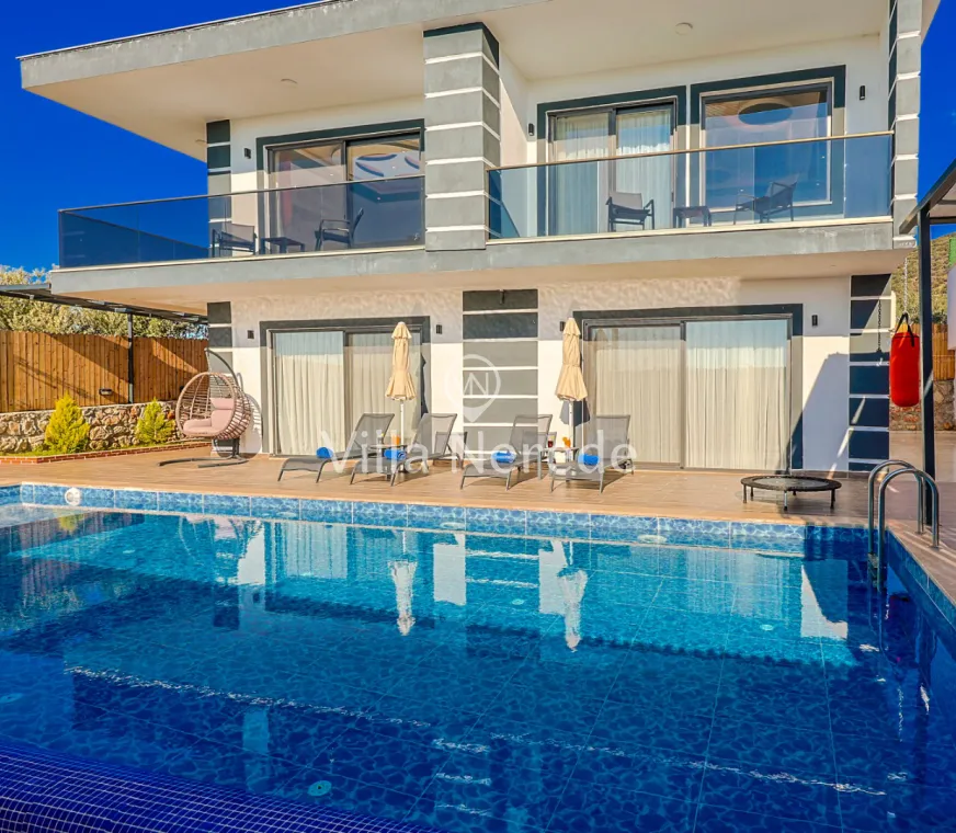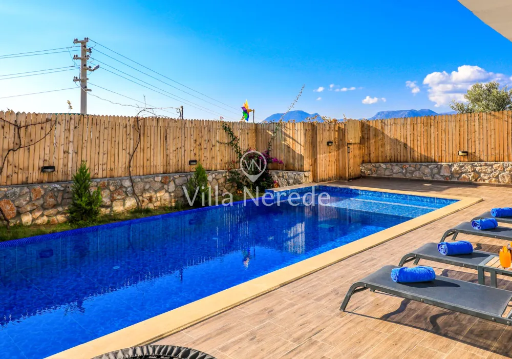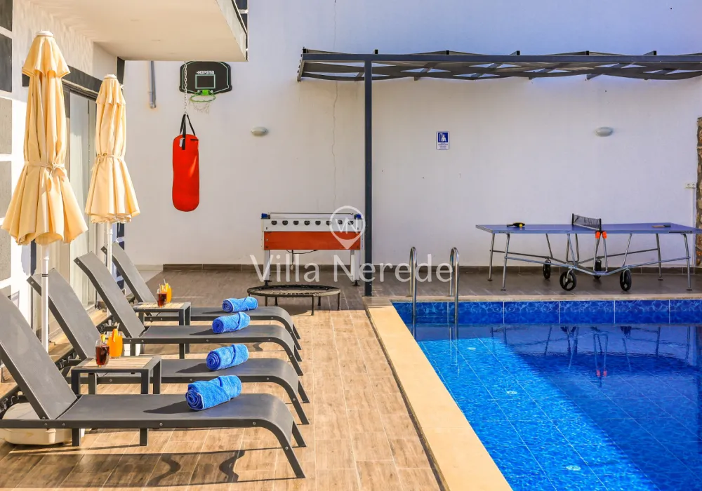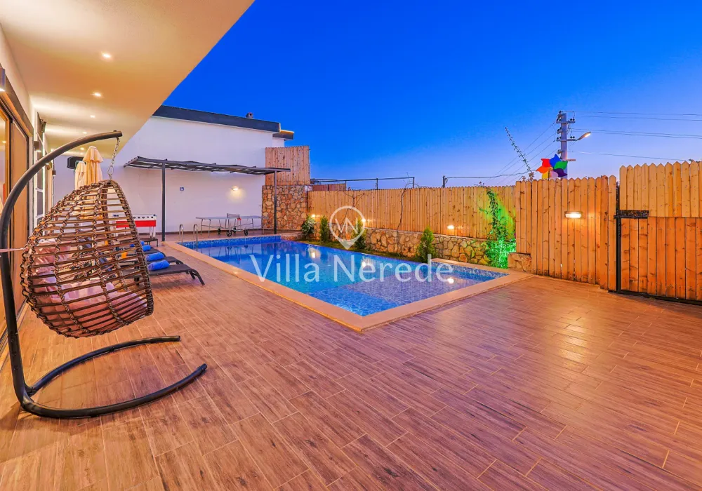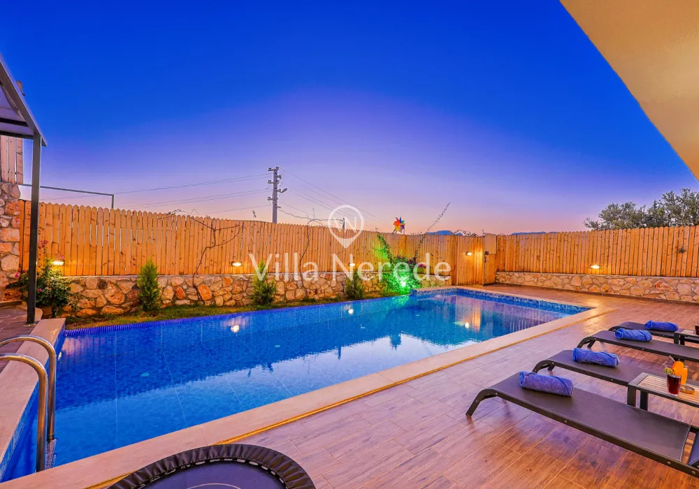 Korunaklı havuz alanına sahip olan villanın, havuz terasında kapasiteye uygun şezlong takımı, barbekü alanı bulunan villanın; yine havuz terasına açılan oturma odası ve tam donanımlı açık mutfağı, bir yatak odasında çift kişilik yatak, ebeveyn banyosu diğer yatak odasında da iki tek kişilik yatak ve ebeveyn banyosu bulunmaktadır. Ayrıca jakuzi bulunan villa, dört mevsim tatil planlarınıza ev sahipliği yapmaya adaydır. İhtiyaçlarınız gözetilerek dizayn edilmiş detaylara sahip ve merkeze kolay ulaşım sağlayan konumuyla misafirlerimizin ilk tercihleri arasında yer almaktadır.