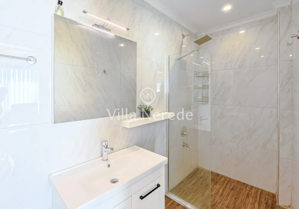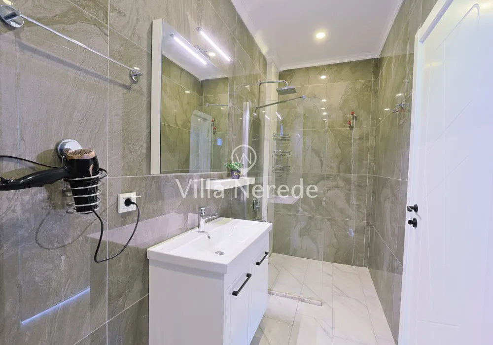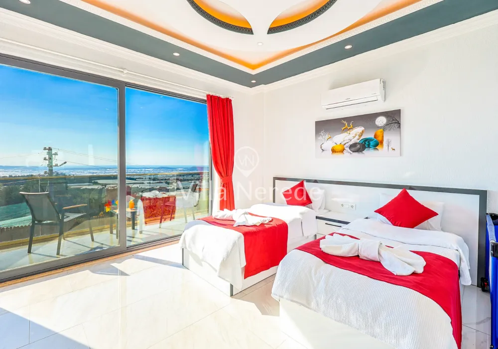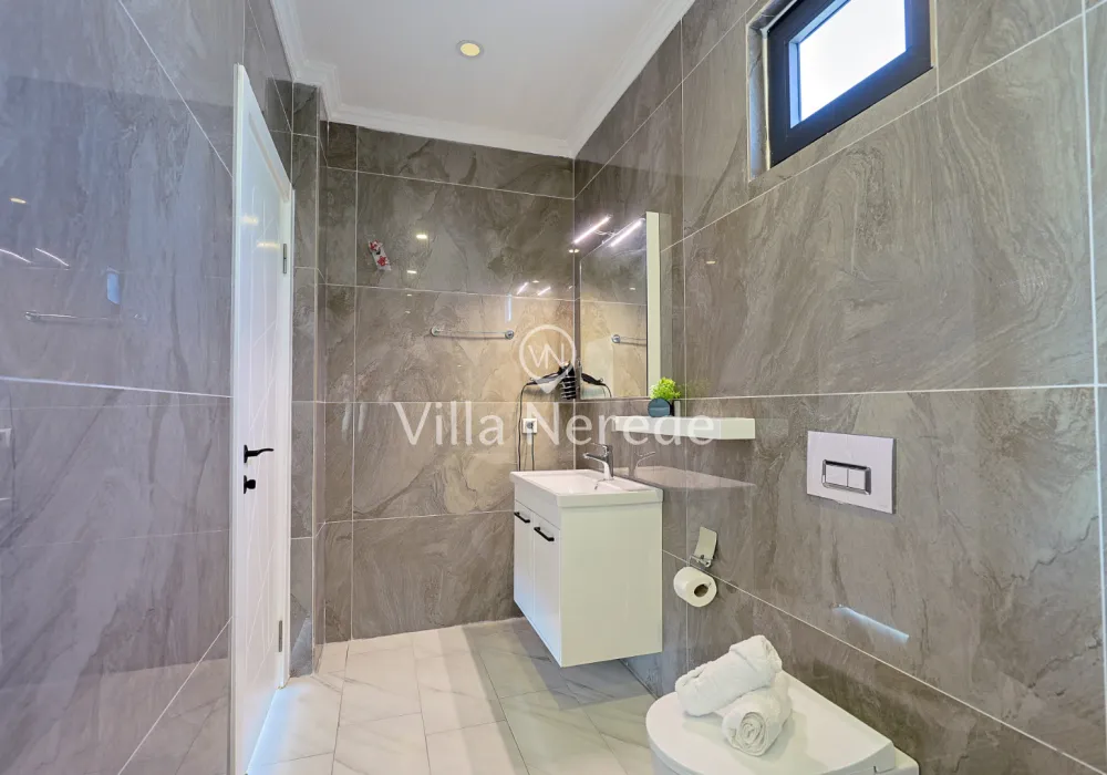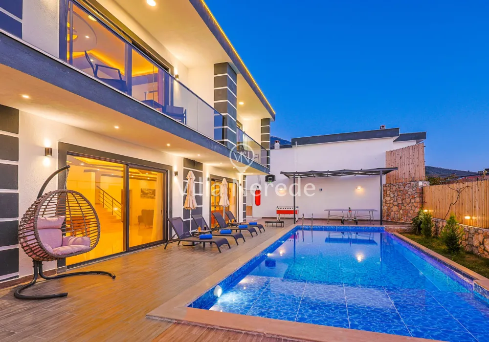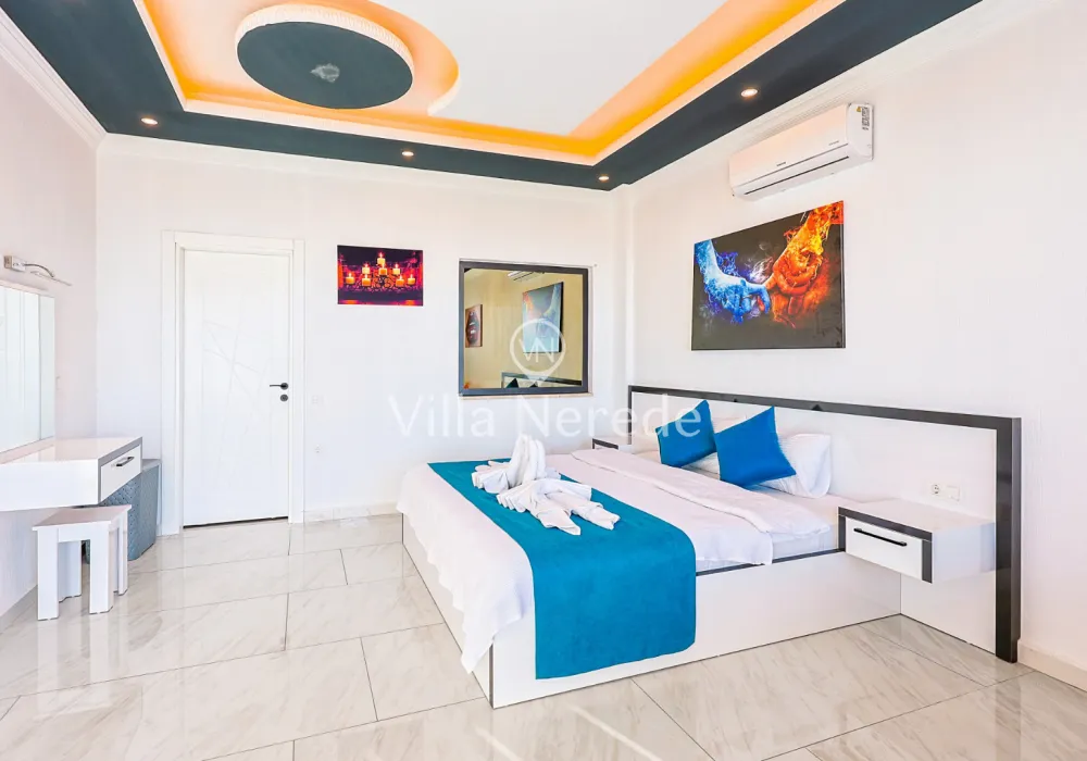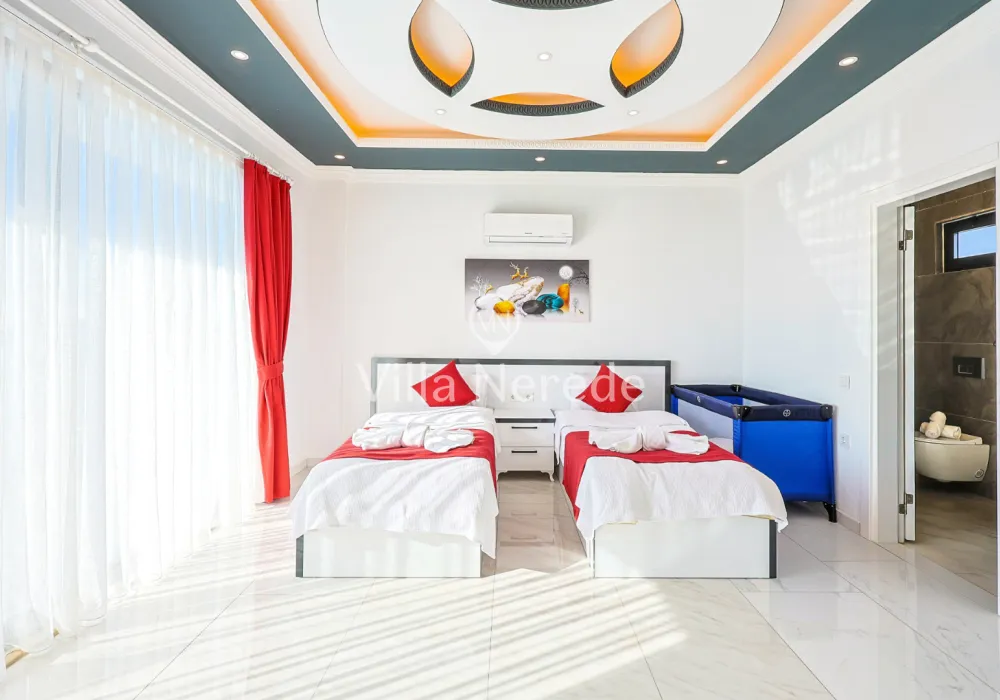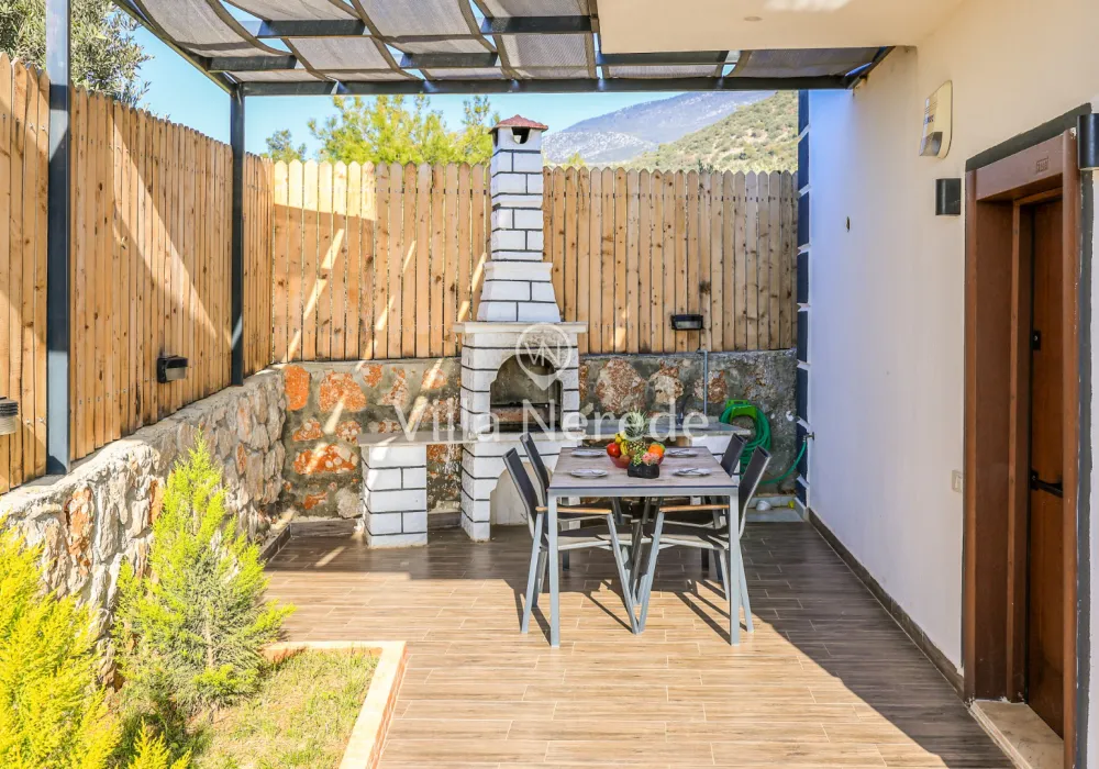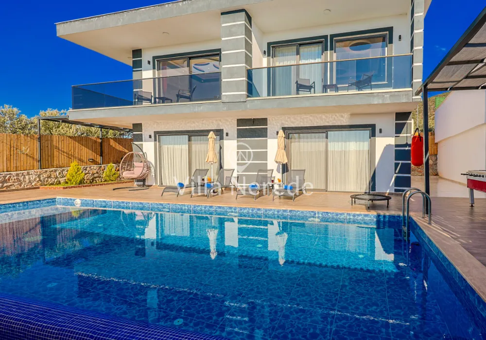 Korunaklı havuz alanına sahip olan villanın, havuz terasında kapasiteye uygun şezlong takımı, barbekü alanı bulunan villanın; yine havuz terasına açılan oturma odası ve tam donanımlı açık mutfağı, bir yatak odasında çift kişilik yatak, ebeveyn banyosu diğer yatak odasında da iki tek kişilik yatak ve ebeveyn banyosu bulunmaktadır. Ayrıca jakuzi bulunan villa, dört mevsim tatil planlarınıza ev sahipliği yapmaya adaydır. İhtiyaçlarınız gözetilerek dizayn edilmiş detaylara sahip ve merkeze kolay ulaşım sağlayan konumuyla misafirlerimizin ilk tercihleri arasında yer almaktadır.