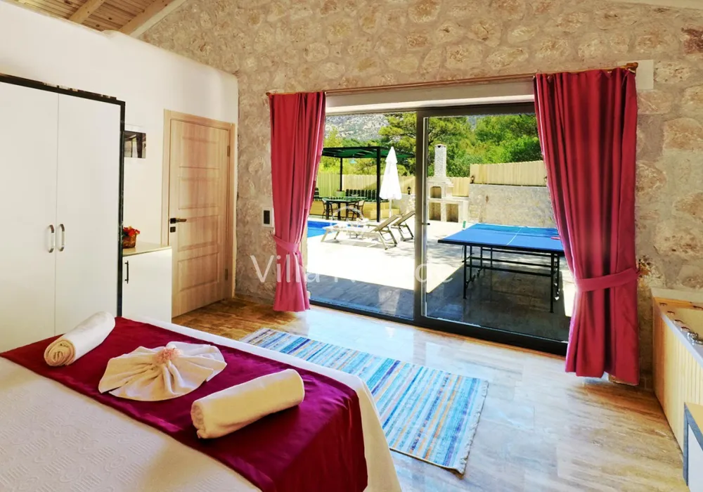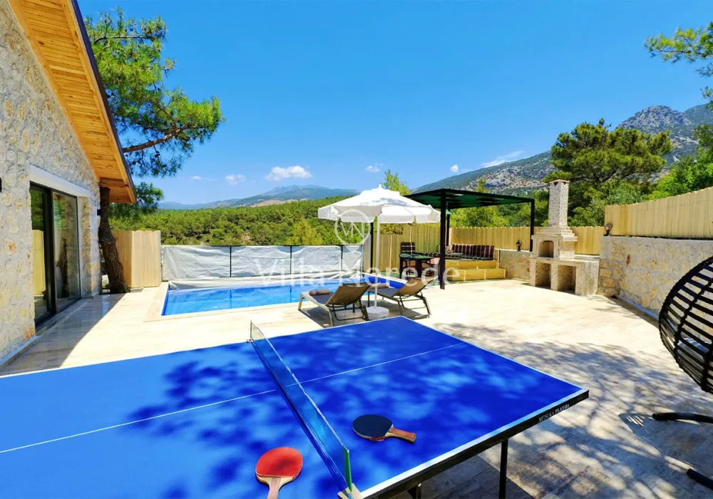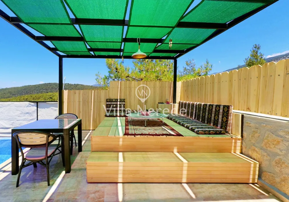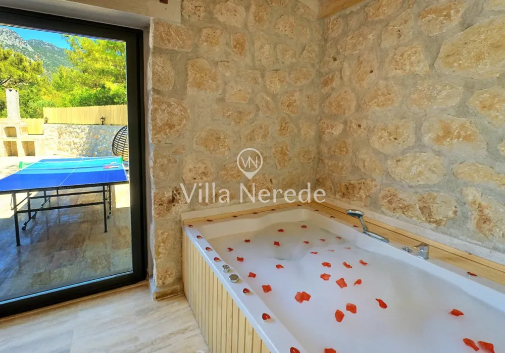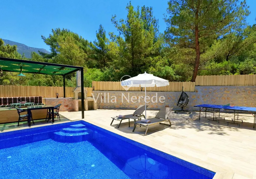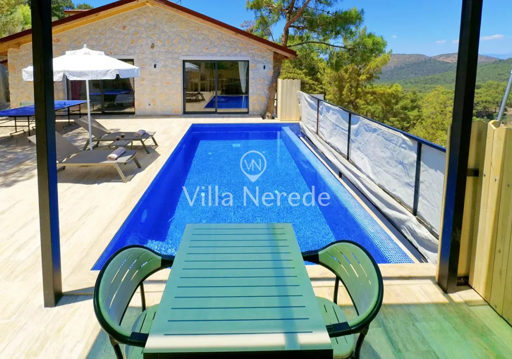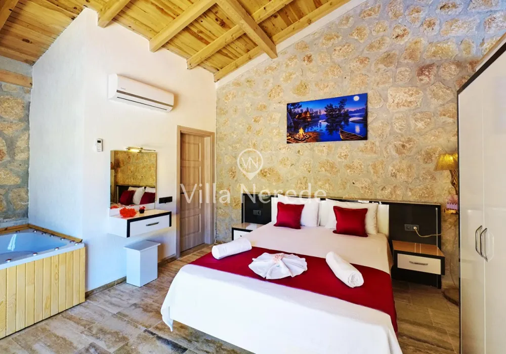 Korunaklı yüzme havuz ve bahçe alanına sahip villada kapasiteye uygun oturma alanı, şezlong takımı, salıncak ve barbekü alanı; havuz terasına açılan konforlu oturma odası, ihtiyaçlarınızı karşılayacak donanıma sahip mutfağı mevcuttur.Özenle dekore edilmiş detayları sizleri memnun edecek, sevdiklerinizle ayrıcalıklı bir tatilin keyfini sürebileceksiniz.Yatak odasında çift kişilik yatak ,ebeveyn banyosu ve jakuzi bulunmaktadır.
