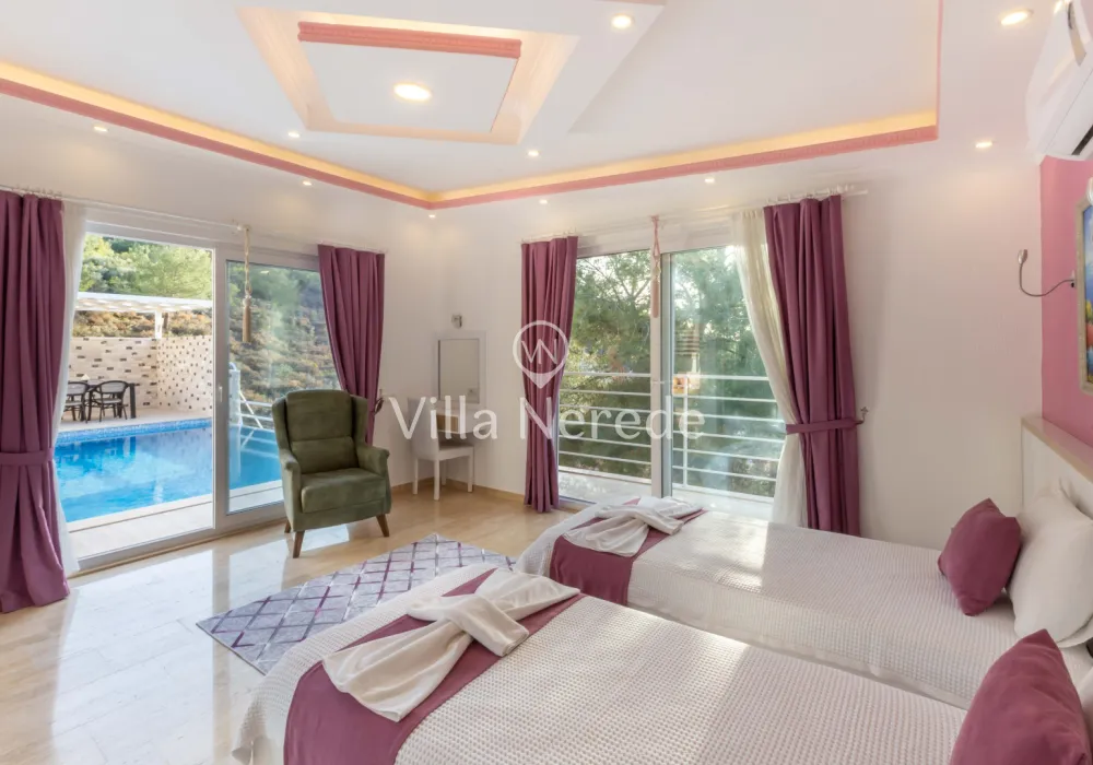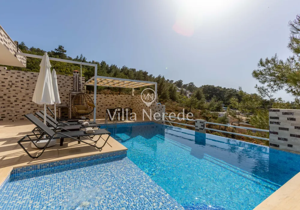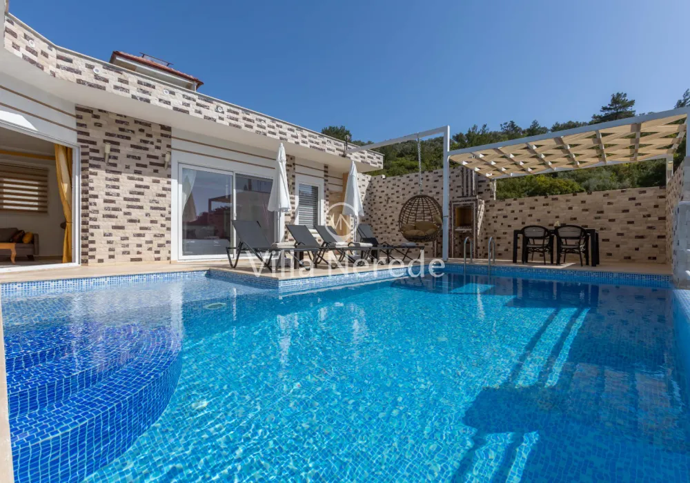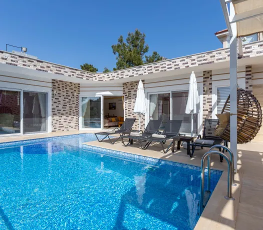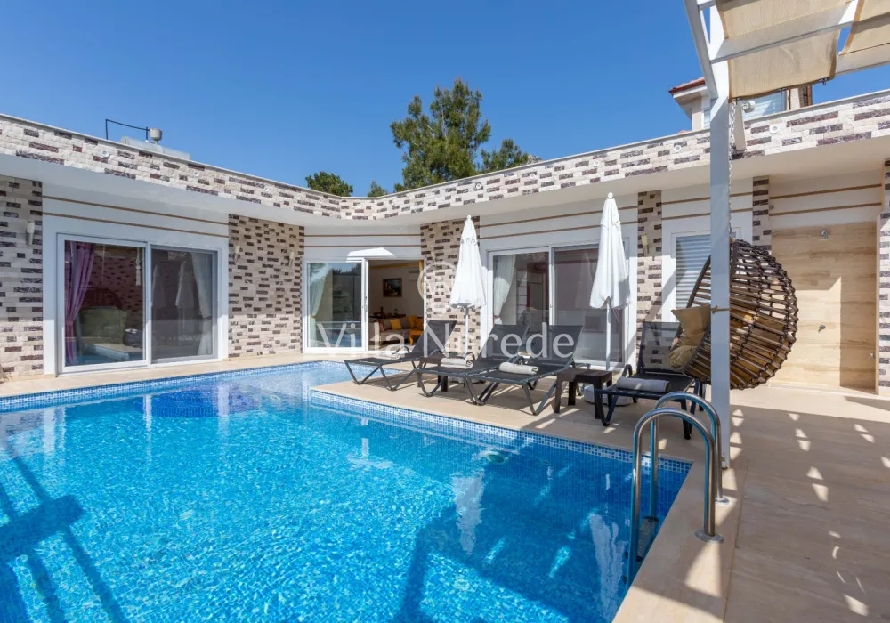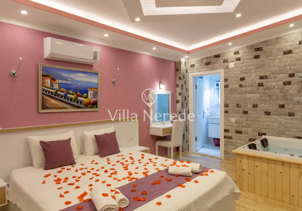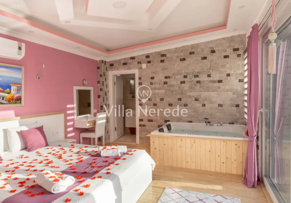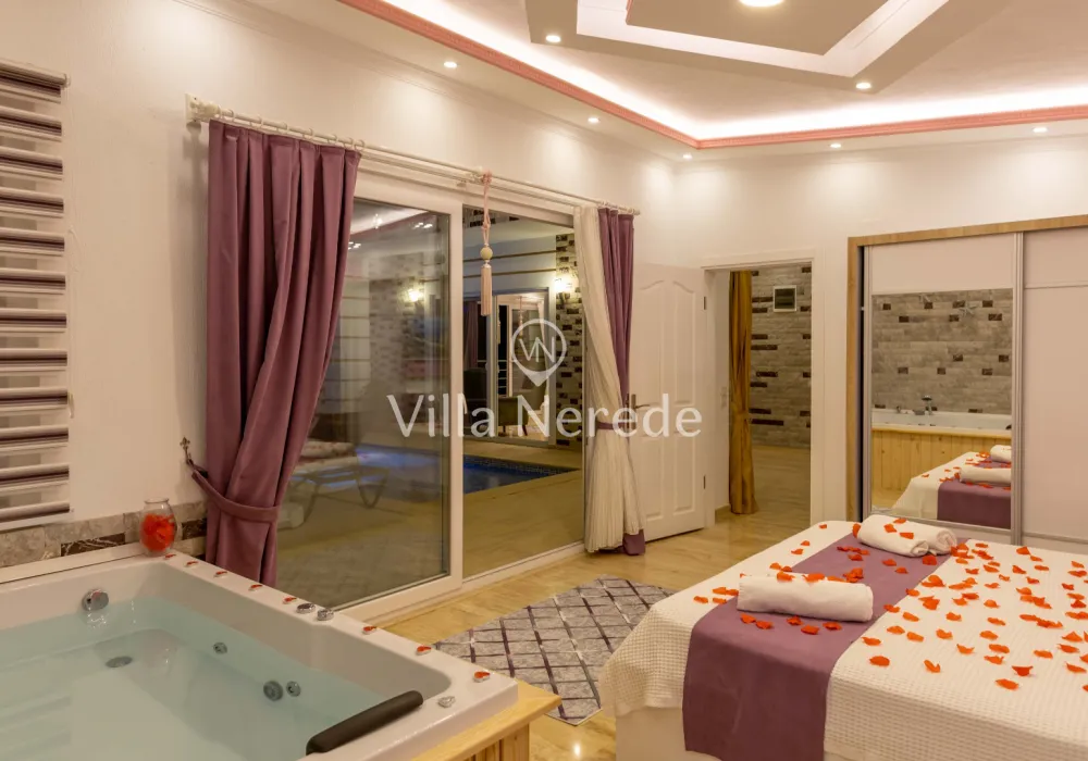 Korunaklı yüzme havuz ve bahçe alanına sahip villada kapasiteye uygun oturma alanı, şezlong takımı, salıncak ve barbekü alanı; havuz terasına açılan konforlu oturma odası, ihtiyaçlarınızı karşılayacak donanıma sahip mutfağı mevcuttur.Özenle dekore edilmiş detayları sizleri memnun edecek, sevdiklerinizle ayrıcalıklı bir tatilin keyfini sürebileceksiniz.Birinci yatak odasında çift kişilik yatak ,ebeveyn banyosu ve jakuzi ;ikinci yatak odasında ise iki tek kişilik yatak ve ebeveyn banyosu bulunmaktadır.