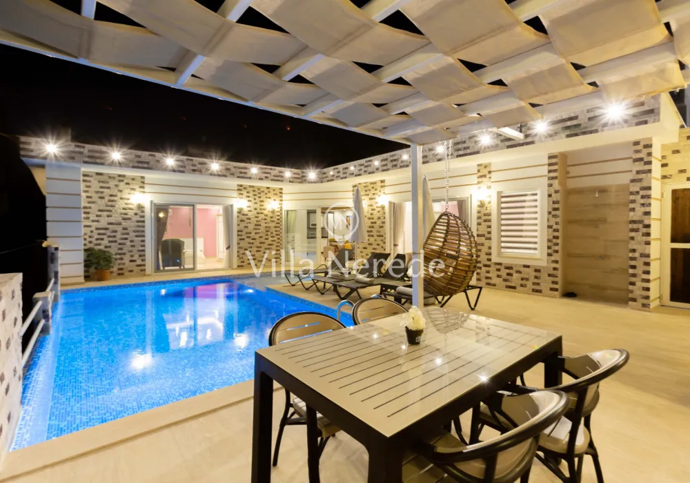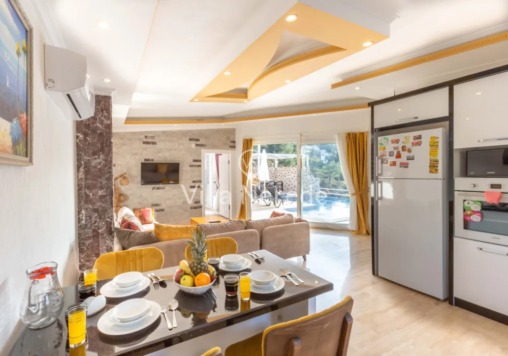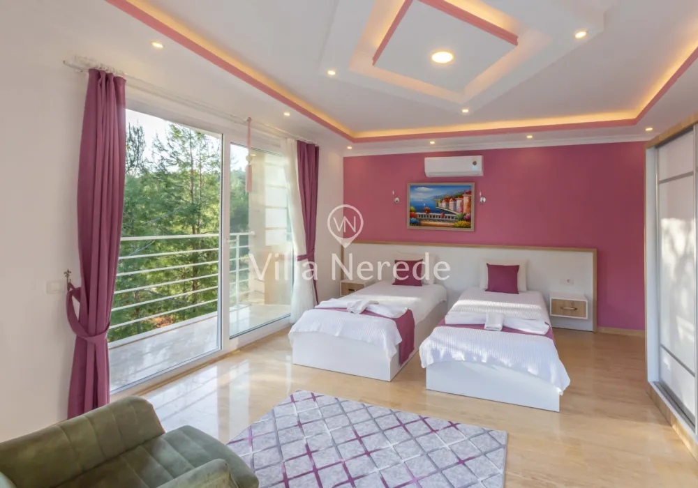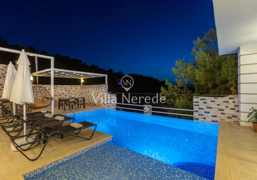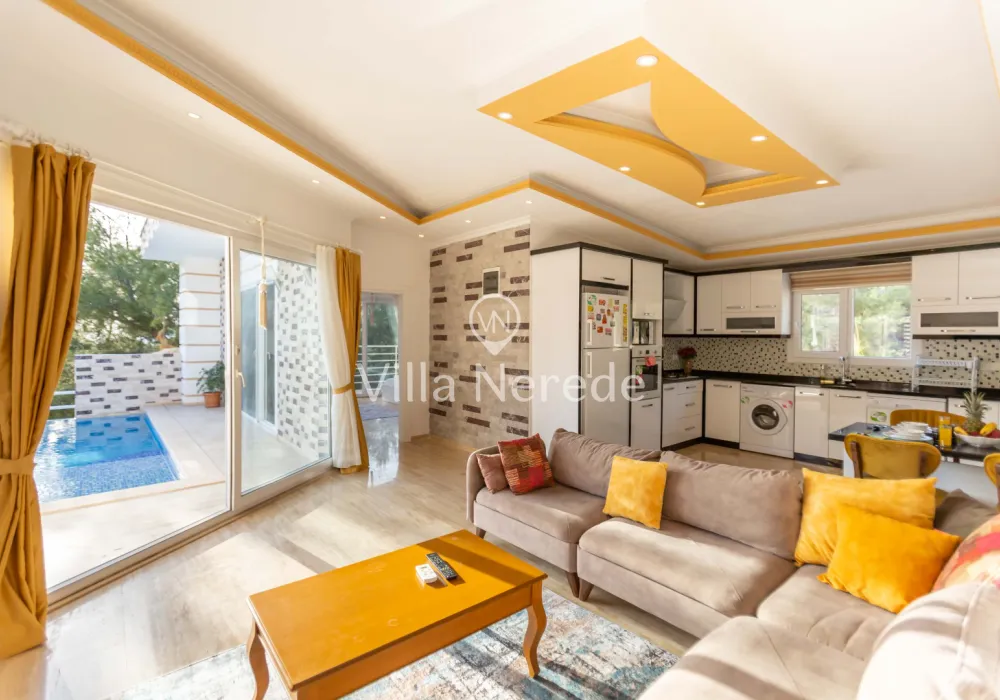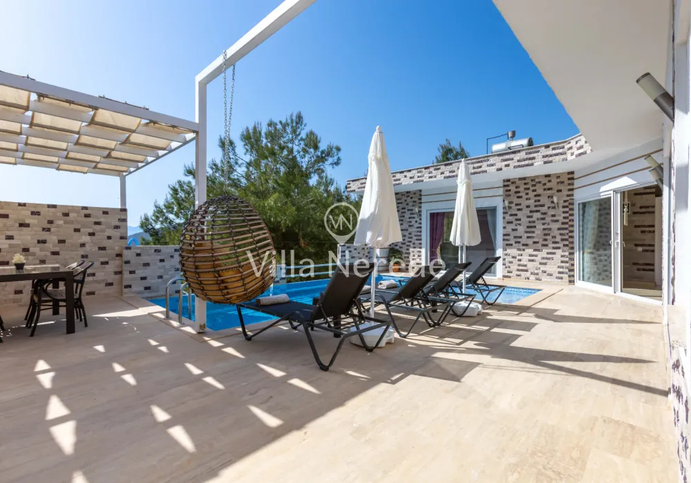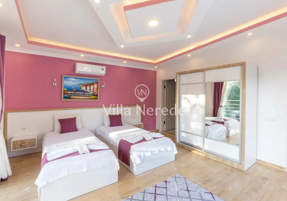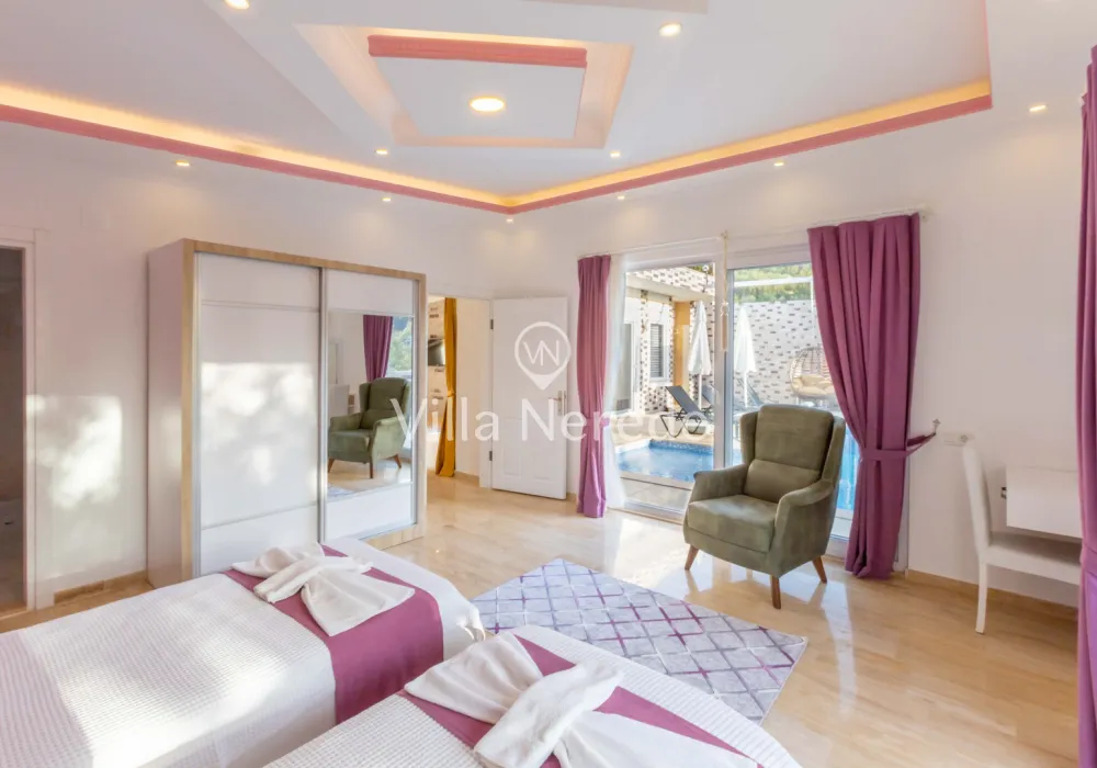 Korunaklı yüzme havuz ve bahçe alanına sahip villada kapasiteye uygun oturma alanı, şezlong takımı, salıncak ve barbekü alanı; havuz terasına açılan konforlu oturma odası, ihtiyaçlarınızı karşılayacak donanıma sahip mutfağı mevcuttur.Özenle dekore edilmiş detayları sizleri memnun edecek, sevdiklerinizle ayrıcalıklı bir tatilin keyfini sürebileceksiniz.Birinci yatak odasında çift kişilik yatak ,ebeveyn banyosu ve jakuzi ;ikinci yatak odasında ise iki tek kişilik yatak ve ebeveyn banyosu bulunmaktadır.