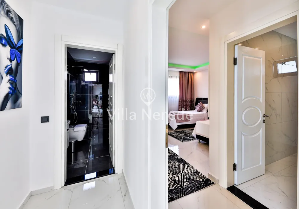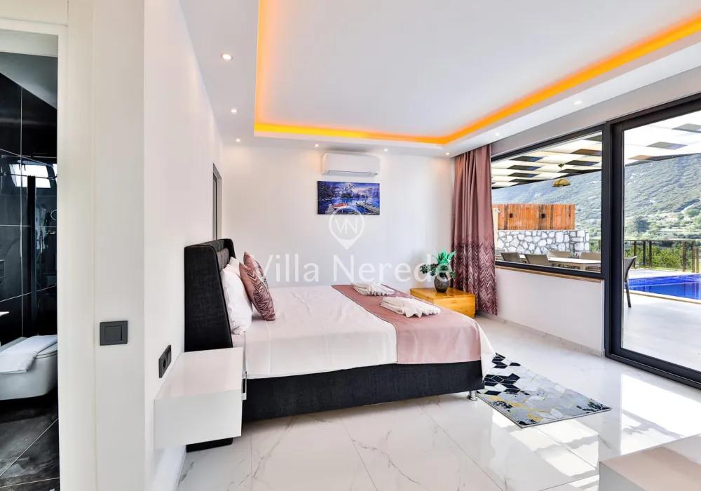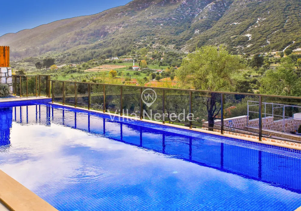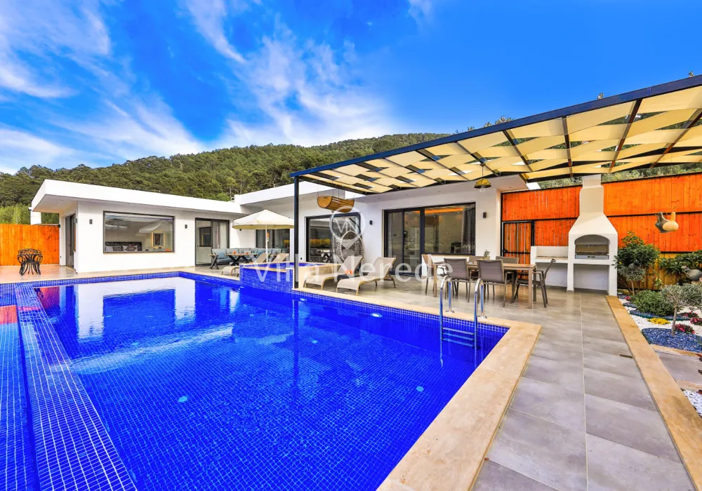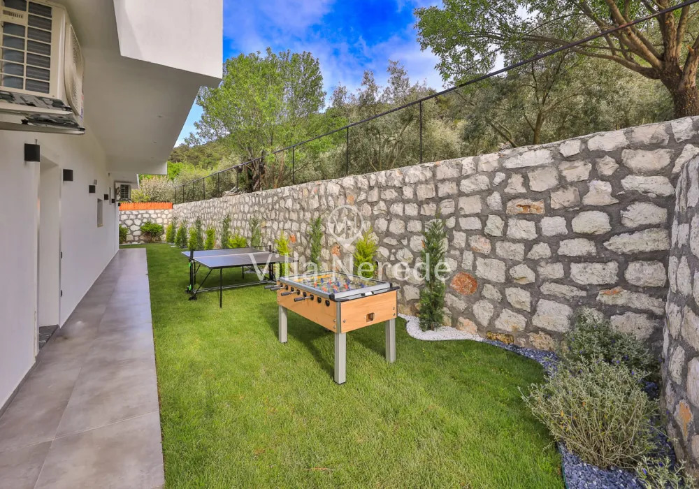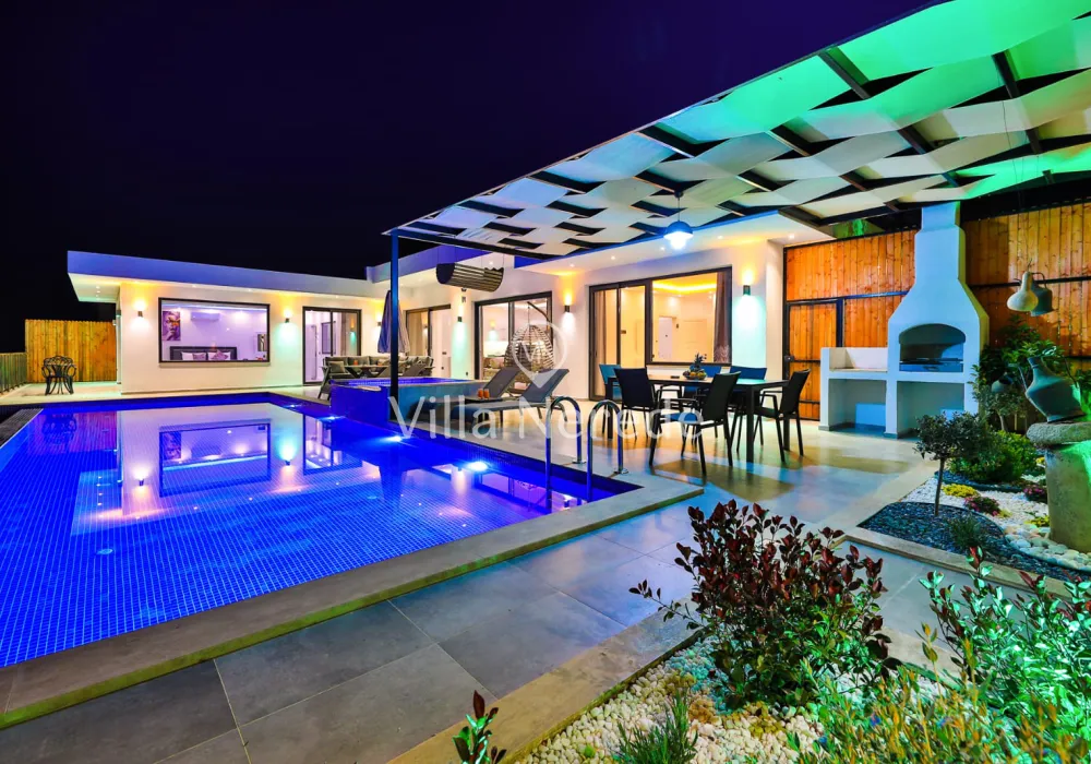 Korunaklı yüzme havuz ve bahçe alanına sahip villada kapasiteye uygun oturma alanı, şezlong takımı, çocuk havuzu,salıncak ve barbekü alanı; havuz terasına açılan konforlu oturma odası, ihtiyaçlarınızı karşılayacak donanıma sahip mutfağı mevcuttur.Özenle dekore edilmiş detayları sizleri memnun edecek, sevdiklerinizle ayrıcalıklı bir tatilin keyfini sürebileceksiniz.Birinci yatak odasında çift kişilik yatak ,ebeveyn banyosu ve jakuzi ; ikinci yatak odasında ise çift kişilik yatak ve ebeveyn banyosu ; üçüncü yatak odasında ise iki adet tek kişilik yatak ve ebeveyn banyosu bulunmaktadır.